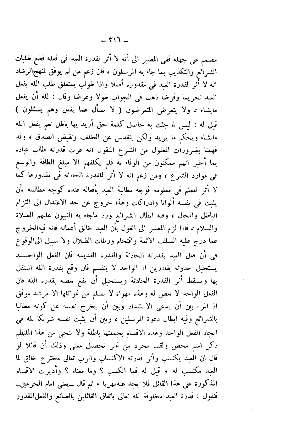 مُصَمِّمٌ عَلَى جَهْلِهِ، فَفِي الْمَصِيرِ إِلَى أَنَّهُ لَا أَثَرَ لِقُدْرَةِ الْعَبْدِ فِي فِعْلِهِ قَطْعُ طَلَبَاتِ الشَّرَائِعِ، وَالتَّكْذِيبُ بِمَا جَاءَ بِهِ الْمُرْسَلُونَ، فَإِنْ زَعَمَ مَنْ لَمْ يُوَفَّقْ لِمَنْهَجِ الرَّشَادِ أَنَّهُ لَا أَثَرَ لِقُدْرَةِ الْعَبْدِ فِي مَقْدُورِهِ أَصْلًا. وَإِذَا طُولِبَ بِمُتَعَلِّقِ طَلَبِ اللَّهِ بِفِعْلِ الْعَبْدِ تَحْرِيمًا وَفَرْضًا؛ ذَهَبَ فِي الْجَوَابِ طُولًا وَعَرْضًا، وَقَالَ: لِلَّهِ أَنْ يَفْعَلَ مَا يَشَاءُ، وَلَا يَتَعَرَّضُ الْمُتَعَرِّضُونَ {لَا يُسْأَلُ عَمَّا يَفْعَلُ وَهُمْ يُسْأَلُونَ} [الأنبياء: 23] قِيلَ لَهُ: لَيْسَ لِمَا جِئْتَ بِهِ حَاصِلٌ، كَلِمَةُ حَقٍّ أُرِيدَ بِهَا بَاطِلٌ، نَعَمْ، يَفْعَلُ اللَّهُ مَا يَشَاءُ وَيَحْكُمُ مَا يُرِيدُ، وَلَكِنْ يَتَقَدَّسُ عَنِ الْخُلْفِ وَنَقِيضِ الصِّدْقِ، وَقَدْ فَهِمْنَا بِضَرُورَاتِ الْمَعْقُولِ مِنَ الشَّرْعِ الْمَنْقُولِ أَنَّهُ - عَزَّتْ قُدْرَتُهُ - طَالَبَ عِبَادَهُ بِمَا أَخْبَرَ أَنَّهُمْ مُمَكَّنُونَ مِنَ الْوَفَاءِ بِهِ، فَلَمْ يُكَلِّفْهُمْ إِلَّا مَبْلَغَ الطَّاقَةِ، وَالْوُسْعَ فِي مَوَارِدِ الشَّرْعِ، وَمَنْ زَعَمَ أَنَّهُ لَا أَثَرَ لِلْقُدْرَةِ الْحَادِثَةِ فِي مَقْدُورِهَا كَمَا لَا أَثَرَ لِلْعَلَمِ فِي مَعْلُومِهِ؛ فَوَجْهُ مُطَالَبَةِ الْعَبْدِ بِأَفْعَالِهِ عِنْدَهُ كَوَجْهِ مُطَالَبَتِهِ بِأَنْ يُثْبِتَ فِي نَفْسِهِ أَلْوَانًا وَإِدْرَاكَاتٍ، وَهَذَا خُرُوجٌ عَنْ حَدِّ الِاعْتِدَالِ إِلَى الْتِزَامِ الْبَاطِلِ وَالْمُحَالِ، وَفِيهِ إِبْطَالُ الشَّرَائِعِ وَرَدُّ مَا جَاءَ بِهِ النَّبِيُّونَ - عَلَيْهِمُ الصَّلَاةُ وَالسَّلَامُ، فَإِذَا لَزِمَ الْمَصِيرُ إِلَى الْقَوْلِ بِأَنَّ الْعَبْدَ خَالِقُ أَعْمَالِهِ؛ فَإِنَّهُ فِيهِ الْخُرُوجُ عَمَّا دَرَجَ عَلَيْهِ السَّلَفُ الْأَئِمَّةُ، وَاقْتِحَامُ وَرَطَاتِ الضَّلَالِ. وَلَا سَبِيلَ إِلَى الْوُقُوعِ فِي أَنَّ فِعْلَ الْعَبْدِ بِقُدْرَتِهِ الْحَادِثَةِ وَالْقُدْرَةِ الْقَدِيمَةِ. فَإِنَّ الْفِعْلَ الْوَاحِدَ يَسْتَحِيلُ حُدُوثُهُ بِقَادِرَيْنِ، إِذِ الْوَاحِدُ لَا يَنْقَسِمُ، فَإِنْ وَقَعَ بِقُدْرَةِ اللَّهِ اسْتَقَلَّ بِهَا، وَيَسْقُطُ أَثَرُ الْقُدْرَةِ الْحَادِثَةِ، وَيَسْتَحِيلُ أَنْ يَقَعَ بَعْضُهُ بِقُدْرَةِ اللَّهِ، فَإِنَّ الْفِعْلَ الْوَاحِدَ لَا بَعْضَ لَهُ، وَهَذِهِ مِهْوَاةٌ لَا يَسْلَمُ مِنْ غَوَائِلِهَا إِلَّا مُرْشَدٌ مُوَفَّقٌ، إِذِ الْمَرْءُ بَيْنَ أَنْ يَدَّعِيَ الِاسْتِبْدَادَ، وَبَيْنَ أَنْ يُخْرِجَ نَفْسَهُ عَنْ كَوْنِهِ مُطَالَبًا بِالشَّرَائِعِ، وَفِيهِ إِبْطَالُ دَعْوَةِ الْمُرْسَلِينَ، وَبَيْنَ أَنْ يُثْبِتَ نَفْسَهُ شَرِيكًا لِلَّهِ فِي إِيجَادِ الْفِعْلِ الْوَاحِدِ، وَهَذِهِ الْأَقْسَامُ بِجُمْلَتِهَا بَاطِلَةٌ وَلَا يُنْجِي مِنْ هَذَا الْمُلْتَطَمِ ذِكْرُ اسْمٍ مَحْضٍ وَلَقَبٍ مُجَرَّدٍ مِنْ غَيْرِ تَحْصِيلِ مَعْنًى، وَذَلِكَ أَنَّ قَائِلًا لَوْ قَالَ: إِنَّ الْعَبْدَ يَكْتَسِبُ، وَأَثَرُ قُدْرَتِهِ الِاكْتِسَابُ، وَالرَّبُّ - تَعَالَى - مُخْتَرِعٌ خَالِقٌ لِمَا الْعَبْدُ مُكْتَسِبٌ لَهُ؛ قِيلَ لَهُ: فَمَا الْكَسْبُ؟ وَمَا مَعْنَاهُ؟ وَأُدِيرَتِ الْأَقْسَامُ الْمَذْكُورَةُ عَلَى هَذَا الْقَائِلِ، فَلَا يَجِدُ عَنْهُ مَهْرَبًا. ثُمَّ قَالَ - يَعْنِي إِمَامَ الْحَرَمَيْنِ - فَنَقُولُ: قُدْرَةُ الْعَبْدِ مَخْلُوقَةٌ لِلَّهِ - تَعَالَى - بِاتِّفَاقِ الْقَائِلِينَ بِالصَّانِعِ، وَالْفِعْلُ الْمَقْدُورُ
