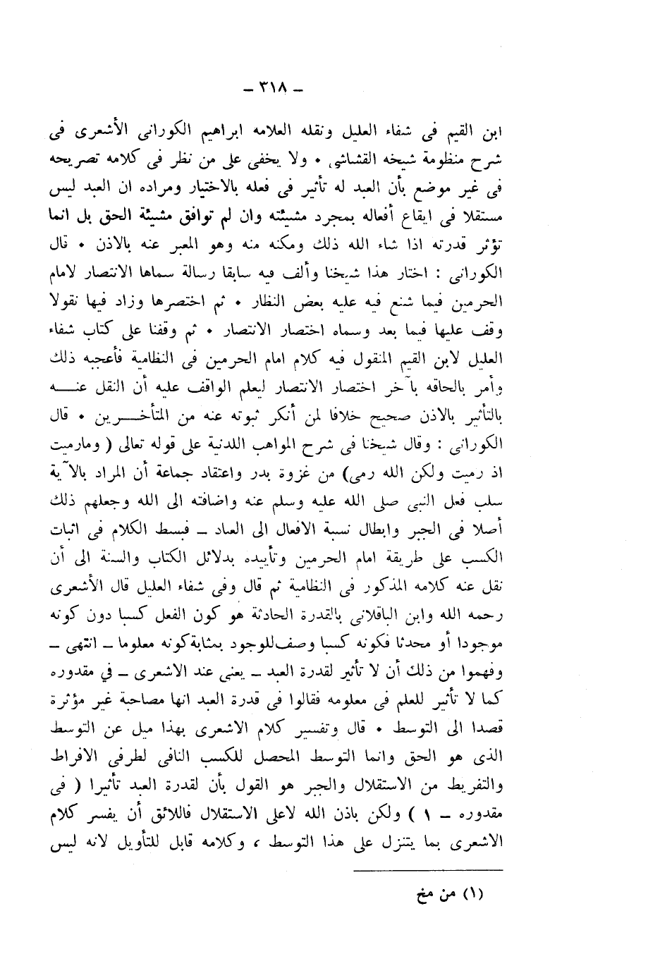 ثُمَّ وَقَفْنَا عَلَى كِتَابِ شِفَاءِ الْعَلِيلِ لِابْنِ الْقَيِّمِ الْمَنْقُولِ فِيهِ كَلَامُ إِمَامِ الْحَرَمَيْنِ فِي النِّظَامِيَّةِ فَأَعْجَبَهُ ذَلِكَ، وَأَمَرَ بِإِلْحَاقِهِ بِآخِرِ اخْتِصَارِ الِانْتِصَارِ ; لِيَعْلَمَ الْوَاقِفُ عَلَيْهِ أَنَّ النَّقْلَ عَنْهُ بِالتَّأْثِيرِ بِالْإِذْنِ صَحِيحٌ، خِلَافًا لِمَنْ أَنْكَرَ ثُبُوتَهُ عَنْهُ مِنَ الْمُتَأَخِّرِينَ. قَالَ الْكُورَانِيُّ: وَقَالَ شَيْخُنَا فِي شَرْحِ الْمَوَاهِبِ اللَّدُنِّيَّةِ عَلَى قَوْلِهِ - تَعَالَى - {وَمَا رَمَيْتَ إِذْ رَمَيْتَ وَلَكِنَّ اللَّهَ رَمَى} [الأنفال: 17] مِنْ غَزْوَةِ بَدْرٍ: وَاعْتِقَادُ جَمَاعَةٍ أَنَّ الْمُرَادَ بِالْآيَةِ سَلْبُ فِعْلِ النَّبِيِّ - صَلَّى اللَّهُ عَلَيْهِ وَسَلَّمَ - عَنْهُ وَإِضَافَتُهُ إِلَى اللَّهِ، وَجَعْلُهُمْ ذَلِكَ أَصْلًا فِي الْجَبْرِ، وَإِبْطَالُ نِسْبَةِ الْأَفْعَالِ إِلَى الْعِبَادِ. فَبَسَطَ الْكَلَامَ فِي إِثْبَاتِ الْكَسْبِ عَلَى طَرِيقَةِ إِمَامِ الْحَرَمَيْنِ، وَتَأْيِيدِهِ بِدَلَائِلِ الْكِتَابِ وَالسُّنَّةِ إِلَى أَنْ نَقَلَ عَنْهُ كَلَامَهُ الْمَذْكُورَ فِي النِّظَامِيَّةِ. ثُمَّ قَالَ: وَفِي شِفَاءِ الْعَلِيلِ: قَالَ الْأَشْعَرِيُّ - رَحِمَهُ اللَّهُ - وَابْنُ الْبَاقِلَّانِيِّ بِالْقُدْرَةِ الْحَادِثَةِ، هُوَ كَوْنُ الْفِعْلِ كَسْبًا دُونَ كَوْنِهِ مَوْجُودًا، أَوْ مُحْدَثًا، فَكَوْنُهُ كَسْبًا وَصْفٌ لِلْوُجُودِ بِمَثَابَةِ كَوْنِهِ مَعْلُومًا - انْتَهَى - وَفَهِمُوا مِنْ ذَلِكَ أَنْ لَا تَأْثِيرَ لِقُدْرَةِ الْعَبْدِ - يَعْنِي الْأَشْعَرِيَّ - فِي مَقْدُورِهِ كَمَا لَا تَأْثِيرَ لِلْعِلْمِ فِي مَعْلُومِهِ، فَقَالُوا فِي قُدْرَةِ الْعَبْدِ: إِنَّهَا مُصَاحِبَةٌ غَيْرُ مُؤَثِّرَةٍ قَصْدًا إِلَى التَّوَسُّطِ.