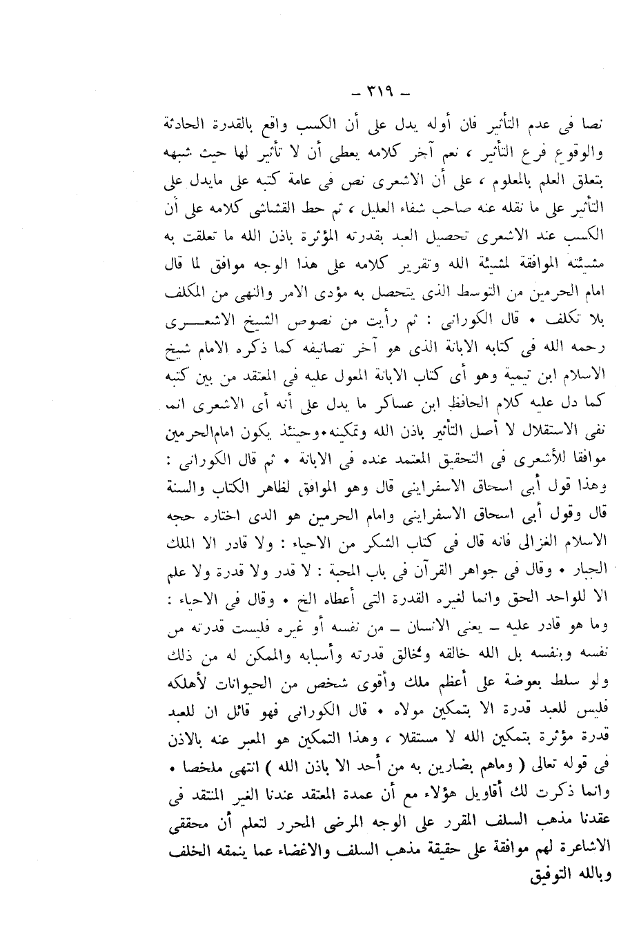 نَصًّا فِي عَدَمِ التَّأْثِيرِ، فَإِنَّ أَوَّلَهُ يَدُلُّ عَلَى أَنَّ الْكَسْبَ وَاقِعٌ بِالْقُدْرَةِ الْحَادِثَةِ، وَالْوُقُوعَ فَرْعُ التَّأْثِيرِ، نَعَمْ آخِرُ كَلَامِهِ يُعْطِي أَنْ لَا تَأْثِيرَ لَهَا حَيْثُ شَبَّهَهُ بِتَعَلُّقِ الْعِلْمِ بِالْمَعْلُومِ، عَلَى أَنَّ الْأَشْعَرِيَّ نَصَّ فِي عَامَّةِ كُتُبِهِ عَلَى مَا يَدُلُّ عَلَى التَّأْثِيرِ عَلَى مَا نَقَلَهُ عَنْهُ صَاحِبُ شِفَاءِ الْعَلِيلِ، ثُمَّ حَطَّ الْقُشَاشِيُّ كَلَامَهُ عَلَى أَنَّ الْكَسْبَ عِنْدَ الْأَشْعَرِيِّ تَحْصِيلُ الْعَبْدِ بِقُدْرَتِهِ الْمُؤَثِّرَةِ بِإِذْنِ اللَّهِ مَا تَعَلَّقَتْ بِهِ مَشِيئَتُهُ الْمُوَافِقَةُ لِمَشِيئَةِ اللَّهِ، وَتَقْرِيرُ كَلَامِهِ عَلَى هَذَا الْوَجْهِ مُوَافِقٌ لِمَا قَالَ إِمَامُ الْحَرَمَيْنِ مِنَ التَّوَسُّطِ الَّذِي يَتَحَصَّلُ بِهِ مُؤَدَّى الْأَمْرِ وَالنَّهْيِ مِنَ الْمُكَلَّفِ بِلَا تَكَلُّفٍ. قَالَ الْكُورَانِيُّ: ثُمَّ رَأَيْتُ مِنْ نُصُوصِ الشَّيْخِ الْأَشْعَرِيِّ - رَحِمَهُ اللَّهُ - فِي كِتَابِهِ الْإِبَانَةِ الَّذِي هُوَ آخِرُ تَصَانِيفِهِ كَمَا ذَكَرَهُ الْإِمَامُ شَيْخُ الْإِسْلَامِ ابْنُ تَيْمِيَّةَ وَهُوَ - أَيْ كِتَابُ الْإِبَانَةِ - الْمُعَوَّلُ عَلَيْهِ فِي الْمُعْتَقَدِ مِنْ بَيْنِ كُتُبِهِ، كَمَا دَلَّ عَلَيْهِ كَلَامُ الْحَافِظِ ابْنِ عَسَاكِرَ؛ مَا يَدُلُّ عَلَى أَنَّهُ - أَيِ الْأَشْعَرِيَّ - إِنَّمَا نَفَى الِاسْتِقْلَالَ لَا أَصِلَ التَّأْثِيرِ بِإِذْنِ اللَّهِ وَتَمْكِينِهِ.