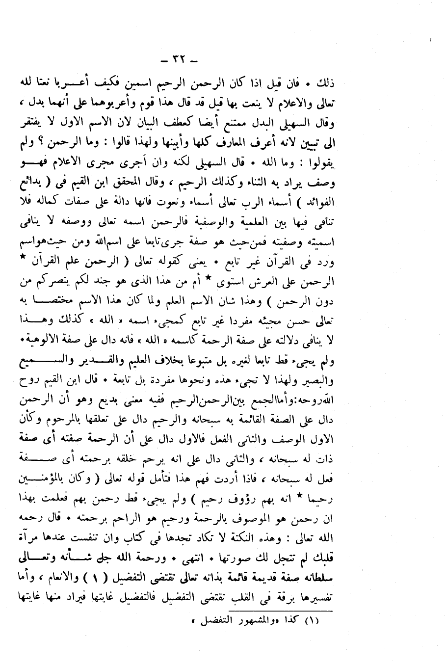 ذَلِكَ. فَإِنْ قِيلَ: إِذَا كَانَ الرَّحْمَنُ الرَّحِيمُ اسْمَيْنِ، فَكَيْفَ أُعْرِبَا نَعْتًا لِلَّهِ - تَعَالَى، وَالْأَعْلَامُ لَا يُنْعَتُ بِهَا؟ قِيلَ: قَدْ قَالَ هَذَا قَوْمٌ، وَأَعْرَبُوهُمَا عَلَى أَنَّهُمَا بَدَلٌ، وَقَالَ السُّهَيْلِيُّ: الْبَدَلُ مُمْتَنِعٌ أَيْضًا كَعَطْفِ الْبَيَانِ ; لِأَنَّ الِاسْمَ الْأَوَّلَ لَا يَفْتَقِرُ إِلَى تَبْيِينٍ ; لِأَنَّهُ أَعْرَفُ الْمَعَارِفِ كُلِّهَا وَأَبْيَنُهَا، وَلِهَذَا قَالُوا: وَمَا الرَّحْمَنُ؟ وَلَمْ يَقُولُوا: وَمَا اللَّهُ؟ قَالَ السُّهَيْلِيُّ: لَكِنَّهُ وَإِنْ أُجْرِيَ مَجْرَى الْأَعْلَامِ، فَهُوَ وَصْفٌ يُرَادُ بِهِ الثَّنَاءُ، وَكَذَلِكَ الرَّحِيمُ، وَقَالَ الْمُحَقِّقُ ابْنُ الْقَيِّمِ فِي (بَدَائِعِ الْفَوَائِدِ) : أَسْمَاءُ الرَّبِّ - تَعَالَى - أَسْمَاءٌ وَنُعُوتٌ، فَإِنَّهَا دَالَّةٌ عَلَى صِفَاتِ كَمَالِهِ، فَلَا تَنَافِيَ فِيهَا بَيْنَ الْعَلَمِيَّةِ وَالْوَصْفِيَّةِ، فَالرَّحْمَنُ اسْمُهُ - تَعَالَى وَوَصْفُهُ، لَا يُنَافِي اسْمِيَّتُهُ وَصْفِيَّتَهُ، فَمِنْ حَيْثُ هُوَ صِفَةٌ جَرَى تَابِعًا عَلَى اسْمِ اللَّهِ، وَمِنْ حَيْثُ هُوَ اسْمٌ، وَرَدَ فِي الْقُرْآنِ غَيْرَ تَابِعٍ. يَعْنِي كَقَوْلِهِ - تَعَالَى: {الرَّحْمَنُ عَلَّمَ الْقُرْآنَ} [الرحمن: 1] {الرَّحْمَنُ عَلَى الْعَرْشِ اسْتَوَى} [طه: 5] {أَمَّنْ هَذَا الَّذِي هُوَ جُنْدٌ لَكُمْ يَنْصُرُكُمْ مِنْ دُونِ الرَّحْمَنِ} [الملك: 20] ، وَهَذَا شَأْنُ الِاسْمِ الْعَلَمِ، وَلَمَّا كَانَ هَذَا الِاسْمُ مُخْتَصًّا بِهِ - تَعَالَى - حَسُنَ مَجِيئُهُ مُفْرَدًا غَيْرَ تَابِعٍ، كَمَجِيءِ اسْمِهِ " اللَّهِ " كَذَلِكَ، وَهَذَا لَا يُنَافِي دَلَالَتَهُ عَلَى صِفَةِ الرَّحْمَةِ كَاسْمِهِ " اللَّهِ "، فَإِنَّهُ دَالٌّ عَلَى صِفَةِ الْأُلُوهِيَّةِ. وَلَمْ يَجِئْ قَطُّ تَابِعًا لِغَيْرِهِ، بَلْ مَتْبُوعًا بِخِلَافِ الْعَلِيمِ وَالْقَدِيرِ، وَالسَّمِيعِ وَالْبَصِيرِ، وَلِهَذَا لَا تَجِيءُ هَذِهِ وَنَحْوُهَا مُفْرَدَةً، بَلْ تَابِعَةً.