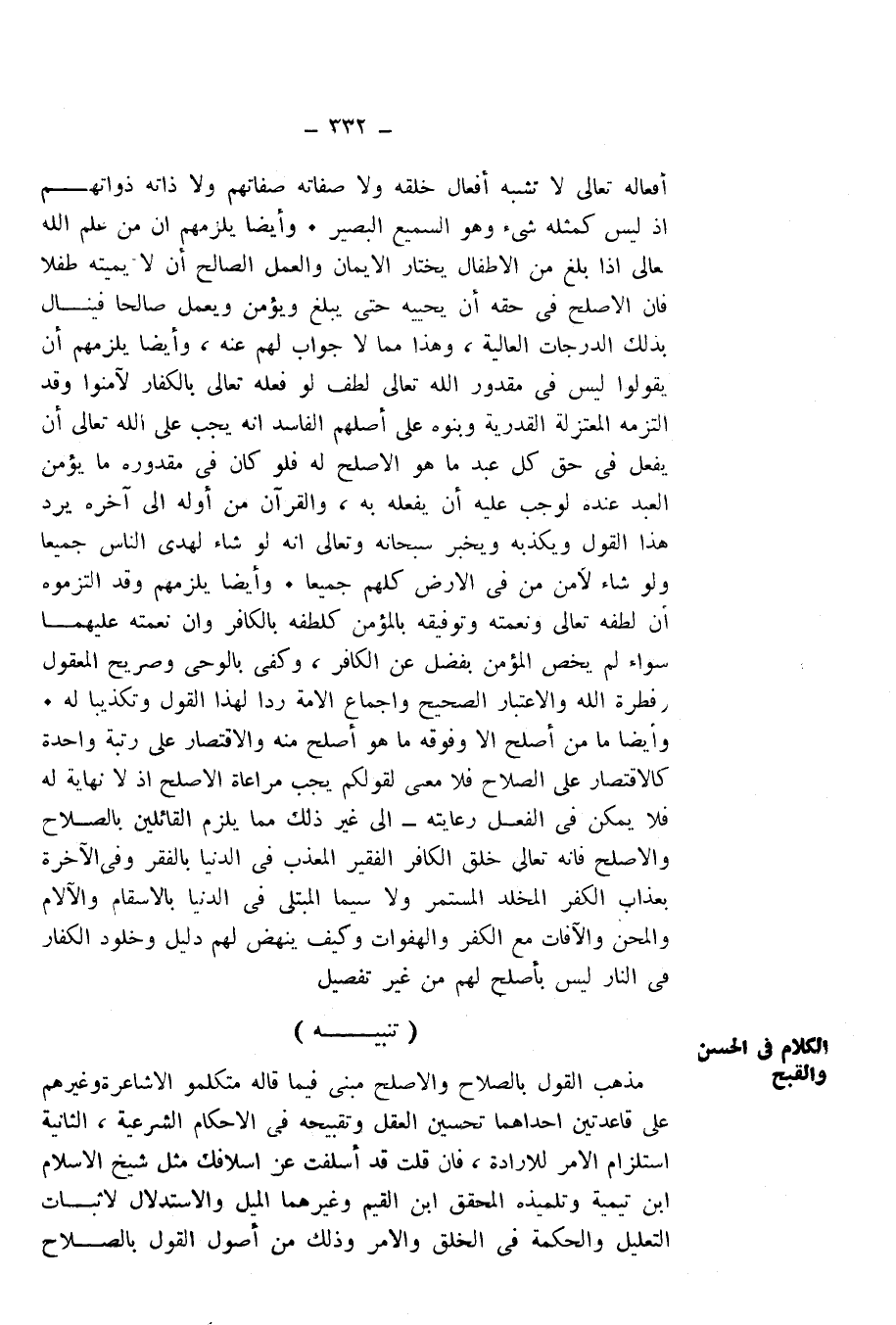 مَذْهَبُ الْقَوْلِ بِالصَّلَاحِ وَالْأَصْلَحِ مَبْنِيٌّ فِيمَا قَالَهُ مُتَكَلِّمُو الْأَشَاعِرَةِ وَغَيْرِهِمْ عَلَى قَاعِدَتَيْنِ: إِحْدَاهُمَا: تَحْسِينُ الْعَقْلِ وَتَقْبِيحُهُ فِي الْأَحْكَامِ الشَّرْعِيَّةِ. الثَّانِيَةُ: اسْتِلْزَامُ الْأَمْرِ لِلْإِرَادَةِ، فَإِنْ قُلْتَ: قَدْ أَسْلَفْتَ عَنْ أَسْلَافِكَ مِثْلَ شَيْخِ الْإِسْلَامِ ابْنِ تَيْمِيَّةَ، وَتِلْمِيذِهِ الْمُحَقِّقِ ابْنِ الْقَيِّمِ وَغَيْرِهِمَا - الْمَيْلَ، وَالِاسْتِدْلَالَ لِإِثْبَاتِ التَّعْلِيلِ وَالْحِكْمَةِ فِي الْخَلْقِ وَالْأَمْرِ، وَذَلِكَ مِنْ أُصُولِ الْقَوْلِ بِالصَّلَاحِ