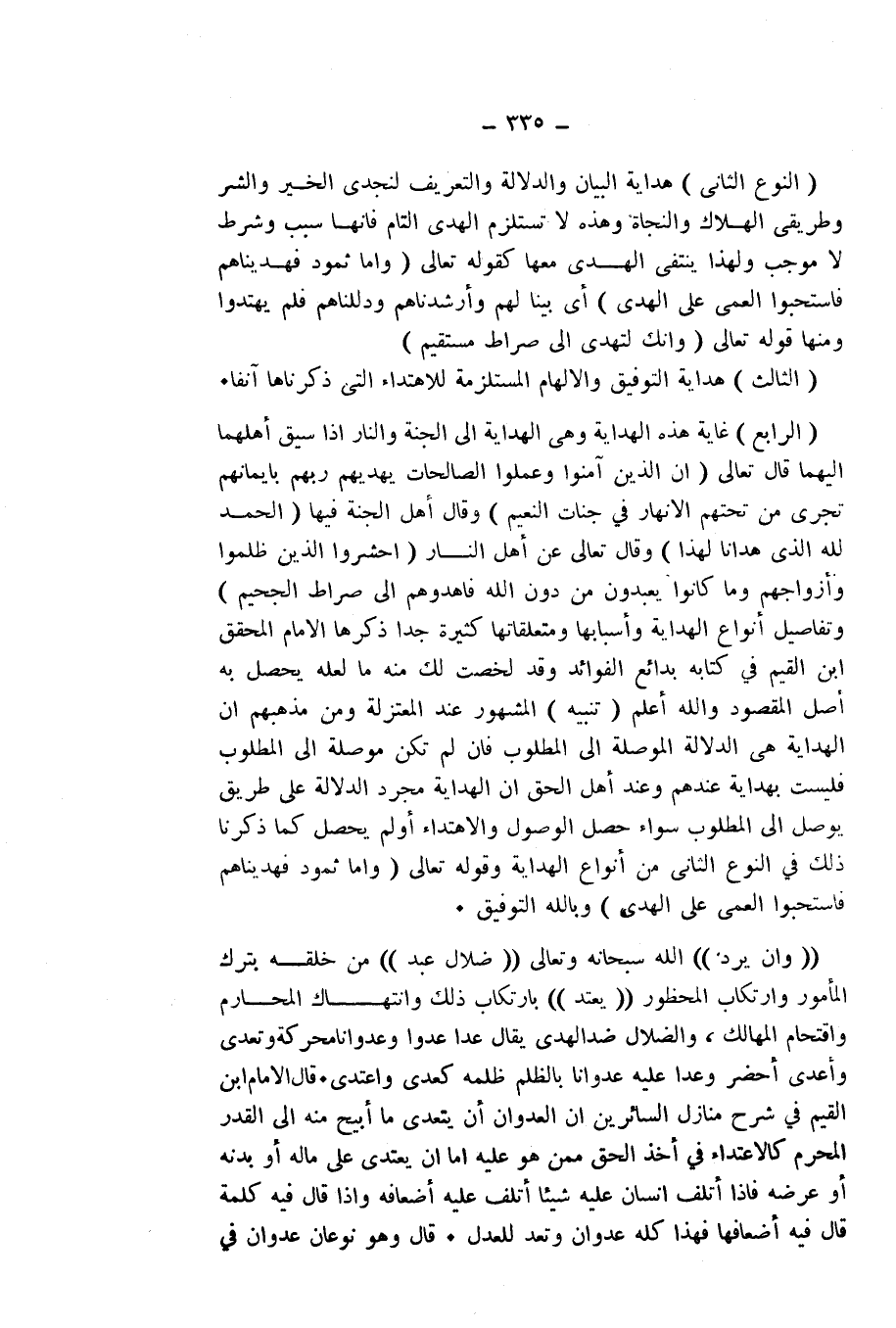 الْمَشْهُورُ عِنْدَ الْمُعْتَزِلَةِ وَمِنْ مَذْهَبِهِمْ - أَنَّ الْهِدَايَةَ هِيَ الدَّلَالَةُ الْمُوَصِّلَةُ إِلَى الْمَطْلُوبِ، فَإِنْ لَمْ تَكُنْ مُوَصِّلَةً إِلَى الْمَطْلُوبِ فَلَيْسَتْ بِهِدَايَةٍ عِنْدَهُمْ، وَعِنْدَ أَهْلِ الْحَقِّ أَنَّ الْهِدَايَةَ مُجَرَّدُ الدَّلَالَةِ عَلَى طَرِيقٍ يُوَصِّلُ إِلَى الْمَطْلُوبِ، سَوَاءٌ حَصَلَ الْوُصُولُ، وَالِاهْتِدَاءُ، أَوْ لَمْ يَحْصُلْ، كَمَا ذَكَرْنَا ذَلِكَ فِي النَّوْعِ الثَّانِي مِنْ أَنْوَاعِ الْهِدَايَةِ، وَقَوْلِهِ - تَعَالَى -: {وَأَمَّا ثَمُودُ فَهَدَيْنَاهُمْ فَاسْتَحَبُّوا الْعَمَى عَلَى الْهُدَى} [فصلت: 17] وَبِاللَّهِ التَّوْفِيقُ. ((وَإِنْ يُرِدِ)) اللَّهُ - سُبْحَانَهُ وَتَعَالَى - ((ضَلَالَ عَبْدٍ)) مِنْ خَلْقِهِ بِتَرْكِ الْمَأْمُورِ وَارْتِكَابِ الْمَحْظُورِ ((يَعْتَدِي)) بِارْتِكَابِ ذَلِكَ وَانْتِهَاكِ الْمَحَارِمِ وَاقْتِحَامِ الْمَهَالِكِ، وَالضَّلَالُ ضِدُّ الْهُدَى، يُقَالُ عَدَا عَدْوًا وَعَدَوَانًا مُحَرَّكَةٌ، وَتَعَدَّى وَأَعْدَى، أَحْضَرَ وَعَدَا عَلَيْهِ عُدْوَانًا بِالظُّلْمِ، ظَلَمَهُ كَعَدَى وَاعْتَدَى. قَالَ الْإِمَامُ ابْنُ الْقَيِّمِ فِي شَرْحِ مَنَازِلِ السَّائِرِينَ: إِنَّ الْعُدْوَانَ أَنْ يَعْتَدِيَ مَا أُبِيحَ مِنْهُ إِلَى الْقَدْرِ الْمُحَرَّمِ، كَالِاعْتِدَاءِ فِي أَخْذِ الْحَقِّ مِمَّنْ هُوَ عَلَيْهِ، إِمَّا أَنْ يَعْتَدِيَ عَلَى مَالِهِ، أَوْ بَدَنِهِ، أَوْ عِرْضِهِ، فَإِذَا أَتْلَفَ إِنْسَانٌ عَلَيْهِ شَيْئًا أَتْلَفَ عَلَيْهِ أَضْعَافَهُ، وَإِذَا قَالَ فِيهِ كَلِمَةً، قَالَ فِيهِ أَضْعَافَهَا، فَهَذَا كُلُّهُ عُدْوَانٌ وَتَعَدٍّ لِلْعَدْلِ. قَالَ: وَهُوَ نَوْعَانِ: عُدْوَانٌ فِي