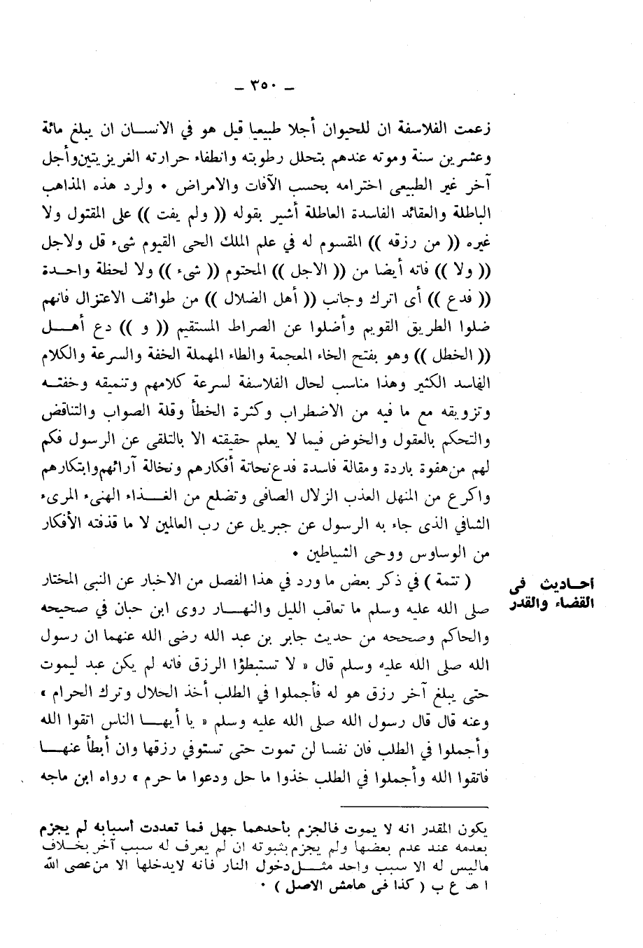 زَعَمَتِ الْفَلَاسِفَةُ أَنَّ لِلْحَيَوَانِ أَجَلًا طَبِيعِيًّا، قِيلَ: هُوَ فِي الْإِنْسَانِ أَنْ يَبْلُغَ مِائَةً وَعِشْرِينَ سَنَةً، وَمَوْتُهُ عِنْدَهُمْ بِتَحَلُّلِ رُطُوبَتِهِ، وَانْطِفَاءِ حَرَارَتِهِ الْغَرِيزِيَّتَيْنِ، وَأَجَلًا آخَرَ غَيْرَ الطَّبِيعِيِّ، اخْتِرَامُهُ بِحَسَبِ الْآفَاتِ، وَالْأَمْرَاضِ. وَلِرَدِّ هَذِهِ الْمَذَاهِبِ الْبَاطِلَةِ، وَالْعَقَائِدِ الْفَاسِدَةِ الْعَاطِلَةِ أُشِيرُ بِقَوْلِهِ: ((وَلَمْ يَفُتْ)) عَلَى الْمَقْتُولِ وَلَا غَيْرِهِ ((مِنْ رِزْقِهِ)) الْمَقْسُومِ لَهُ فِي عِلْمِ الْمَلِكِ الْحَيِّ الْقَيُّومِ شَيْءٌ، قَلَّ وَلَا جَلَّ ((وَلَا)) فَاتَهُ أَيْضًا مِنَ ((الْأَجَلِ)) الْمَحْتُومِ ((شَيْءٌ)) وَلَا لَحْظَةٌ وَاحِدَةٌ ((فَدَعْ)) أَيِ اتْرُكْ وَجَانِبْ ((أَهْلَ الضَّلَالِ)) مِنْ طَوَائِفِ الِاعْتِزَالِ، فَإِنَّهُمْ ضَلُّوا الطَّرِيقَ الْقَوِيمَ وَأَضَلُّوا عَنِ الصِّرَاطِ الْمُسْتَقِيمِ ((وَ)) دَعْ أَهْلَ ((الْخَطَلِ)) وَهُوَ، بِفَتْحِ الْخَاءِ الْمُعْجَمَةِ، وَالطَّاءِ الْمُهْمَلَةِ - الْخِفَّةُ وَالسُّرْعَةُ وَالْكَلَامُ الْفَاسِدُ الْكَثِيرُ، وَهَذَا مُنَاسِبٌ لِحَالِ الْفَلَاسِفَةِ لِسُرْعَةِ كَلَامِهِمْ وَتَنْمِيقِهِ وَخِفَّتِهِ، وَتَزْوِيقِهِ مَعَ مَا فِيهِ مِنَ الِاضْطِرَابِ وَكَثْرَةِ الْخَطَأِ وَقِلَّةِ الصَّوَابِ وَالتَّنَاقُضِ وَالتَّحَكُّمِ بِالْعُقُولِ، وَالْخَوْضِ فِيمَا لَا يُعْلَمُ حَقِيقَتُهُ إِلَّا بِالتَّلَقِّي عَنِ الرَّسُولِ، فَكَمْ لَهُمْ مِنْ هَفْوَةٍ بَارِدَةٍ، وَمُقَالَةٍ فَاسِدَةٍ، فَدَعْ نُحَاتَةَ أَفْكَارِهِمْ وَنُحَالَةَ آرَائِهِمْ وَابْتِكَارِهِمْ، وَاكْرَعْ مِنَ الْمَنْهَلِ الْعَذْبِ الزُّلَالِ الصَّافِي، وَتَضَلَّعْ مِنَ الْغِذَاءِ الْهَنِيءِ الْمَرِيءِ الشَّافِي الَّذِي جَاءَ بِهِ الرَّسُولُ عَنْ جِبْرِيلَ، عَنْ رَبِّ الْعَالَمِينَ، لَا مَا قَذَفَتْهُ الْأَفْكَارُ مِنَ الْوَسَاوِسِ وَوَحْيِ الشَّيَاطِينِ.