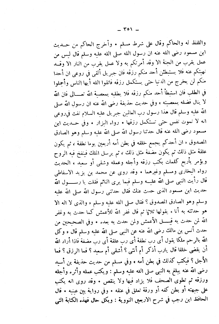، وَاللَّفْظُ لَهُ، وَالْحَاكِمُ، وَقَالَ: عَلَى شَرْطِ مُسْلِمٍ. وَأَخْرَجَ الْحَاكِمُ مِنْ حَدِيثِ ابْنِ مَسْعُودٍ - رَضِيَ اللَّهُ عَنْهُ - أَنَّ رَسُولَ اللَّهِ - صَلَّى اللَّهُ عَلَيْهِ وَسَلَّمَ - قَالَ: «لَيْسَ مِنْ عَمَلٍ يُقَرِّبُ مِنَ الْجَنَّةِ إِلَّا وَقَدْ أَمَرْتُكُمْ بِهِ، وَلَا عَمَلٌ يُقَرِّبُ مِنَ النَّارِ إِلَّا وَقَدْ نَهَيْتُكُمْ عَنْهُ، فَلَا يَسْتَبْطِئَنَّ أَحَدٌ مِنْكُمْ رِزْقَهُ، فَإِنَّ جِبْرِيلَ أَلْقَى فِي رُوعِي أَنَّ أَحَدًا مِنْكُمْ لَنْ يَخْرُجَ مِنَ الدُّنْيَا حَتَّى يَسْتَكْمِلَ رِزْقَهُ، فَاتَّقُوا اللَّهَ أَيُّهَا النَّاسُ وَأَجْمِلُوا فِي الطَّلَبِ، فَإِنِ اسْتَبْطَأَ أَحَدٌ مِنْكُمْ رِزْقَهُ، فَلَا يَطْلُبْهُ بِمَعْصِيَةِ اللَّهِ - تَعَالَى، فَإِنَّ اللَّهَ لَا يُنَالُ فَضْلُهُ بِمَعْصِيَتِهِ» ".