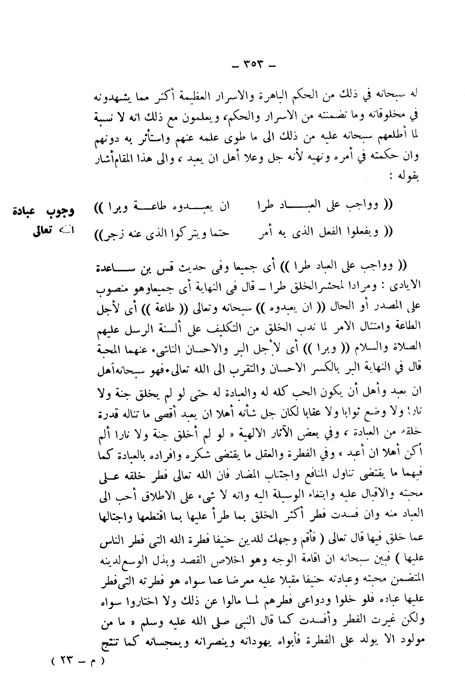 ((وَوَاجِبٌ عَلَى الْعِبَادِ طُرًّا ... أَنْ يَعْبُدُوهُ طَاعَةً وَبِرًّا))