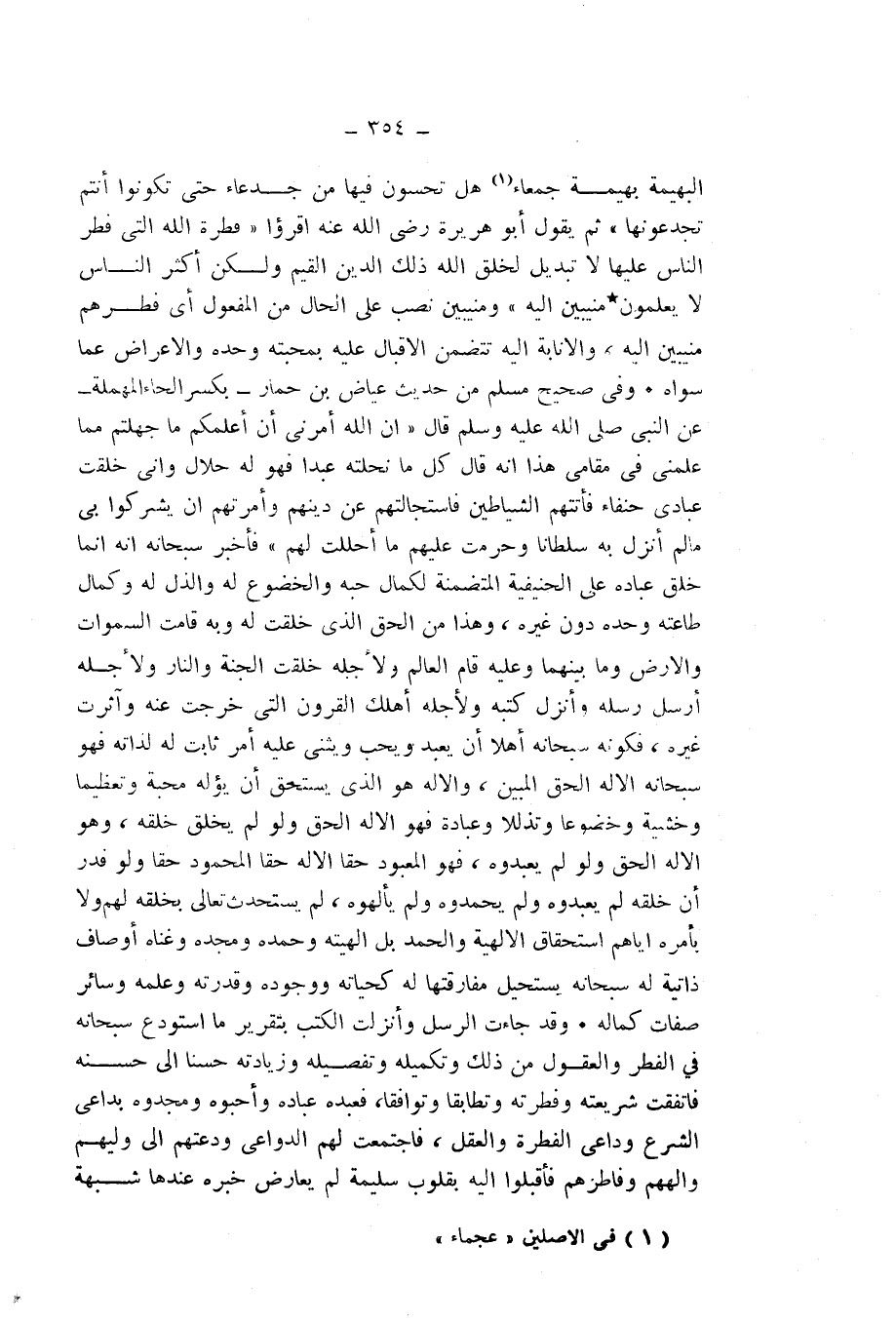 الْبَهِيمَةُ بَهِيمَةً جَمْعَاءَ هَلْ تُحِسُّونَ فِيهَا مِنْ جَدْعَاءَ حَتَّى تَكُونُوا أَنْتُمْ تَجْدَعُونَهَا» " ثُمَّ يَقُولُ أَبُو هُرَيْرَةَ - رَضِيَ اللَّهُ عَنْهُ - اقْرَءُوا {فِطْرَةَ اللَّهِ الَّتِي فَطَرَ النَّاسَ عَلَيْهَا لَا تَبْدِيلَ لِخَلْقِ اللَّهِ ذَلِكَ الدِّينُ الْقَيِّمُ وَلَكِنَّ أَكْثَرَ النَّاسِ لَا يَعْلَمُونَ - مُنِيبِينَ إِلَيْهِ} [الروم: 30 - 31] وَ " مُنِيبِينَ " نُصِبَ عَلَى الْحَالِ مِنَ الْمَفْعُولِ، أَيْ: فَطَرَهُمْ مُنِيبِينَ إِلَيْهِ، وَالْإِنَابَةُ إِلَيْهِ تَتَضَمَّنُ الْإِقْبَالَ عَلَيْهِ بِمَحَبَّتِهِ وَحْدَهُ وَالْإِعْرَاضِ عَمَّا سِوَاهُ. وَفِي صَحِيحِ مُسْلِمٍ مِنْ حَدِيثِ عِيَاضِ بْنِ حِمَارٍ - بِكَسْرِ الْحَاءِ الْمُهْمَلَةِ - عَنِ النَّبِيِّ - صَلَّى اللَّهُ عَلَيْهِ وَسَلَّمَ - قَالَ: " «إِنَّ اللَّهَ أَمَرَنِي أَنْ أُعَلِّمَكُمْ مَا جَهِلْتُمْ مِمَّا عَلَّمَنِي فِي مَقَامِي هَذَا أَنَّهُ قَالَ: كُلُّ مَا نَحَلْتُهُ عَبْدًا فَهُوَ لَهُ حَلَالٌ، وَإِنِّي خَلَقْتُ عِبَادِي حُنَفَاءَ فَأَتَتْهُمُ الشَّيَاطِينُ فَاسْتَجَالَتْهُمْ عَنْ دِينِهِمْ، وَأَمَرَتْهُمْ أَنْ يُشْرِكُوا بِي مَا لَمْ أُنَزِّلْ بِهِ سُلْطَانًا، وَحَرَّمَتْ عَلَيْهِمْ مَا أَحْلَلْتُ لَهُمْ» " فَأَخْبَرَ سُبْحَانَهُ أَنَّهُ إِنَّمَا خَلَقَ عِبَادَهُ عَلَى الْحَنِيفِيَّةِ الْمُتَضَمِّنَةِ لِكَمَالِ حُبِّهِ، وَالْخُضُوعِ لَهُ، وَالذُّلِّ لَهُ، وَكَمَالِ طَاعَتِهِ وَحْدَهُ دُونَ غَيْرِهِ، وَهَذَا مِنَ الْحَقِّ الَّذِي خُلِقَتْ لَهُ، وَبِهِ قَامَتِ السَّمَاوَاتُ وَالْأَرْضُ وَمَا بَيْنَهُمَا، وَعَلَيْهِ قَامَ الْعِلْمُ، وَلِأَجْلِهِ خُلِقَتِ الْجَنَّةُ وَالنَّارُ، وَلِأَجْلِهِ أَرْسَلَ رُسُلَهُ، وَأَنْزَلَ كُتُبَهُ، وَلِأَجْلِهِ أَهْلَكَ الْقُرُونَ الَّتِي خَرَجَتْ عَنْهُ وَآثَرَتْ غَيْرَهُ، فَكَوْنُهُ سُبْحَانَهُ أَهْلًا أَنْ يُعْبَدَ وَيُحَبَّ وَيُثْنَى عَلَيْهِ أَمْرٌ ثَابِتٌ لَهُ لِذَاتِهِ، فَهُوَ سُبْحَانَهُ الْإِلَهُ الْحَقُّ الْمُبِينُ، وَالْإِلَهُ هُوَ الَّذِي يَسْتَحِقُّ أَنْ يُؤَلَّهَ مَحَبَّةً وَتَعْظِيمًا وَخَشْيَةً وَخُضُوعًا وَتَذَلُّلًا وَعِبَادَةً، فَهُوَ الْإِلَهُ الْحَقُّ وَلَوْ لَمْ يَخْلُقْ خَلْقَهُ، وَهُوَ الْإِلَهُ الْحَقُّ وَلَوْ لَمْ يَعْبُدُوهُ، فَهُوَ الْمَعْبُودُ حَقًّا، الْإِلَهُ حَقًّا، الْمَحْمُودُ حَقًّا، وَلَوْ قُدِّرَ أَنَّ خَلْقَهُ لَمْ يَعْبُدُوهُ وَلَمْ يَحْمَدُوهُ وَلَمْ يُؤَلِّهُوهُ؛ لَمْ يَسْتَحْدِثْ - تَعَالَى - بِخَلْقِهِ لَهُمْ وَلَا بِأَمْرِهِ إِيَّاهُمُ اسْتِحْقَاقَ الْإِلَهِيَّةِ وَالْحَمْدِ، بَلْ إِلَهِيَّتُهُ وَحَمْدُهُ وَمَجْدُهُ وَغِنَاهُ أَوْصَافٌ ذَاتِيَّةٌ لَهُ - سُبْحَانَهُ، يَسْتَحِيلُ مُفَارَقَتُهَا لَهُ كَحَيَاتِهِ وَوُجُودِهِ وَقُدْرَتِهِ وَعِلْمِهِ وَسَائِرِ صِفَاتِ كَمَالِهِ.