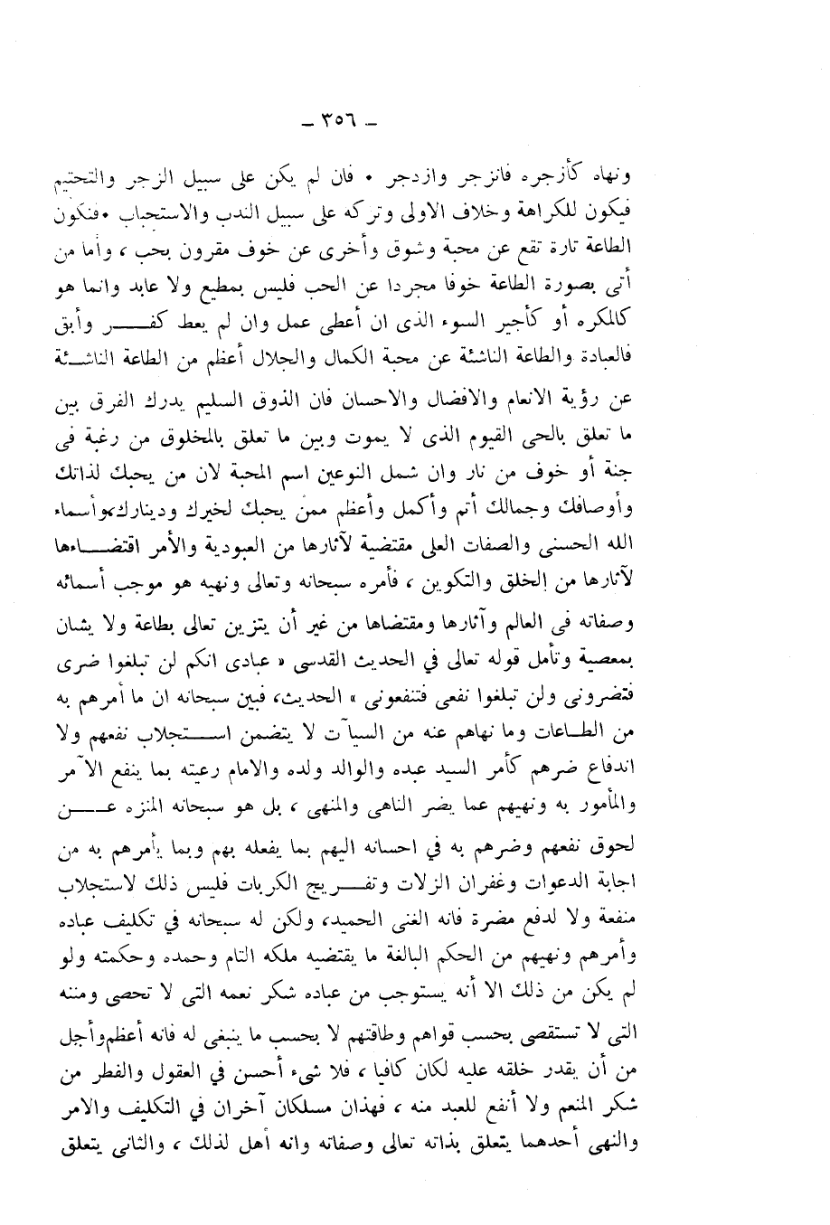 وَنَهَاهُ كَأَزْجَرَهُ فَانْزَجَرَ وَازْدَجَرَ، فَإِنْ لَمْ يَكُنْ عَلَى سَبِيلِ الزَّجْرِ وَالتَّحْتِيمِ فَيَكُونُ لِلْكَرَاهَةِ وَخِلَافِ الْأَوْلَى، وَتَرْكُهُ عَلَى سَبِيلِ النَّدْبِ وَالِاسْتِحْبَابِ. فَتَكُونُ الطَّاعَةُ تَارَةً تَقَعُ عَنْ مَحَبَّةٍ وَشَوْقٍ، وَأُخْرَى عَنْ خَوْفٍ مَقْرُونٍ بِحُبٍّ، وَأَمَّا مَنْ أَتَى بِصُورَةِ الطَّاعَةِ خَوْفًا مُجَرَّدًا عَنِ الْحُبِّ، فَلَيْسَ بِمُطِيعٍ وَلَا عَابِدٍ، وَإِنَّمَا هُوَ كَالْمُكْرَهِ، أَوْ كَأَجِيرِ السُّوءِ الَّذِي إِنْ أُعْطِيَ عَمِلَ، وَإِنْ لَمْ يُعْطَ كَفَرَ وَأَبَقَ، فَالْعِبَادَةُ وَالطَّاعَةُ النَّاشِئَةُ عَنْ مَحَبَّةِ الْكَمَالِ وَالْجَلَالِ أَعْظَمُ مِنَ الطَّاعَةِ النَّاشِئَةِ عَنْ رُؤْيَةِ الْإِنْعَامِ، وَالْإِفْضَالِ، وَالْإِحْسَانِ، فَإِنَّ الذَّوْقَ السَّلِيمَ يُدْرِكُ الْفَرْقَ بَيْنَ مَا تَعَلَّقَ بِالْحَيِّ الْقَيُّومِ الَّذِي لَا يَمُوتُ، وَبَيْنَ مَا تَعَلَّقَ بِالْمَخْلُوقِ مِنْ رَغْبَةٍ فِي جَنَّةٍ، أَوْ خَوْفٍ مِنْ نَارٍ، وَإِنْ شَمَلَ النَّوْعَيْنِ اسْمُ الْمَحَبَّةِ ; لِأَنَّ مَنْ يُحِبُّكَ لِذَاتِكَ وَأَوْصَافِكَ وَجِمَالِكَ أَتَمُّ وَأَكْمَلُ وَأَعْظَمُ مِمَّنْ يُحِبُّكَ لِخَيْرِكَ وَدِينَارِكَ. وَأَسْمَاءُ اللَّهِ الْحُسْنَى، وَالصِّفَاتُ الْعُلَى مُقْتَضِيَةٌ لِآثَارِهَا مِنَ الْعُبُودِيَّةِ وَالْأَمْرِ اقْتِضَاءَهَا لِآثَارِهَا مِنَ الْخَلْقِ وَالتَّكْوِينِ، فَأَمْرُهُ - سُبْحَانَهُ وَتَعَالَى - وَنَهْيُهُ هُوَ مُوجِبُ أَسْمَائِهِ وَصِفَاتِهِ فِي الْعَالَمِ وَآثَارِهَا وَمُقْتَضَاهَا، مِنْ غَيْرِ أَنْ يَتَزَيَّنَ - تَعَالَى - بِطَاعَةٍ وَلَا يُشَانُ بِمَعْصِيَةٍ، وَتَأَمَّلْ قَوْلَهُ - تَعَالَى - فِي الْحَدِيثِ الْقُدْسِيِّ: " «عِبَادِي إِنَّكُمْ لَنْ تَبْلُغُوا ضُرِّي فَتَضُرُّونِي، وَلَنْ تَبَلُغُوا نَفْعِي فَتَنْفَعُونِي» " الْحَدِيثَ، فَبَيَّنَ - سُبْحَانَهُ - أَنَّ مَا أَمَرَهُمْ بِهِ مِنَ الطَّاعَاتِ وَمَا نَهَاهُمْ عَنْهُ مِنَ السَّيِّئَاتِ، لَا يَتَضَمَّنُ اسْتِجْلَابَ نَفْعِهِمْ وَلَا انْدِفَاعَ ضُرِّهِمْ، كَأَمْرِ السَّيِّدِ عَبْدَهُ، وَالْوَالِدِ وَلَدَهُ، وَالْإِمَامِ رَعِيَّتَهُ بِمَا يَنْفَعُ الْآمِرَ وَالْمَأْمُورَ بِهِ، وَنَهْيِهِمْ عَمَّا يَضُرُّ النَّاهِيَ، وَالْمَنْهِيَّ، بَلْ هُوَ - سُبْحَانَهُ - الْمُنَزَّهُ عَنْ لُحُوقِ نَفْعِهِمْ وَضُرِّهِمْ بِهِ فِي إِحْسَانِهِ إِلَيْهِمْ بِمَا يَفْعَلُهُ بِهِمْ، وَبِمَا يَأْمُرُهُمْ بِهِ مِنْ إِجَابَةِ الدَّعَوَاتِ وَغُفْرَانِ الزَّلَّاتِ وَتَفْرِيجِ الْكُرُبَاتِ، فَلَيْسَ ذَلِكَ لِاسْتِجْلَابِ مَنْفَعَةٍ وَلَا لِدَفْعِ مَضَرَّةٍ، فَإِنَّهُ الْغَنِيُّ الْحَمِيدُ، وَلَكِنْ لَهُ - سُبْحَانَهُ - فِي تَكْلِيفِ عِبَادِهِ وَأَمْرِهِمْ وَنَهْيِهِمْ مِنَ الْحِكَمِ الْبَالِغَةِ مَا يَقْتَضِيهِ مُلْكُهُ التَّامُّ وَحَمْدُهُ وَحِكْمَتُهُ. وَلَوْ لَمْ يَكُنْ مِنْ ذَلِكَ إِلَّا أَنَّهُ يَسْتَوْجِبُ مِنْ عِبَادِهِ شُكْرَ نِعَمِهِ الَّتِي لَا تُحْصَى، وَمِنَنِهِ الَّتِي لَا تُسْتَقْصَى بِحَسَبِ قُوَاهُمْ وَطَاقَتِهِمْ، لَا بِحَسَبِ مَا يَنْبَغِي لَهُ، فَإِنَّهُ أَعْظَمُ وَأَجَلُّ مِنْ أَنْ يَقْدِرَ خَلْقُهُ عَلَيْهِ؛ لَكَانَ كَافِيًا. فَلَا شَيْءَ أَحْسَنُ فِي الْعُقُولِ وَالْفِطَرِ مِنْ شُكْرِ الْمُنْعِمِ وَلَا أَنْفَعَ لِلْعَبْدِ مِنْهُ، فَهَذَانَ مَسْلَكَانِ آخَرَانِ فِي التَّكْلِيفِ، وَالْأَمْرِ وَالنَّهْيِ، أَحَدُهُمَا يَتَعَلَّقُ بِذَاتِهِ - تَعَالَى - وَصِفَاتِهِ، وَأَنَّهُ أَهْلٌ لِذَلِكَ، وَالثَّانِي يَتَعَلَّقُ