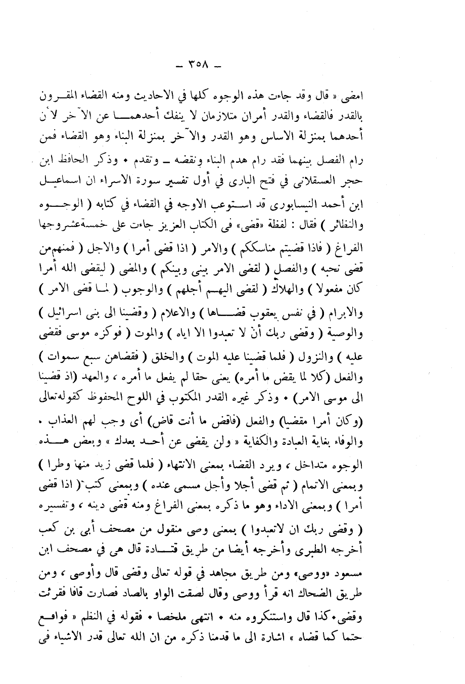 أَمْضَى " قَالَ: وَقَدْ جَاءَتْ هَذِهِ الْوُجُوهُ كُلُّهَا فِي الْأَحَادِيثِ، وَمِنْهُ الْقَضَاءُ الْمَقْرُونُ بِالْقَدَرِ، فَالْقَضَاءُ وَالْقَدَرُ أَمْرَانِ مُتَلَازِمَانِ لَا يَنْفَكُّ أَحَدُهُمَا عَنِ الْآخَرِ؛ لِأَنَّ أَحَدَهُمَا بِمَنْزِلَةِ الْأَسَاسِ، وَهُوَ الْقَدَرُ، وَالْآخِرُ بِمَنْزِلَةِ الْبِنَاءِ، وَهُوَ الْقَضَاءُ، فَمَنْ رَامَ الْفَصْلَ بَيْنَهُمَا، فَقَدْ رَامَ هَدْمَ الْبِنَاءِ وَنَقْضَهُ، وَتَقَدَّمَ. وَذَكَرَ الْحَافِظُ ابْنُ حَجَرٍ الْعَسْقَلَانِيُّ فِي فَتْحِ الْبَارِي فِي أَوَّلِ تَفْسِيرِ سُورَةِ الْإِسْرَاءِ أَنَّ إِسْمَاعِيلَ بْنَ أَحْمَدَ النَّيْسَابُورِيَّ قَدِ اسْتَوْعَبَ الْأَوْجُهَ فِي الْقَضَاءِ فِي كِتَابِهِ (الْوُجُوهِ وَالنَّظَائِرِ) فَقَالَ: لَفْظَةُ " قَضَى " فِي الْكِتَابِ الْعَزِيزِ جَاءَتْ عَلَى خَمْسَةَ عَشَرَ وَجْهًا: الْفَرَاغِ {فَإِذَا قَضَيْتُمْ مَنَاسِكَكُمْ} [البقرة: 200] ، وَالْأَمْرِ {إِذَا قَضَى أَمْرًا} [آل عمران: 47] ، وَالْأَجَلِ {فَمِنْهُمْ مَنْ قَضَى نَحْبَهُ} [الأحزاب: 23] ، وَالْفَصْلِ {لَقُضِيَ الْأَمْرُ بَيْنِي وَبَيْنَكُمْ} [الأنعام: 58] ، وَالْمُضِيِّ {لِيَقْضِيَ اللَّهُ أَمْرًا كَانَ مَفْعُولًا} [الأنفال: 42] ، وَالْهَلَاكِ {لَقُضِيَ إِلَيْهِمْ أَجَلُهُمْ} [يونس: 11] ، وَالْوُجُوبِ {لَمَّا قُضِيَ الْأَمْرُ} [إبراهيم: 22] ، وَالْإِبْرَامِ {فِي نَفْسِ يَعْقُوبَ قَضَاهَا} [يوسف: 68] ، وَالْإِعْلَامِ {وَقَضَيْنَا إِلَى بَنِي إسْرائِيلَ} [الإسراء: 4] ، وَالْوَصِيَّةِ {وَقَضَى رَبُّكَ أَلَّا تَعْبُدُوا إِلَّا إِيَّاهُ} [الإسراء: 23] ، وَالْمَوْتِ {فَوَكَزَهُ مُوسَى فَقَضَى عَلَيْهِ} [القصص: 15] ، وَالنُّزُولِ {فَلَمَّا قَضَيْنَا عَلَيْهِ الْمَوْتَ} [سبأ: 14] ، وَالْخَلْقِ {فَقَضَاهُنَّ سَبْعَ سَمَاوَاتٍ} [فصلت: 12] ، وَالْفِعْلِ {كَلَّا لَمَّا يَقْضِ مَا أَمَرَهُ} [عبس: 23] يَعْنِي حَقًّا لَمْ يَفْعَلْ مَا أَمَرَهُ، وَالْعَهْدِ {إِذْ قَضَيْنَا إِلَى مُوسَى الْأَمْرَ} [القصص: 44] . وَذَكَرَ غَيْرُهُ الْقَدَرَ الْمَكْتُوبَ فِي اللَّوْحِ الْمَحْفُوظِ كَقَوْلِهِ - تَعَالَى -: {وَكَانَ أَمْرًا مَقْضِيًّا} [مريم: 21] ، وَالْفِعْلَ {فَاقْضِ مَا أَنْتَ قَاضٍ} [طه: 72] أَيْ: وَجَبَ لَهُمُ الْعَذَابُ. وَالْوَفَاءِ بِغَايَةِ الْعِبَادَةِ، وَالْكِفَايَةِ " وَلَنْ يَقْضِيَ عَنْ أَحَدٍ بَعْدَكَ ". وَبَعْضُ هَذِهِ الْوُجُوهِ مُتَدَاخِلٌ، وَيَرِدُ الْقَضَاءُ بِمَعْنَى الِانْتِهَاءِ {فَلَمَّا قَضَى زَيْدٌ مِنْهَا وَطَرًا} [الأحزاب: 37] وَبِمَعْنَى الْإِتْمَامِ {ثُمَّ قَضَى أَجَلًا وَأَجَلٌ مُسَمًّى عِنْدَهُ} [الأنعام: 2] وَبِمَعْنَى " كَتَبَ " {إِذَا قَضَى أَمْرًا} [آل عمران: 47] وَبِمَعْنَى الْأَدَاءِ، وَهُوَ مَا ذَكَرَهُ بِمَعْنَى الْفَرَاغِ، وَمِنْهُ " قَضَى دَيْنَهُ "، وَتَفْسِيرُهُ {وَقَضَى رَبُّكَ أَلَّا تَعْبُدُوا} [الإسراء: 23] بِمَعْنَى " وَصَّى " مَنْقُولٌ مِنْ مُصْحَفِ أُبَيِّ بْنِ كَعْبٍ، أَخْرَجَهُ الطَّبَرِيُّ، وَأَخْرَجَهُ أَيْضًا مِنْ طَرِيقِ قَتَادَةَ، قَالَ: هِيَ فِي مُصْحَفِ ابْنِ مَسْعُودٍ " وَوَصَّى " وَمِنْ طَرِيقِ مُجَاهِدٍ فِي قَوْلِهِ - تَعَالَى -: {وَقَضَى} [الإسراء: 23] قَالَ: وَأَوْصَى، وَمِنْ طَرِيقِ الضَّحَّاكِ أَنَّهُ قَرَأَ: وَوَصَّى، وَقَالَ: لَصِقَتِ الْوَاوُ بِالصَّادِ فَصَارَتْ قَافًا، فَقُرِئَتْ: وَقَضَى. كَذَا قَالَ، وَاسْتَنْكَرُوا مِنْهُ. انْتَهَى مُلَخَّصًا. فَقَوْلُهُ فِي النَّظْمِ: " فَوَاقِعٌ حَتْمًا كَمَا قَضَاهُ " إِشَارَةٌ إِلَى مَا قَدَّمْنَا ذِكْرَهُ مِنْ أَنَّ اللَّهَ - تَعَالَى - قَدَّرَ الْأَشْيَاءَ فِي