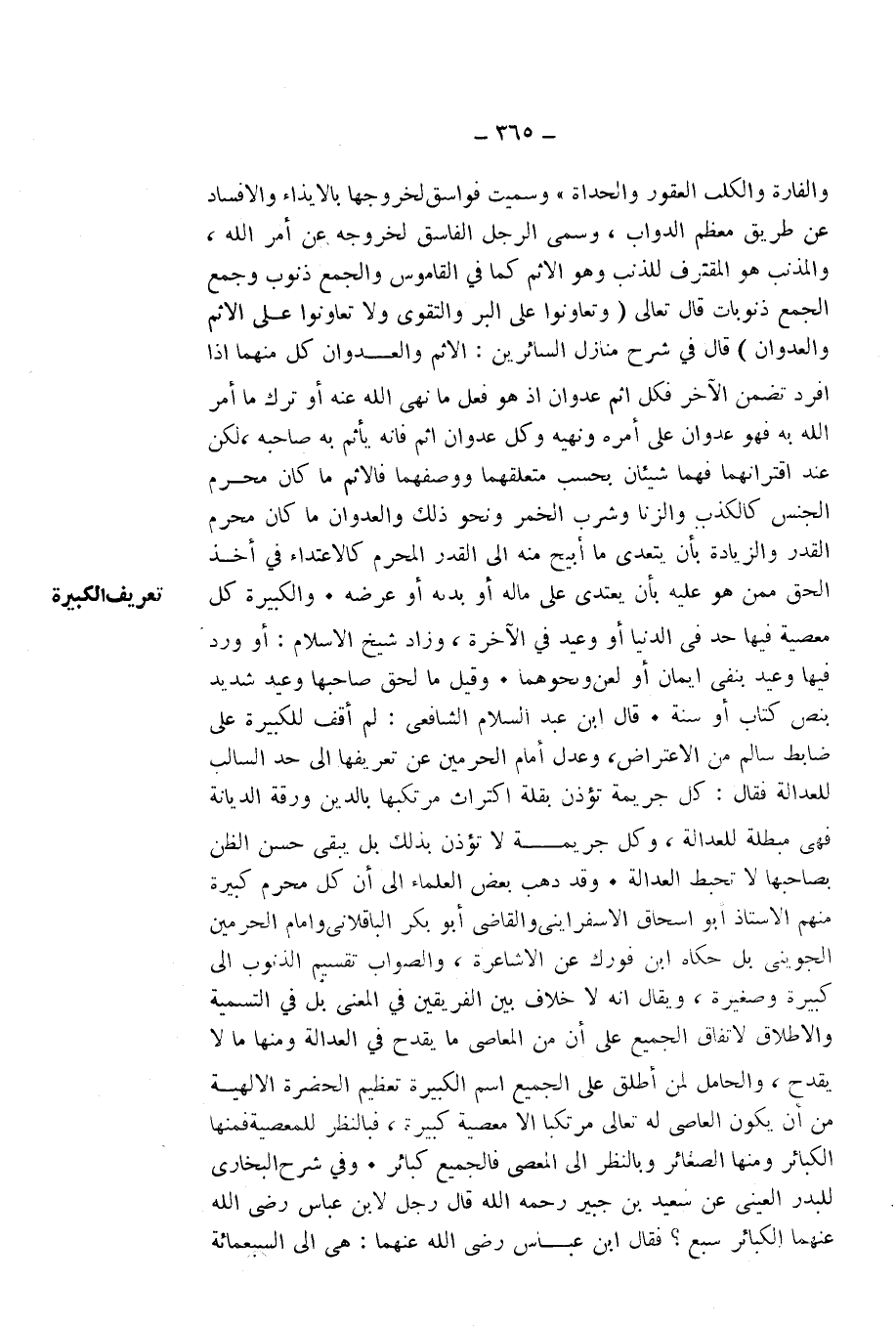 وَالْكَبِيرَةُ كُلُّ مُصِيبَةٍ فِيهَا حَدٌّ فِي الدُّنْيَا، أَوْ وَعِيدٌ فِي الْآخِرَةِ، وَزَادَ شَيْخُ الْإِسْلَامِ: أَوْ وَرَدَ فِيهَا وَعِيدٌ بِنَفْيِ إِيمَانٍ، أَوْ لَعْنٍ وَنَحْوِهِمَا. وَقِيلَ: مَا لَحِقَ صَاحِبَهَا وَعِيدٌ شَدِيدٌ بِنَصِّ كِتَابٍ، أَوْ سُنَّةٍ. قَالَ ابْنُ عَبْدِ السَّلَامِ الشَّافِعِيُّ: لَمْ أَقِفْ لِلْكَبِيرَةِ عَلَى ضَابِطٍ سَالِمٍ مِنَ الِاعْتِرَاضِ، وَعَدَلَ إِمَامُ الْحَرَمَيْنِ عَنْ تَعْرِيفِهَا إِلَى حَدِّ السَّالِبِ لِلْعَدَالَةِ، فَقَالَ: كُلُّ جَرِيمَةٍ تُؤْذِنُ بِقِلَّةِ اكْتِرَاثِ مُرْتَكِبِهَا بِالدِّينِ، وَرِقَّةِ الدِّيَانَةِ، فَهِيَ مُبْطِلَةٌ لِلْعَدَالَةِ. وَكُلُّ جَرِيمَةٍ لَا تُؤْذِنُ بِذَلِكَ، بَلْ يَبْقَى حُسْنُ الظَّنِّ بِصَاحِبِهَا - لَا تُحْبِطُ الْعَدَالَةَ. وَقَدْ ذَهَبَ بَعْضُ الْعُلَمَاءِ إِلَى أَنَّ كُلَّ مُحَرَّمٍ كَبِيرَةٌ، مِنْهُمُ الْأُسْتَاذُ أَبُو إِسْحَاقَ الْإِسْفِرَايِينِيُّ، وَالْقَاضِي أَبُو بَكْرٍ الْبَاقِلَّانِيُّ، وَإِمَامُ الْحَرَمَيْنِ الْجُوَيْنِيُّ، بَلْ حَكَاهُ ابْنُ فُورَكٍ عَنِ الْأَشَاعِرَةِ، وَالصَّوَابُ تَقْسِيمُ الذُّنُوبِ إِلَى كَبِيرَةٍ وَصَغِيرَةٍ، وَيُقَالُ: إِنَّهُ لَا خِلَافَ بَيْنَ الْفَرِيقَيْنِ فِي الْمَعْنَى، بَلْ فِي التَّسْمِيَةِ وَالْإِطْلَاقِ، لِاتِّفَاقِ الْجَمِيعِ عَلَى أَنَّ مِنَ الْمَعَاصِي مَا يَقْدَحُ فِي الْعَدَالَةِ، وَمِنْهَا مَا لَا يَقْدَحُ، وَالْحَامِلُ لِمَنْ أَطْلَقَ عَلَى الْجَمِيعِ اسْمَ الْكَبِيرَةِ تَعْظِيمُ الْحَضْرَةِ الْإِلَهِيَّةِ مِنْ أَنْ يَكُونَ الْعَاصِي لَهُ - تَعَالَى - مُرْتَكِبًا إِلَّا مَعْصِيَةً كَبِيرَةً، فَبِالنَّظَرِ لِلْمَعْصِيَةِ فَمِنْهَا الْكَبَائِرُ وَمِنْهَا الصَّغَائِرُ، وَبِالنَّظَرِ إِلَى الْمَعْصِيِّ فَالْجَمِيعُ كَبَائِرُ. وَفِي شَرْحِ الْبُخَارِيِّ لِلْبَدْرِ الْعَيْنِيِّ عَنْ سَعِيدِ بْنِ جُبَيْرٍ - رَحِمَهُ اللَّهُ - قَالَ رَجُلٌ لِابْنِ عَبَّاسٍ - رَضِيَ اللَّهُ عَنْهُمَا - الْكَبَائِرُ سَبْعٌ؟ فَقَالَ ابْنُ عَبَّاسٍ - رَضِيَ اللَّهُ عَنْهُمَا -: هِيَ إِلَى السَّبْعِمِائَةِ