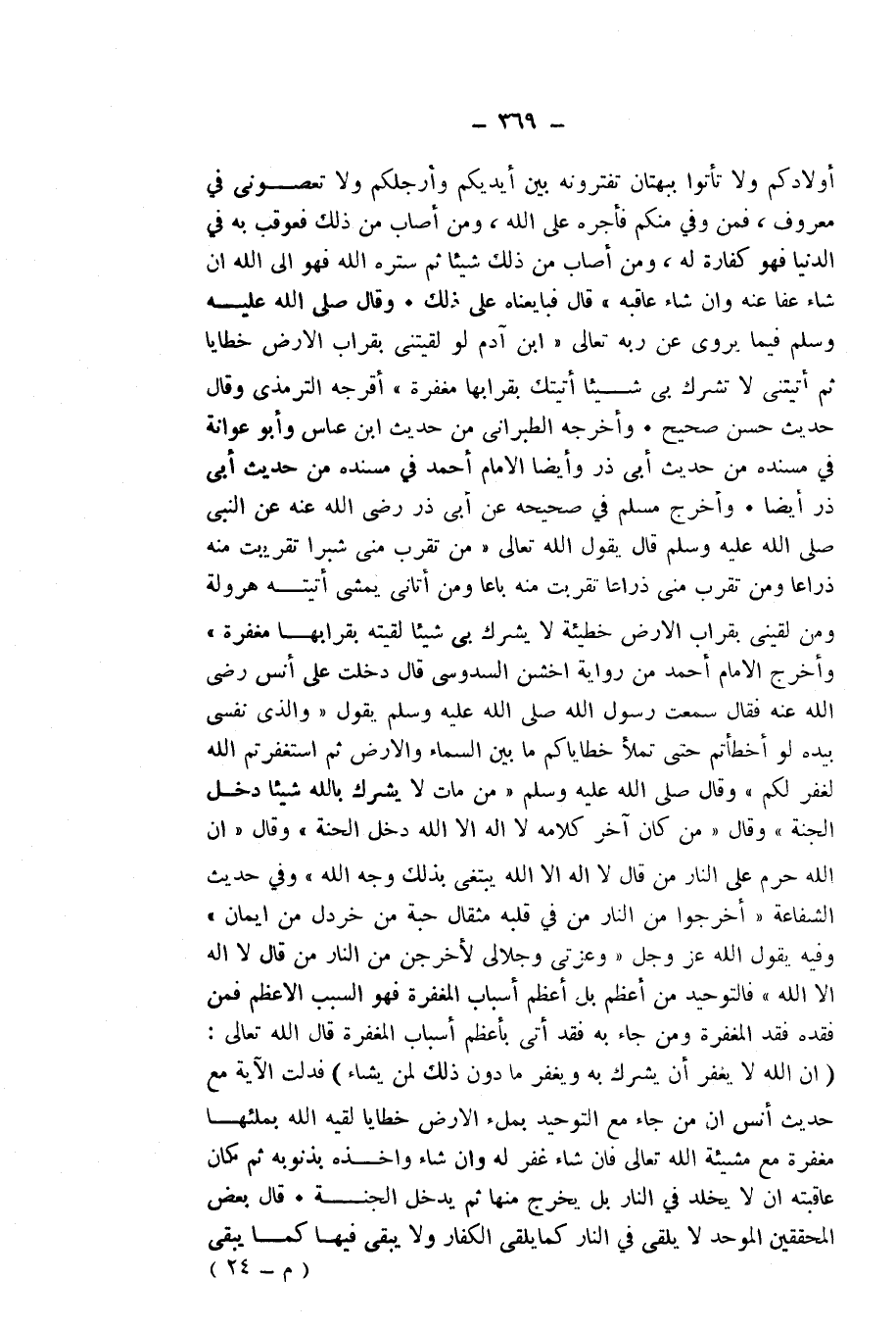 أَوْلَادَكُمْ، وَلَا تَأْتُوا بِبُهْتَانٍ تَفْتَرُونَهُ بَيْنَ أَيْدِيكُمْ وَأَرْجُلِكُمْ، وَلَا تَعْصُونِي فِي مَعْرُوفٍ، فَمَنْ وَفَى مِنْكُمْ فَأَجْرُهُ عَلَى اللَّهِ، وَمَنْ أَصَابَ مِنْ ذَلِكَ فَعُوقِبَ بِهِ فِي الدُّنْيَا فَهُوَ كَفَّارَةٌ لَهُ، وَمَنْ أَصَابَ مِنْ ذَلِكَ شَيْئًا ثُمَّ سَتَرَهُ اللَّهُ فَهُوَ إِلَى اللَّهِ إِنْ شَاءَ عَفَا، وَإِنْ شَاءَ عَاقَبَهُ " قَالَ: فَبَايَعْنَاهُ عَلَى ذَلِكَ» . وَقَالَ - صَلَّى اللَّهُ عَلَيْهِ وَسَلَّمَ - فِيمَا يَرْوِي عَنْ رَبِّهِ - تَعَالَى -: " «ابْنَ آدَمَ لَوْ لَقِيتَنِي بِقُرَابِ الْأَرْضِ خَطَايَا ثُمَّ أَتَيْتَنِي لَا تُشْرِكُ بِي شَيْئًا، أَتَيْتُكَ بِقُرَابِهَا مَغْفِرَةً» " أَخْرَجَهُ التِّرْمِذِيُّ، وَقَالَ: حَدِيثٌ حَسَنٌ صَحِيحٌ. وَأَخْرَجَهُ الطَّبَرَانِيُّ مِنْ حَدِيثِ ابْنِ عَبَّاسٍ، وَأَبُو عَوَانَةَ فِي مُسْنَدِهِ مِنْ حَدِيثِ أَبِي ذَرٍّ، وَأَيْضًا الْإِمَامُ أَحْمَدَ فِي مُسْنَدِهِ مِنْ حَدِيثِ أَبِي ذَرٍّ أَيْضًا.