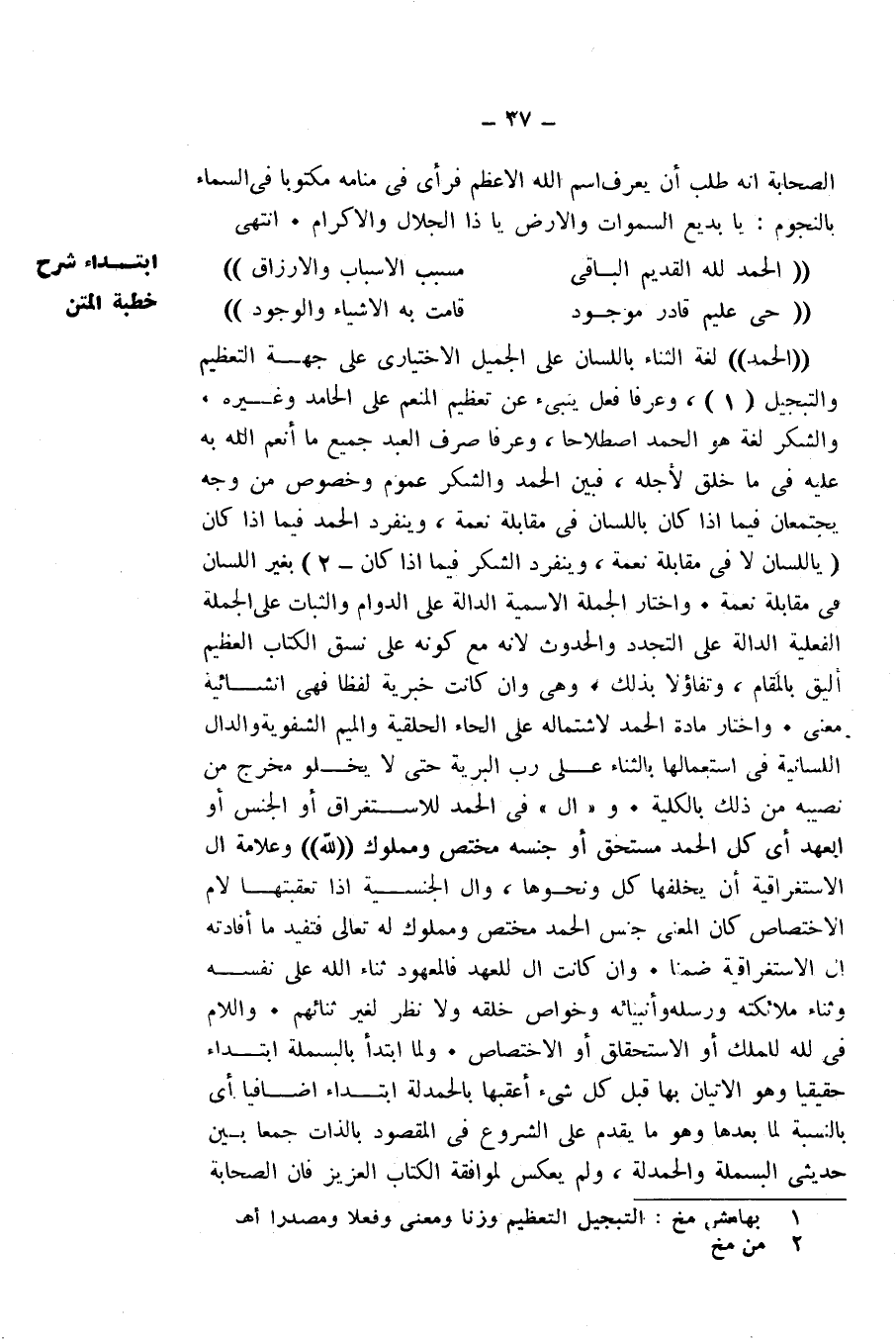 ((الْحَمْدُ)) لُغَةً: الثَّنَاءُ بِاللِّسَانِ عَلَى الْجَمِيلِ الِاخْتِيَارِيِّ عَلَى جِهَةِ التَّعْظِيمِ وَالتَّبْجِيلِ، وَعُرْفًا فِعْلٌ يُنْبِئُ عَنْ تَعْظِيمِ الْمُنْعِمِ عَلَى الْحَامِدِ وَغَيْرِهِ. وَالشُّكْرُ لُغَةً: هُوَ الْحَمْدُ اصْطِلَاحًا، وَعُرْفًا: صَرْفُ الْعَبْدِ جَمِيعَ مَا أَنْعَمَ اللَّهُ بِهِ عَلَيْهِ فِي مَا خُلِقَ لِأَجْلِهِ، فَبَيْنَ الْحَمْدِ وَالشُّكْرِ عُمُومٌ وَخُصُوصٌ مِنْ وَجْهٍ، يَجْتَمِعَانِ فِيمَا إِذَا كَانَ بِاللِّسَانِ فِي مُقَابَلَةِ نِعْمَةٍ، وَيَنْفَرِدُ الْحَمْدُ فِيمَا إِذَا كَانَ (بِاللِّسَانِ لَا فِي مُقَابَلَةِ نِعْمَةٍ، وَيَنْفَرِدُ الشُّكْرُ فِيمَا إِذَا كَانَ) بِغَيْرِ اللِّسَانِ فِي مُقَابَلَةِ نِعْمَةٍ. وَاخْتَارَ الْجُمْلَةَ الِاسْمِيَّةَ الدَّالَّةَ عَلَى الدَّوَامِ وَالثَّبَاتِ عَلَى الْجُمْلَةِ الْفِعْلِيَّةِ الدَّالَّةِ عَلَى التَّجَدُّدِ وَالْحُدُوثِ ; لِأَنَّهُ مَعَ كَوْنِهِ عَلَى نَسَقِ الْكِتَابِ الْعَظِيمِ أَلْيَقُ بِالْمَقَامِ، وَتَفَاؤُلًا بِذَلِكَ. وَهِيَ وَإِنْ كَانَتْ خَبَرِيَّةً لَفْظًا، فَهِيَ إِنْشَائِيَّةٌ مَعْنًى. وَاخْتَارَ مَادَّةَ الْحَمْدِ ; لِاشْتِمَالِهِ عَلَى الْحَاءِ الْحَلْقِيَّةِ، وَالْمِيمِ الشَّفَوِيَّةِ، وَالدَّالِ اللِّسَانِيَّةِ فِي اسْتِعْمَالِهَا بِالثَّنَاءِ عَلَى رَبِّ الْبَرِيَّةِ، حَتَّى لَا يَخْلُوَ مَخْرَجٌ مِنْ نَصِيبِهِ مِنْ ذَلِكَ بِالْكُلِّيَّةِ. وَ " الْ " فِي الْحَمْدِ لِلِاسْتِغْرَاقِ، أَوِ الْجِنْسِ، أَوِ الْعَهْدِ، أَيْ كُلُّ الْحَمْدِ مُسْتَحَقٌّ، أَوْ جِنْسُهُ مُخْتَصٌّ وَمَمْلُوكٌ " لِلَّهِ "، وَعَلَامَةُ الِ الِاسْتِغْرَاقِيَّةِ أَنْ يَخْلُفَهَا كُلٌّ وَنَحْوُهَا، وَالِ الْجِنْسِيَّةُ إِذَا تَعَقَّبَتْهَا لَامُ الِاخْتِصَاصِ كَانَ الْمَعْنَى: جِنْسُ الْحَمْدِ مُخْتَصٌّ وَمَمْلُوكٌ لَهُ - تَعَالَى - فَتُفِيدُ مَا أَفَادَتْهُ الِ الِاسْتِغْرَاقِيَّةُ ضِمْنًا. وَإِنْ كَانَتْ الْ لِلْعَهْدِ، فَالْمَعْهُودُ ثَنَاءُ اللَّهِ عَلَى نَفْسِهِ، وَثَنَاءُ مَلَائِكَتِهِ وَرُسُلِهِ وَأَنْبِيَائِهِ وَخَوَاصِّ خَلْقِهِ، وَلَا نَظَرَ لِغَيْرِ ثَنَائِهِمْ. وَاللَّامُ فِي لِلَّهِ لِلْمِلْكِ أَوِ الِاسْتِحْقَاقِ أَوِ الِاخْتِصَاصِ. وَلَمَّا ابْتَدَأَ بِالْبَسْمَلَةِ ابْتِدَاءً حَقِيقِيًّا، وَهُوَ الْإِتْيَانُ بِهَا قَبْلَ كُلِّ شَيْءٍ أَعْقَبَهَا بِالْحَمْدَلَةِ ابْتِدَاءً إِضَافِيًّا، أَيْ بِالنِّسْبَةِ لِمَا بَعْدَهَا، وَهُوَ مَا يُقَدَّمُ عَلَى الشُّرُوعِ فِي الْمَقْصُودِ بِالذَّاتِ جَمْعًا بَيْنَ حَدِيثَيِ الْبَسْمَلَةِ وَالْحَمْدَلَةِ، وَلَمْ يَعْكِسْ لِمُوَافَقَةِ الْكِتَابِ الْعَزِيزِ، فَإِنَّ الصَّحَابَةَ