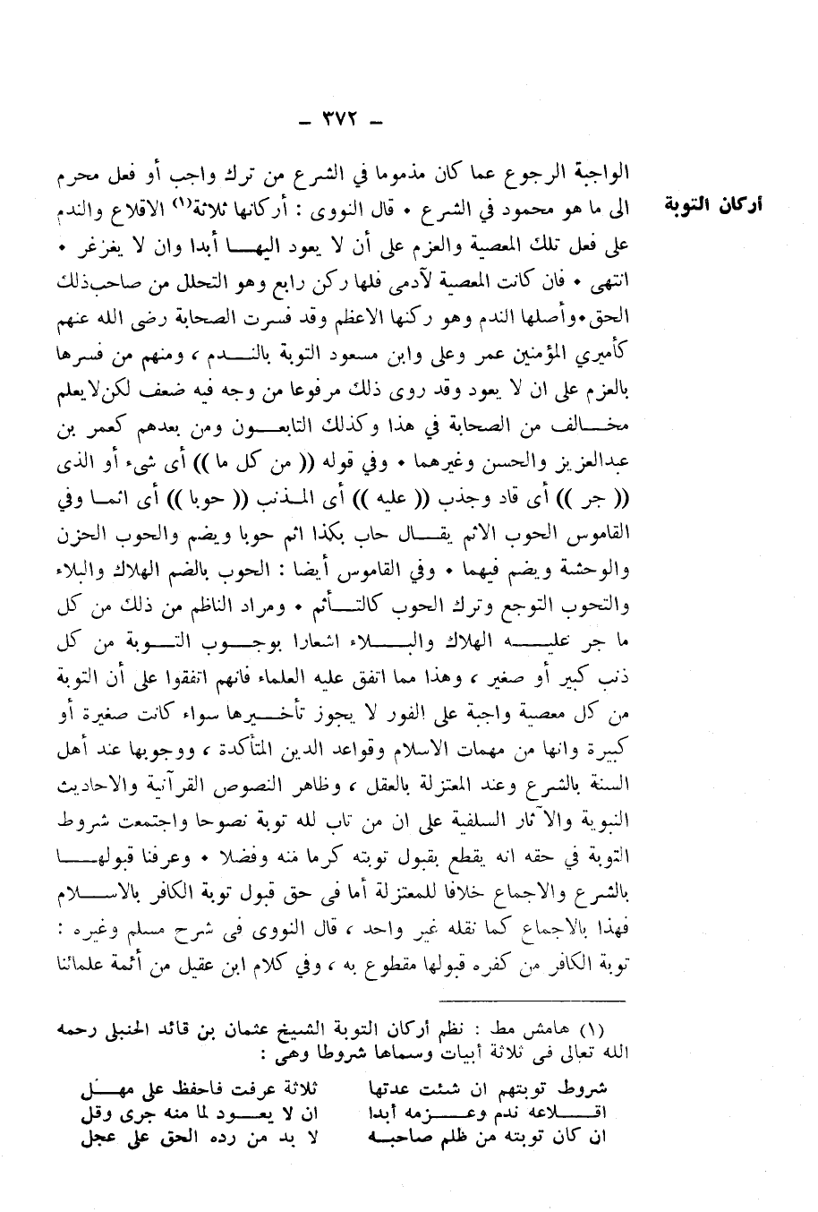 وَمُرَادُ النَّاظِمِ مِنْ ذَلِكَ: مِنْ كُلِّ مَا جَرَّ عَلَيْهِ الْهَلَاكَ وَالْبَلَاءَ؛ إِشْعَارًا بِوُجُوبِ التَّوْبَةِ مَنْ كُلِّ ذَنْبٍ كَبِيرٍ، أَوْ صَغِيرٍ، وَهَذَا مِمَّا اتَّفَقَ عَلَيْهِ الْعُلَمَاءُ، فَإِنَّهُمُ اتَّفَقُوا عَلَى أَنَّ التَّوْبَةَ مِنْ كُلِّ مَعْصِيَةٍ - وَاجِبَةٌ عَلَى الْفَوْرِ، لَا يَجُوزُ تَأْخِيرُهَا، سَوَاءٌ كَانَتْ صَغِيرَةً أَوْ كَبِيرَةً، وَأَنَّهَا مِنْ مُهِمَّاتِ الْإِسْلَامِ وَقَوَاعِدِ الدِّينِ الْمُتَأَكِّدَةِ. وَوُجُوبُهَا عِنْدَ أَهْلِ السُّنَّةِ بِالشَّرْعِ وَعِنْدَ الْمُعْتَزِلَةِ بِالْعَقْلِ. وَظَاهِرُ النُّصُوصِ الْقُرْآنِيَّةِ، وَالْأَحَادِيثِ النَّبَوِيَّةِ، وَالْآثَارِ السَّلَفِيَّةِ عَلَى أَنَّ مَنْ تَابَ لِلَّهِ تَوْبَةً نَصُوحًا وَاجْتَمَعَتْ شُرُوطُ التَّوْبَةِ فِي حَقِّهِ، أَنَّهُ يُقْطَعُ بِقَبُولِ تَوْبَتِهِ كَرَمًا مِنْهُ وَفَضْلًا. وَعَرَفْنَا قَبُولَهَا بِالشَّرْعِ وَالْإِجْمَاعِ خِلَافًا لِلْمُعْتَزِلَةِ، أَمَّا فِي حَقِّ قَبُولِ تَوْبَةِ الْكَافِرِ بِالْإِسْلَامِ، فَهَذِهِ بِالْإِجْمَاعِ كَمَا نَقَلَهُ غَيْرُ وَاحِدٍ، قَالَ النَّوَوِيُّ فِي شَرْحِ مُسْلِمٍ وَغَيْرِهِ: تَوْبَةُ الْكَافِرِ مِنْ كُفْرِهِ قَبُولُهَا مَقْطُوعٌ بِهِ، وَفِي كَلَامِ ابْنِ عَقِيلٍ مِنْ أَئِمَّةِ عُلَمَائِنَا