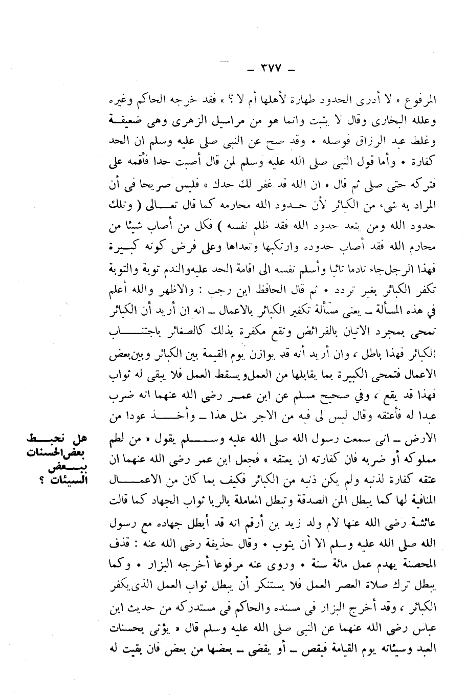 ثُمَّ قَالَ الْحَافِظُ ابْنُ رَجَبٍ: وَالْأَظْهَرُ - وَاللَّهُ أَعْلَمُ - فِي هَذِهِ الْمَسْأَلَةِ، يَعْنِي مَسْأَلَةَ تَكْفِيرِ الْكَبَائِرِ بِالْأَعْمَالِ - أَنَّهُ إِنْ أُرِيدَ أَنَّ الْكَبَائِرَ تُمْحَى بِمُجَرَّدِ الْإِتْيَانِ بِالْفَرَائِضِ، وَتَقَعُ مُكَفَّرَةً بِذَلِكَ كَالصَّغَائِرِ بِاجْتِنَابِ الْكَبَائِرِ؛ فَهَذَا بَاطِلٌ، وَإِنْ أُرِيدَ أَنَّهُ قَدْ يُوَازَنُ يَوْمَ الْقِيَامَةِ بَيْنَ الْكَبَائِرِ وَبَيْنَ بَعْضِ الْأَعْمَالِ فَتُمْحَى الْكَبِيرَةُ بِمَا يُقَابِلُهَا مِنَ الْعَمَلِ وَيَسْقُطُ الْعَمَلُ فَلَا يَبْقَى لَهُ ثَوَابٌ، فَهَذَا قَدْ يَقَعُ، وَفِي صَحِيحِ مُسْلِمٍ عَنِ ابْنِ عُمَرَ - رَضِيَ اللَّهُ عَنْهُمَا - «أَنَّهُ ضَرَبَ عَبْدًا لَهُ، فَأَعْتَقَهُ وَقَالَ: لَيْسَ لِي فِيهِ مِنَ الْأَجْرِ مِثْلُ هَذَا - وَأَخَذَ عُودًا مِنَ الْأَرْضِ - إِنِّي سَمِعْتُ رَسُولَ اللَّهِ - صَلَّى اللَّهُ عَلَيْهِ وَسَلَّمَ - يَقُولُ: " مَنْ لَطَمَ مَمْلُوكَهُ، أَوْ ضَرَبَهُ فَإِنَّ كَفَّارَتَهُ أَنْ يُعْتِقَهُ» " فَجَعَلَ ابْنُ عُمَرَ - رَضِيَ اللَّهُ عَنْهُمَا - أَنَّ عِتْقَهُ كَفَّارَةٌ لِذَنْبِهِ وَلَمْ يَكُنْ ذَنْبُهُ مِنَ الْكَبَائِرِ، فَكَيْفَ بِمَا كَانَ مِنَ الْأَعْمَالِ الْمُنَافِيَةِ لَهَا؛ كَمَا يُبْطِلُ الْمَنُّ الصَّدَقَةَ، وَتُبْطِلُ الْمُعَامَلَةُ بِالرِّبَا ثَوَابَ الْجِهَادِ، كَمَا قَالَتْ عَائِشَةُ - رَضِيَ اللَّهُ عَنْهَا - لِأُمِّ وَلَدِ زَيْدِ بْنِ أَرْقَمَ: إِنَّهُ قَدْ أَبْطَلَ جِهَادَهُ مَعَ رَسُولِ اللَّهِ - صَلَّى اللَّهُ عَلَيْهِ وَسَلَّمَ - إِلَّا أَنْ يَتُوبَ. وَقَالَ حُذَيْفَةُ - رَضِيَ اللَّهُ عَنْهُ -: قَذْفُ الْمُحْصَنَةِ يَهْدِمُ عَمَلَ مِائَةِ سَنَةٍ. وَرُوِيَ عَنْهُ مَرْفُوعًا، أَخْرَجَهُ الْبَزَّارُ. وَكَمَا يُبْطِلُ تَرْكُ صَلَاةِ الْعَصْرِ الْعَمَلَ، فَلَا يُسْتَنْكَرُ أَنْ يُبْطِلَ ثَوَابَ الْعَمَلِ الَّذِي يُكَفَّرُ - الْكَبَائِرُ، وَقَدْ أَخْرَجَ الْبَزَّارُ فِي مُسْنَدِهِ، وَالْحَاكِمُ فِي مُسْتَدْرَكِهِ مِنْ حَدِيثِ ابْنِ عَبَّاسٍ - رَضِيَ اللَّهُ عَنْهُمَا - عَنِ النَّبِيِّ - صَلَّى اللَّهُ عَلَيْهِ وَسَلَّمَ - قَالَ: " «يُؤْتَى بِحَسَنَاتِ الْعَبْدِ وَسَيِّئَاتِهِ يَوْمَ الْقِيَامَةِ فَيُقَصُّ - أَوْ يُقْضَى - بَعْضُهَا مِنْ بَعْضٍ، فَإِنْ بَقِيَتْ لَهُ