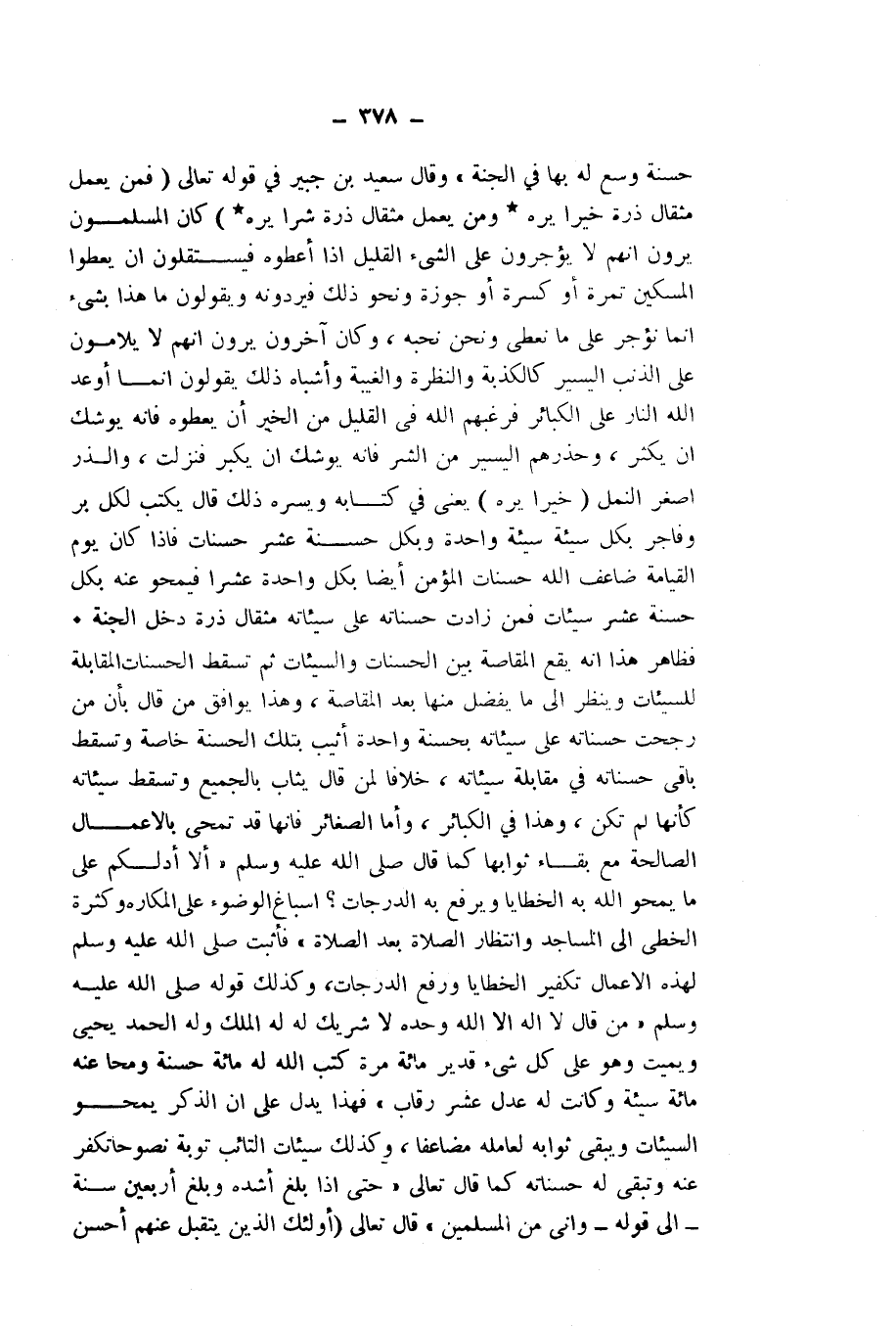 حَسَنَةٌ وُسِّعَ لَهُ بِهَا فِي الْجَنَّةِ» " وَقَالَ سَعِيدُ بْنُ جُبَيْرٍ فِي قَوْلِهِ - تَعَالَى -: « {فَمَنْ يَعْمَلْ مِثْقَالَ ذَرَّةٍ خَيْرًا يَرَهُ - وَمَنْ يَعْمَلْ مِثْقَالَ ذَرَّةٍ شَرًّا يَرَهُ} [الزلزلة: 7 - 8] كَانَ الْمُسْلِمُونَ يَرَوْنَ أَنَّهُمْ لَا يُؤْجَرُونَ عَلَى الشَّيْءِ الْقَلِيلِ إِذَا أَعْطُوهُ، فَيَسْتَقِلُّونَ أَنْ يُعْطُوا الْمِسْكِينَ تَمْرَةً، أَوْ كِسْرَةً، أَوْ جَوْزَةً، وَنَحْوَ ذَلِكَ، فَيَرُدُّونَهُ وَيَقُولُونَ مَا هَذَا بِشَيْءٍ، إِنَّمَا نُؤْجَرُ عَلَى مَا نُعْطِي وَنَحْنُ نُحِبُّهُ، وَكَانَ آخَرُونَ يَرَوْنَ أَنَّهُمْ لَا يُلَامُونَ عَلَى الذَّنْبِ الْيَسِيرِ كَالْكَذْبَةِ، وَالنَّظْرَةِ، وَالْغَيْبَةِ وَأَشْبَاهِ ذَلِكَ، يَقُولُونَ: إِنَّمَا أَوْعَدَ اللَّهُ النَّارَ عَلَى الْكَبَائِرِ، فَرَغَّبَهُمُ اللَّهُ فِي الْقَلِيلِ مِنَ الْخَيْرِ أَنْ يُعْطُوهُ، فَإِنَّهُ يُوشِكُ أَنْ يَكْثُرَ، وَحَذَّرَهُمُ الْيَسِيرَ مِنَ الشَّرِّ فَإِنَّهُ يُوشِكُ أَنْ يَكْبُرَ فَنَزَلَتْ» ، وَالذَّرُّ أَصْغَرُ النَّمْلِ خَيْرًا يَرَهُ يَعْنِي فِي كِتَابِهِ، وَيَسُرُّهُ ذَلِكَ، قَالَ: يَكْتُبُ لِكُلِّ بَرٍّ وَفَاجِرٍ بِكُلِّ سَيِّئَةٍ سَيِّئَةً وَاحِدَةً، وَبِكُلِّ حَسَنَةٍ عَشَرَةَ حَسَنَاتٍ، فَإِذَا كَانَ يَوْمُ الْقِيَامَةِ؛ ضَاعَفَ اللَّهُ حَسَنَاتِ الْمُؤْمِنِ أَيْضًا، بِكُلِّ وَاحِدَةٍ عَشْرًا، فَيَمْحُو عَنْهُ بِكُلِّ حَسَنَةٍ عَشْرَ سَيِّئَاتٍ، فَمَنْ زَادَتْ حَسَنَاتُهُ عَلَى سَيِّئَاتِهِ مِثْقَالَ ذَرَّةِ؛ دَخَلَ الْجَنَّةَ.