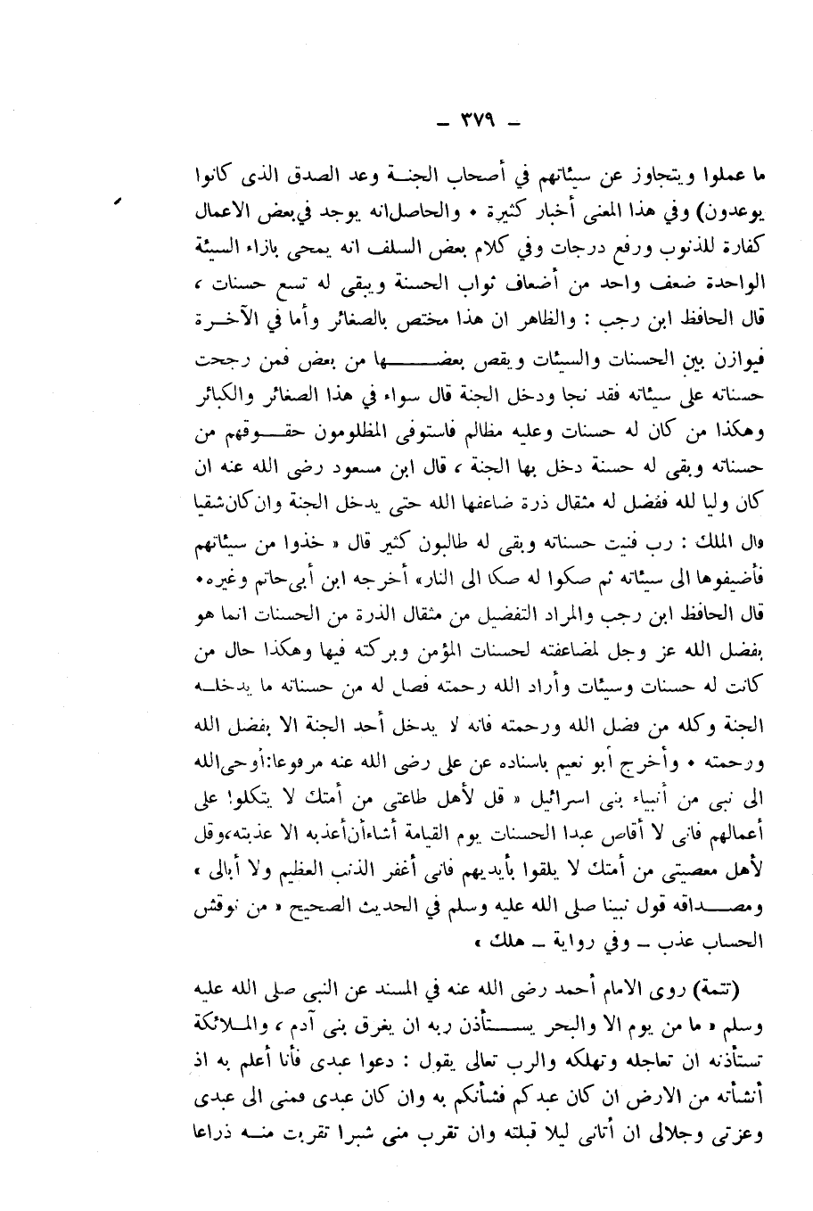 وَأَخْرَجَ أَبُو نُعَيْمٍ بِإِسْنَادِهِ عَنْ عَلِيٍّ - رَضِيَ اللَّهُ عَنْهُ - مَرْفُوعًا: " «أَوْحَى اللَّهُ إِلَى نَبِيٍّ مِنْ أَنْبِيَاءِ بَنِي إِسْرَائِيلَ: قُلْ لِأَهْلِ طَاعَتِي مِنْ أُمَّتِكَ لَا يَتَّكِلُوا عَلَى أَعْمَالِهِمْ فَإِنِّي لَا أُقَاصُّ عَبْدًا الْحَسَنَاتِ يَوْمَ الْقِيَامَةِ، إِنْ أَشَاءُ أُعَذِّبُهُ إِلَّا عَذَّبْتُهُ، وَقُلْ لِأَهْلِ مَعْصِيَتِي مِنْ أُمَّتِكَ لَا يُلْقُوا بِأَيْدِيهِمْ فَإِنِّي أَغْفِرُ الذَّنْبَ الْعَظِيمَ وَلَا أُبَالِي» " وَمِصْدَاقُهُ قَوْلُ نَبِيِّنَا - صَلَّى اللَّهُ عَلَيْهِ وَسَلَّمَ - فِي الْحَدِيثِ الصَّحِيحِ: " «مَنْ نُوقِشَ الْحِسَابَ عُذِّبَ - وَفِي رِوَايَةٍ - هَلَكَ» ".