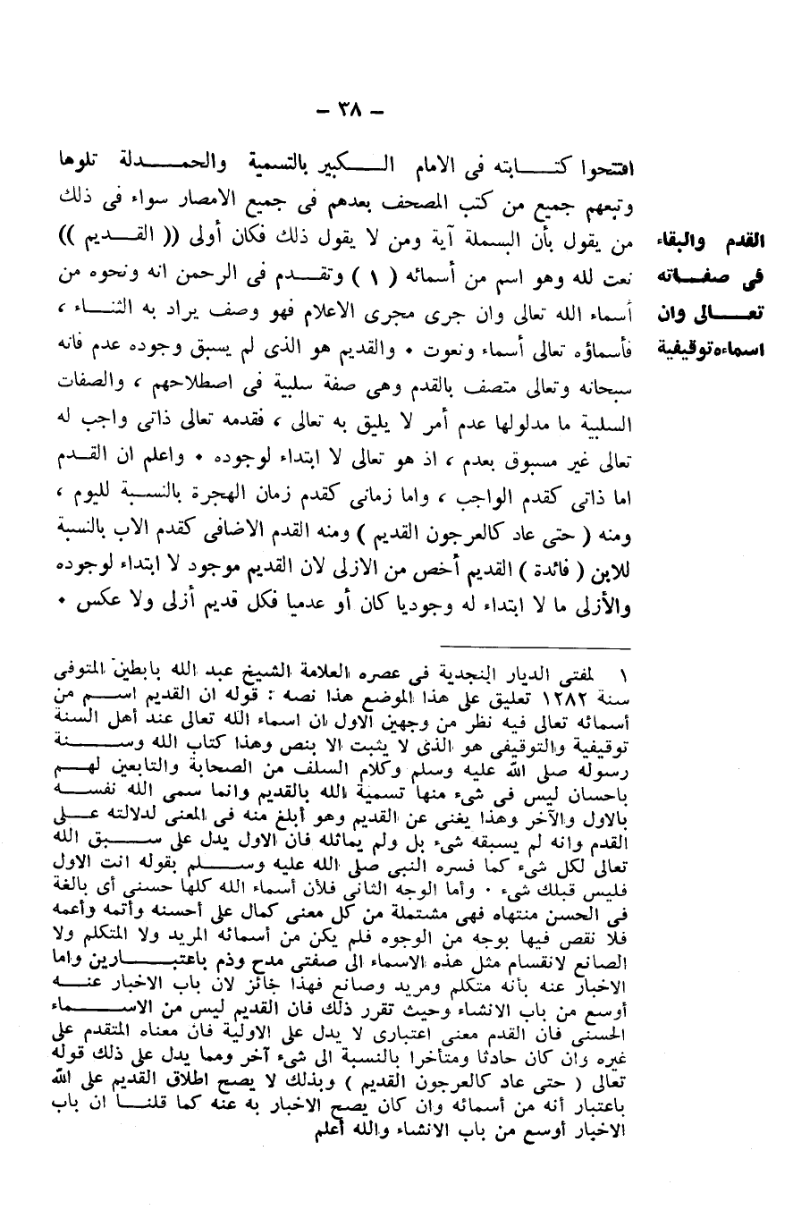 (الْقَدِيمِ) نَعْتٌ لِلَّهِ، وَهُوَ اسْمٌ مِنْ أَسْمَائِهِ، وَتَقَدَّمَ فِي الرَّحْمَنِ أَنَّهُ وَنَحْوَهُ مِنْ أَسْمَاءِ اللَّهِ - تَعَالَى - وَإِنْ جَرَى مَجْرَى الْأَعْلَامِ، فَهُوَ وَصْفٌ يُرَادُ بِهِ الثَّنَاءُ، فَأَسْمَاؤُهُ - تَعَالَى - أَسْمَاءٌ وَنُعُوتٌ. وَالْقَدِيمُ هُوَ الَّذِي لَمْ يَسْبِقْ وُجُودَهُ عَدَمٌ، فَإِنَّهُ - سُبْحَانَهُ وَتَعَالَى - مُتَّصِفٌ بِالْقِدَمِ، وَهِيَ صِفَةٌ سَلْبِيَّةٌ فِي اصْطِلَاحِهِمْ، وَالصِّفَاتُ السَّلْبِيَّةُ مَا مَدْلُولُهَا عَدَمُ أَمْرٍ لَا يَلِيقُ بِهِ - تَعَالَى، فَقِدَمُهُ - تَعَالَى - ذَاتِيٌّ وَاجِبٌ لَهُ - تَعَالَى، غَيْرُ مَسْبُوقٍ بِعَدَمٍ، إِذْ هُوَ - تَعَالَى - لَا ابْتِدَاءَ لِوُجُودِهِ. وَاعْلَمْ أَنَّ الْقِدَمَ إِمَّا ذَاتِيٌّ كَقِدَمِ الْوَاجِبِ، وَإِمَّا زَمَانِيٌّ كَقِدَمِ زَمَانِ الْهِجْرَةِ بِالنِّسْبَةِ لِلْيَوْمِ، وَمِنْهُ {حَتَّى عَادَ كَالْعُرْجُونِ الْقَدِيمِ} [يس: 39] ، وَمِنْهُ الْقِدَمُ الْإِضَافِيُّ كَقِدَمِ الْأَبِ بِالنِّسْبَةِ لِلِابْنِ.