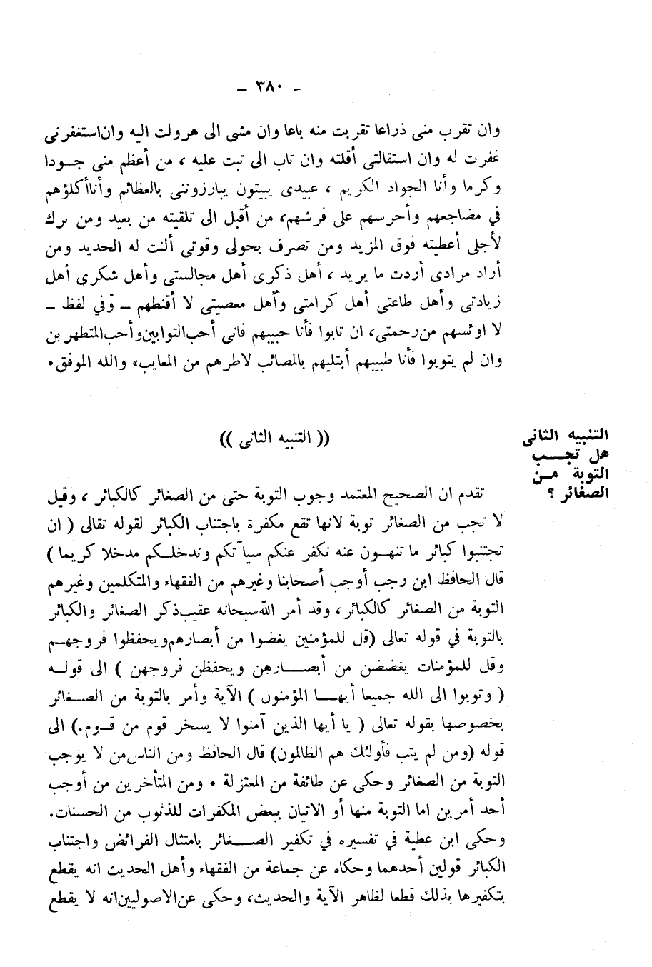 ((التَّنْبِيهُ الثَّانِي)) تَقَدَّمَ أَنَّ الصَّحِيحَ الْمُعْتَمَدَ وُجُوبُ التَّوْبَةِ حَتَّى مِنَ الصَّغَائِرِ كَالْكَبَائِرِ، وَقِيلَ: لَا تَجِبُ مِنَ الصَّغَائِرِ تَوْبَةٌ ; لِأَنَّهَا تَقَعُ مُكَفَّرَةً بِاجْتِنَابِ الْكَبَائِرِ؛ لِقَوْلِهِ - تَعَالَى -: {إِنْ تَجْتَنِبُوا كَبَائِرَ مَا تُنْهَوْنَ عَنْهُ نُكَفِّرْ عَنْكُمْ سَيِّئَاتِكُمْ وَنُدْخِلْكُمْ مُدْخَلًا كَرِيمًا} [النساء: 31] قَالَ الْحَافِظُ ابْنُ رَجَبٍ: أَوْجَبَ أَصْحَابُنَا وَغَيْرُهُمْ مِنَ الْفُقَهَاءِ وَالْمُتَكَلِّمِينَ وَغَيْرِهِمُ التَّوْبَةَ مِنَ الصَّغَائِرِ كَالْكَبَائِرِ، وَقَدْ أَمَرَ اللَّهُ - سُبْحَانَهُ - عَقِيبَ ذِكْرِ الصَّغَائِرِ وَالْكَبَائِرِ بِالتَّوْبَةِ فِي قَوْلِهِ - تَعَالَى -: {قُلْ لِلْمُؤْمِنِينَ يَغُضُّوا مِنْ أَبْصَارِهِمْ وَيَحْفَظُوا فُرُوجَهُمْ - وَقُلْ لِلْمُؤْمِنَاتِ يَغْضُضْنَ مِنْ أَبْصَارِهِنَّ وَيَحْفَظْنَ فُرُوجَهُنَّ} [النور: 30 - 31] إِلَى قَوْلِهِ: {وَتُوبُوا إِلَى اللَّهِ جَمِيعًا أَيُّهَا الْمُؤْمِنُونَ} [النور: 31] الْآيَةَ، وَأَمَرَ بِالتَّوْبَةِ مِنَ الصَّغَائِرِ بِخُصُوصِهَا بِقَوْلِهِ - تَعَالَى -: {يَاأَيُّهَا الَّذِينَ آمَنُوا لَا يَسْخَرْ قَومٌ مِنْ قَوْمٍ} [الحجرات: 11] إِلَى قَوْلِهِ: {وَمَنْ لَمْ يَتُبْ فَأُولَئِكَ هُمُ الظَّالِمُونَ} [الحجرات: 11] قَالَ الْحَافِظُ: وَمِنَ النَّاسِ مَنْ لَا يُوجِبُ التَّوْبَةَ مِنَ الصَّغَائِرِ، وَحُكِيَ عَنْ طَائِفَةٍ مِنَ الْمُعْتَزِلَةِ. وَمِنَ الْمُتَأَخِّرِينَ مَنْ أَوْجَبَ أَحَدَ أَمْرَيْنِ، إِمَّا التَّوْبَةَ مِنْهَا أَوِ الْإِتْيَانَ بِبَعْضِ الْمُكَفِّرَاتِ لِلذُّنُوبِ مِنَ الْحَسَنَاتِ. وَحَكَى ابْنُ عَطِيَّةَ فِي تَفْسِيرِهِ فِي تَكْفِيرِ الصَّغَائِرِ بِامْتِثَالِ الْفَرَائِضِ وَاجْتِنَابِ الْكَبَائِرِ قَوْلَيْنِ: أَحَدُهُمَا: وَحَكَاهُ عَنْ جَمَاعَةٍ مِنَ الْفُقَهَاءِ وَأَهْلِ الْحَدِيثِ أَنَّهُ يَقْطَعُ بِتَكْفِيرِهَا بِذَلِكَ قَطْعًا لِظَاهِرِ الْآيَةِ وَالْحَدِيثِ، وَحَكَى عَنِ الْأُصُولِيِّينَ أَنَّهُ لَا يُقْطَعُ