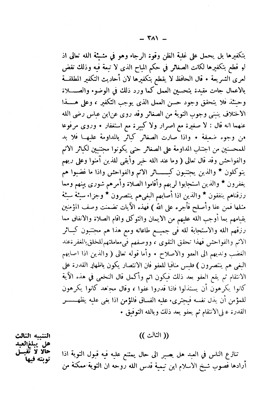 قَالَ الْحَافِظُ: لَا يُقْطَعُ بِتَكْفِيرِهَا ; لِأَنَّ أَحَادِيثَ التَّكْفِيرِ الْمُطْلَقَةَ بِالْأَعْمَالِ جَاءَتْ مُقَيَّدَةً بِتَحْسِينِ الْعَمَلِ، كَمَا وَرَدَ ذَلِكَ فِي الْوُضُوءِ، وَالصَّلَاةِ، وَحِينَئِذٍ فَلَا يَتَحَقَّقُ وُجُودُ حُسْنِ الْعَمَلِ الَّذِي يُوجِبُ التَّكْفِيرَ، وَعَلَى هَذَا الِاخْتِلَافِ يَنْبَنِي وُجُوبُ التَّوْبَةِ مِنَ الصَّغَائِرِ، وَقَدْ رُوِيَ عَنِ ابْنِ عَبَّاسٍ - رَضِيَ اللَّهُ عَنْهُمَا - أَنَّهُ قَالَ: لَا صَغِيرَةَ مَعَ إِصْرَارٍ وَلَا كَبِيرَةَ مَعَ اسْتِغْفَارٍ. وَرُوِيَ مَرْفُوعًا مِنْ وُجُوهٍ ضَعِيفَةٍ، وَإِذَا صَارَتِ الصَّغَائِرُ كَبَائِرَ بِالْمُدَاوَمَةِ عَلَيْهَا فَلَا بُدَّ لِلْمُحْسِنِينَ مِنِ اجْتِنَابِ الْمُدَاوَمَةِ عَلَى الصَّغَائِرِ ; حَتَّى يَكُونُوا مُجْتَنِبِينَ لِكَبَائِرِ الْإِثْمِ وَالْفَوَاحِشِ، وَقَدْ قَالَ - تَعَالَى -: {وَمَا عِنْدَ اللَّهِ خَيْرٌ وَأَبْقَى لِلَّذِينَ آمَنُوا وَعَلَى رَبِّهِمْ يَتَوَكَّلُونَ - وَالَّذِينَ يَجْتَنِبُونَ كَبَائِرَ الْإِثْمِ وَالْفَوَاحِشَ وَإِذَا مَا غَضِبُوا هُمْ يَغْفِرُونَ - وَالَّذِينَ اسْتَجَابُوا لِرَبِّهِمْ وَأَقَامُوا الصَّلَاةَ وَأَمْرُهُمْ شُورَى بَيْنَهُمْ وَمِمَّا رَزَقْنَاهُمْ يُنْفِقُونَ - وَالَّذِينَ إِذَا أَصَابَهُمُ الْبَغْيُ هُمْ يَنْتَصِرُونَ - وَجَزَاءُ سَيِّئَةٍ سَيِّئَةٌ مِثْلُهَا فَمَنْ عَفَا وَأَصْلَحَ فَأَجْرُهُ عَلَى اللَّهِ} [الشورى: 36 - 40] فَهَذِهِ الْآيَاتُ تَضَمَّنَتْ وَصْفَ الْمُؤْمِنِينَ بِقِيَامِهِمْ بِمَا أَوْجَبَ اللَّهُ عَلَيْهِمْ مِنَ الْإِيمَانِ، وَالتَّوَكُّلِ، وَإِقَامِ الصَّلَاةِ، وَالْإِنْفَاقِ مِمَّا رَزَقَهُمُ اللَّهُ، وَالِاسْتِجَابَةِ لِلَّهِ فِي جَمِيعِ طَاعَاتِهِ، وَمَعَ هَذَا هُمْ مُجْتَنِبُونَ كَبَائِرَ الْإِثْمِ وَالْفَوَاحِشِ، فَهَذَا تَحَقُّقُ التَّقْوَى، وَوَصَفَهُمْ فِي مُعَامَلَتِهِمْ لِلْخَلْقِ بِالْمَغْفِرَةِ عِنْدَ الْغَضَبِ، وَنَدَبَهُمْ إِلَى الْعَفْوِ، وَالْإِصْلَاحِ. وَأَمَّا قَوْلُهُ - تَعَالَى -: {وَالَّذِينَ إِذَا أَصَابَهُمُ الْبَغْيُ هُمْ يَنْتَصِرُونَ} [الشورى: 39] فَلَيْسَ مُنَافِيًا لِلْعَفْوِ، فَإِنَّ الِانْتِصَارَ يَكُونُ بِإِظْهَارِ الْقُدْرَةِ عَلَى الِانْتِقَامِ، ثُمَّ يَقَعُ الْعَفْوُ بَعْدَ ذَلِكَ، فَيَكُونُ أَتَمَّ وَأَكْمَلَ، قَالَ النَّخَعِيُّ: فِي هَذِهِ الْآيَةِ كَانُوا يَكْرَهُونَ أَنْ يُسْتَذَلُّوا، فَإِذَا قَدَرُوا عَفَوْا، وَقَالَ مُجَاهِدٌ: كَانُوا يَكْرَهُونَ لِلْمُؤْمِنِ أَنْ يُذِلَّ نَفْسَهُ فَيَجْتَرِئَ عَلَيْهِ الْفُسَّاقُ، فَالْمُؤْمِنُ إِذَا بُغِيَ عَلَيْهِ يُظْهِرُ الْقُدْرَةَ عَلَى الِانْتِقَامِ، ثُمَّ يَعْفُو بَعْدَ ذَلِكَ، وَبِاللَّهِ التَّوْفِيقُ.
