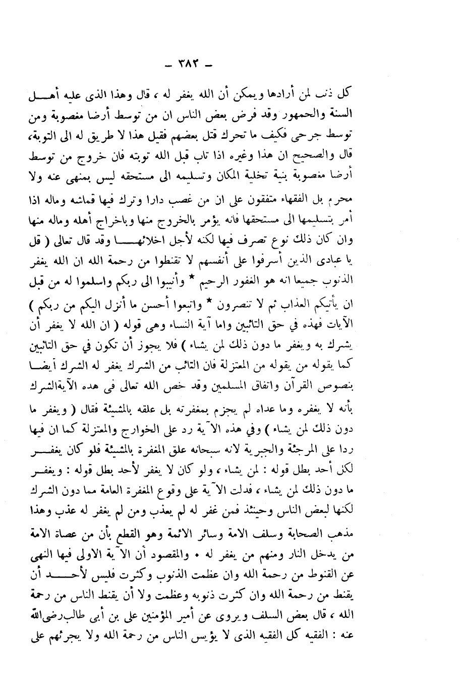 كُلِّ ذَنْبٍ لِمَنْ أَرَادَهَا، وَيُمْكِنُ أَنَّ اللَّهَ يَغْفِرُ لَهُ، قَالَ: وَهَذَا الَّذِي عَلَيْهِ أَهْلُ السُّنَّةِ وَالْجُمْهُورُ، وَقَدْ فَرَضَ بَعْضُ النَّاسِ أَنَّ مَنْ تَوَسَّطَ أَرْضًا مَغْصُوبَةً، وَمَنْ تَوَسَّطَ جَرْحَى، فَكَيْفَ مَا تَحَرَّكَ قَتَلَ بَعْضَهُمْ، فَقِيلَ: هَذَا لَا طَرِيقَ لَهُ إِلَى التَّوْبَةِ، قَالَ: وَالصَّحِيحُ أَنَّ هَذَا وَغَيْرَهُ إِذَا تَابَ قَبِلَ اللَّهُ تَوْبَتَهُ، فَإِنَّ خُرُوجَ مَنْ تَوَسَّطَ أَرْضًا مَغْصُوبَةً بِنِيَّةِ تَخْلِيَةِ الْمَكَانِ وَتَسْلِيمِهِ إِلَى مُسْتَحِقِّهِ لَيْسَ بِمَنْهِيٍّ عَنْهُ، وَلَا مُحَرَّمٍ، بَلِ الْفُقَهَاءُ مُتَّفِقُونَ عَلَى أَنَّ مَنْ غَصَبَ دَارًا، وَتَرَكَ فِيهَا قُمَاشَهُ وَمَالَهُ إِذَا أُمِرَ بِتَسْلِيمِهَا إِلَى مُسْتَحِقِّهَا، فَإِنَّهُ يُؤْمَرُ بِالْخُرُوجِ مِنْهَا وَبِإِخْرَاجِ أَهْلِهِ وَمَالِهِ مِنْهَا، وَإِنْ كَانَ ذَلِكَ نَوْعَ تَصَرُّفٍ فِيهَا، لَكِنَّهُ لِأَجْلِ إِخْلَائِهَا، وَقَدْ قَالَ - تَعَالَى -: {قُلْ يَاعِبَادِيَ الَّذِينَ أَسْرَفُوا عَلَى أَنْفُسِهِمْ لَا تَقْنَطُوا مِنْ رَحْمَةِ اللَّهِ - إِنَّ اللَّهَ يَغْفِرُ الذُّنُوبَ جَمِيعًا إِنَّهُ هُوَ الْغَفُورُ الرَّحِيمُ - وَأَنِيبُوا إِلَى رَبِّكُمْ وَأَسْلِمُوا لَهُ مِنْ قَبْلِ أَنْ يَأْتِيَكُمُ الْعَذَابُ ثُمَّ لَا تُنْصَرُونَ - وَاتَّبِعُوا أَحْسَنَ مَا أُنْزِلَ إِلَيْكُمْ مِنْ رَبِّكُمْ} [الزمر: 53 - 55] الْآيَاتِ، فَهَذِهِ فِي حَقِّ التَّائِبِينَ، وَأَمَّا آيَةُ سُورَةِ النِّسَاءِ وَهِيَ قَوْلُهُ: {إِنَّ اللَّهَ لَا يَغْفِرُ أَنْ يُشْرَكَ بِهِ وَيَغْفِرُ مَا دُونَ ذَلِكَ لِمَنْ يَشَاءُ} [النساء: 48] فَلَا يَجُوزُ أَنْ تَكُونَ فِي حَقِّ التَّائِبِينَ، كَمَا يَقُولُهُ مَنْ يَقُولُهُ مِنَ الْمُعْتَزِلَةِ، فَإِنَّ التَّائِبَ مِنَ الشِّرْكِ يُغْفَرُ لَهُ الشِّرْكُ أَيْضًا بِنُصُوصِ الْقُرْآنِ وَاتِّفَاقِ الْمُسْلِمِينَ، وَقَدْ خَصَّ اللَّهُ - تَعَالَى - فِي هَذِهِ الْآيَةِ الشِّرْكَ بِأَنَّهُ لَا يَغْفِرُهُ، وَمَا عَدَاهُ لَمْ يَجْزِمْ بِمَغْفِرَتِهِ بَلْ عَلَّقَهُ بِالْمَشِيئَةِ فَقَالَ: {وَيَغْفِرُ مَا دُونَ ذَلِكَ لِمَنْ يَشَاءُ} [النساء: 48] وَفِي هَذِهِ الْآيَةِ رَدٌّ عَلَى الْخَوَارِجِ وَالْمُعْتَزِلَةِ، كَمَا أَنَّ فِيهَا رَدًّا عَلَى الْمُرْجِئَةِ وَالْجَبْرِيَّةِ ; لِأَنَّهُ - سُبْحَانَهُ - عَلَّقَ الْمَغْفِرَةَ بِالْمَشِيئَةِ، فَلَوْ كَانَ يَغْفِرُ لِكُلِّ أَحَدٍ بَطَلَ قَوْلُهُ: لِمَنْ يَشَاءُ، وَلَوْ كَانَ لَا يَغْفِرُ لِأَحَدٍ؛ بَطَلَ قَوْلُهُ: وَيَغْفِرُ مَا دُونَ ذَلِكَ لِمَنْ يَشَاءُ، فَدَلَّتِ الْآيَةُ عَلَى وُقُوعِ الْمَغْفِرَةِ الْعَامَّةِ مِمَّا دُونَ الشِّرْكِ، لَكِنَّهَا لِبَعْضِ النَّاسِ، وَحِينَئِذٍ فَمَنْ غُفِرَ لَهُ لَمْ يُعَذَّبْ، وَمَنْ لَمْ يُغْفَرْ لَهُ عُذِّبَ، وَهَذَا مَذْهَبُ الصَّحَابَةِ وَسَلَفِ الْأُمَّةِ وَسَائِرِ الْأَئِمَّةِ، وَهُوَ الْقَطْعُ بِأَنَّ مِنْ عُصَاةِ الْأُمَّةِ مَنْ يَدْخُلُ النَّارَ، وَمِنْهُمْ مَنْ يُغْفَرُ لَهُ.