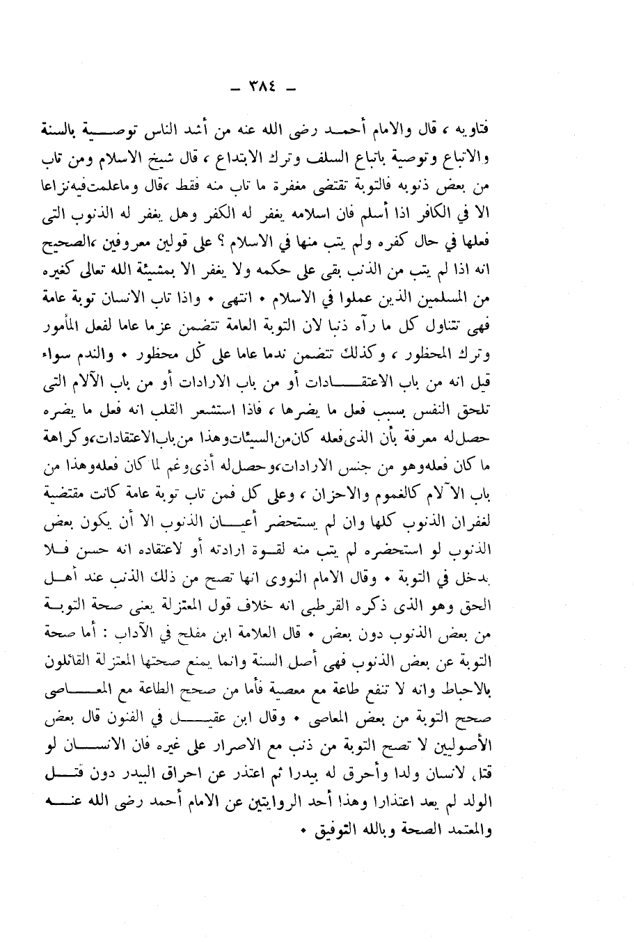 فَتَاوِيهِ، قَالَ: وَالْإِمَامُ أَحْمَدُ - رَضِيَ اللَّهُ عَنْهُ - مِنْ أَشَدِّ النَّاسِ تَوْصِيَةً بِالسُّنَّةِ، وَالِاتِّبَاعِ، وَتَوْصِيَةً بِاتِّبَاعِ السَّلَفِ، وَتَرْكِ الِابْتِدَاعِ، قَالَ شَيْخُ الْإِسْلَامِ: وَمَنْ تَابَ مِنْ بَعْضِ ذُنُوبِهِ فَالتَّوْبَةُ تَقْتَضِي مَغْفِرَةَ مَا تَابَ مِنْهُ فَقَطْ، قَالَ: وَمَا عَلِمْتُ فِيهِ نِزَاعًا إِلَّا فِي الْكَافِرِ إِذَا أَسْلَمَ فَإِنَّ إِسْلَامَهُ يَغْفِرُ لَهُ الْكُفْرَ، وَهَلْ يَغْفِرُ لَهُ الذُّنُوبَ الَّتِي فَعَلَهَا فِي حَالِ كُفْرِهِ، وَلَمْ يَتُبْ مِنْهَا فِي الْإِسْلَامِ؟ عَلَى قَوْلَيْنِ مَعْرُوفَيْنِ، الصَّحِيحُ أَنَّهُ إِذَا لَمْ يَتُبْ مِنَ الذَّنْبِ بَقِيَ عَلَى حُكْمِهِ وَلَا يُغْفَرُ إِلَّا بِمَشِيئَةِ اللَّهِ - تَعَالَى، كَغَيْرِهِ مِنَ الْمُسْلِمِينَ الَّذِينَ عَمِلُوا فِي الْإِسْلَامِ. انْتَهَى.