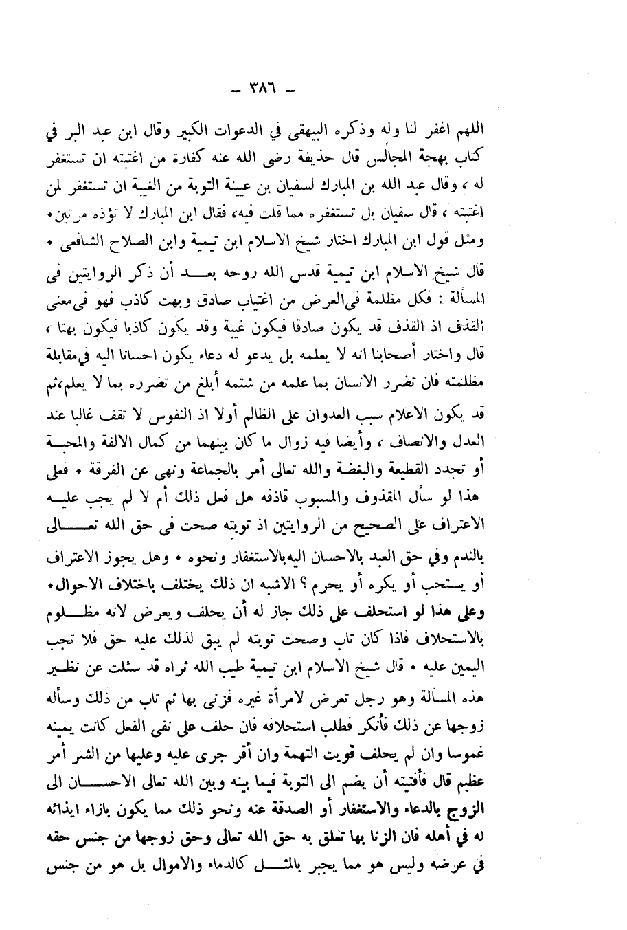 وَمِثْلَ قَوْلِ ابْنِ الْمُبَارَكِ اخْتَارَ شَيْخُ الْإِسْلَامِ ابْنُ تَيْمِيَّةَ وَابْنُ الصَّلَاحِ الشَّافِعِيُّ. قَالَ شَيْخُ الْإِسْلَامِ ابْنُ تَيْمِيَّةَ - قَدَّسَ اللَّهُ رُوحَهُ - بَعْدَ أَنْ ذَكَرَ الرِّوَايَتَيْنِ فِي الْمَسْأَلَةِ: فَكُلُّ مَظْلَمَةٍ فِي الْعِرْضِ مِنِ اغْتِيَابٍ صَادِقٍ وَبُهْتٍ كَاذِبٍ؛ فَهُوَ فِي مَعْنَى الْقَذْفِ قَدْ يَكُونُ صَادِقًا فَيَكُونُ غِيبَةً، وَقَدْ يَكُونُ كَاذِبًا فَيَكُونُ بُهْتًا، قَالَ: وَاخْتَارَ أَصْحَابُنَا أَنَّهُ لَا يُعْلِمُهُ، بَلْ يَدْعُو لَهُ دُعَاءً يَكُونُ إِحْسَانًا إِلَيْهِ فِي مُقَابَلَةِ مَظْلَمَتِهِ، فَإِنَّ تَضَرُّرَ الْإِنْسَانِ بِمَا عَلِمَهُ مِنْ شَتْمِهِ أَبْلَغُ مِنْ تَضَرُّرِهِ بِمَا لَا يَعْلَمُ، ثُمَّ قَدْ يَكُونُ الْإِعْلَامُ سَبَبَ الْعُدْوَانِ عَلَى الظَّالِمِ أَوَّلًا، إِذِ النُّفُوسُ لَا تَقِفُ غَالِبًا عِنْدَ الْعَدْلِ وَالْإِنْصَافِ، وَأَيْضًا فِيهِ زَوَالُ مَا كَانَ بَيْنَهُمَا مِنْ كَمَالِ الْأُلْفَةِ وَالْمَحَبَّةِ، أَوْ تَجَدُّدُ الْقَطِيعَةِ وَالْبِغْضَةِ، وَاللَّهُ - تَعَالَى - أَمَرَ بِالْجَمَاعَةِ وَنَهَى عَنِ الْفُرْقَةِ. فَعَلَى هَذَا لَوْ سَأَلَ الْمَقْذُوفُ وَالْمَسْبُوبُ قَاذِفَهُ هَلْ فَعَلَ ذَلِكَ أَمْ لَا؛ لَمْ يَجِبْ عَلَيْهِ الِاعْتِرَافُ عَلَى الصَّحِيحِ مِنَ الرِّوَايَتَيْنِ، إِذْ تَوْبَتُهُ صَحَّتْ فِي حَقِّ اللَّهِ - تَعَالَى - بِالنَّدَمِ، وَفِي حَقِّ الْعَبْدِ بِالْإِحْسَانِ إِلَيْهِ بِالِاسْتِغْفَارِ وَنَحْوِهِ. وَهَلْ يَجُوزُ الِاعْتِرَافُ، أَوْ يُسْتَحَبُّ، أَوْ يُكْرَهُ، أَوْ يَحْرُمُ؟ الْأَشْبَهُ أَنَّ ذَلِكَ يَخْتَلِفُ بِاخْتِلَافِ الْأَحْوَالِ. وَعَلَى هَذَا لَوِ اسْتُحْلِفَ عَلَى ذَلِكَ جَازَ لَهُ أَنْ يَحْلِفَ وَيُعْرِضَ ; لِأَنَّهُ مَظْلُومٌ بِالِاسْتِحْلَافِ، فَإِذَا كَانَ تَابَ وَصَحَّتْ تَوْبَتُهُ لَمْ يَبْقَ لِذَلِكَ عَلَيْهِ حَقٌّ، فَلَا تَجِبُ الْيَمِينُ عَلَيْهِ. قَالَ شَيْخُ الْإِسْلَامِ ابْنُ تَيْمِيَّةَ - طَيَّبَ اللَّهُ ثَرَاهُ -: قَدْ سُئِلْتُ عَنْ نَظِيرِ هَذِهِ الْمَسْأَلَةِ، وَهُوَ رَجُلٌ تَعَرَّضَ لِامْرَأَةِ غَيْرِهِ فَزَنَى بِهَا، ثُمَّ تَابَ مِنْ ذَلِكَ وَسَأَلَهُ زَوْجُهَا عَنْ ذَلِكَ فَأَنْكَرَ، فَطَلَبَ اسْتِحْلَافَهُ، فَإِنْ حَلِفَ عَلَى نَفْيِ الْفِعْلِ كَانَتْ يَمِينُهُ غَمُوسًا، وَإِنْ لَمْ يَحْلِفْ قَوِيَتِ التُّهْمَةُ، وَإِنْ أَقَرَّ جَرَى عَلَيْهِ وَعَلَيْهَا مِنَ الشَّرِّ أَمْرٌ عَظِيمٌ، قَالَ: فَأَفْتَيْتُهُ أَنْ يُضَمَّ إِلَى التَّوْبَةِ فِيمَا بَيْنَهُ وَبَيْنَ اللَّهِ - تَعَالَى - الْإِحْسَانَ إِلَى الزَّوْجِ بِالدُّعَاءِ وَالِاسْتِغْفَارِ أَوِ الصَّدَقَةِ عَنْهُ، وَنَحْوِ ذَلِكَ مِمَّا يَكُونُ بِإِزَاءِ إِيذَائِهِ لَهُ فِي أَهْلِهِ، فَإِنَّ الزِّنَا بِهَا تَعَلَّقَ بِهِ حَقُّ اللَّهِ - تَعَالَى، وَحَقُّ زَوْجِهَا مِنْ جِنْسِ حَقِّهِ فِي عِرْضِهِ، وَلَيْسَ هُوَ مِمَّا يُجْبَرُ بِالْمِثْلِ كَالدِّمَاءِ وَالْأَمْوَالِ، بَلْ هُوَ مِنْ جنسِ