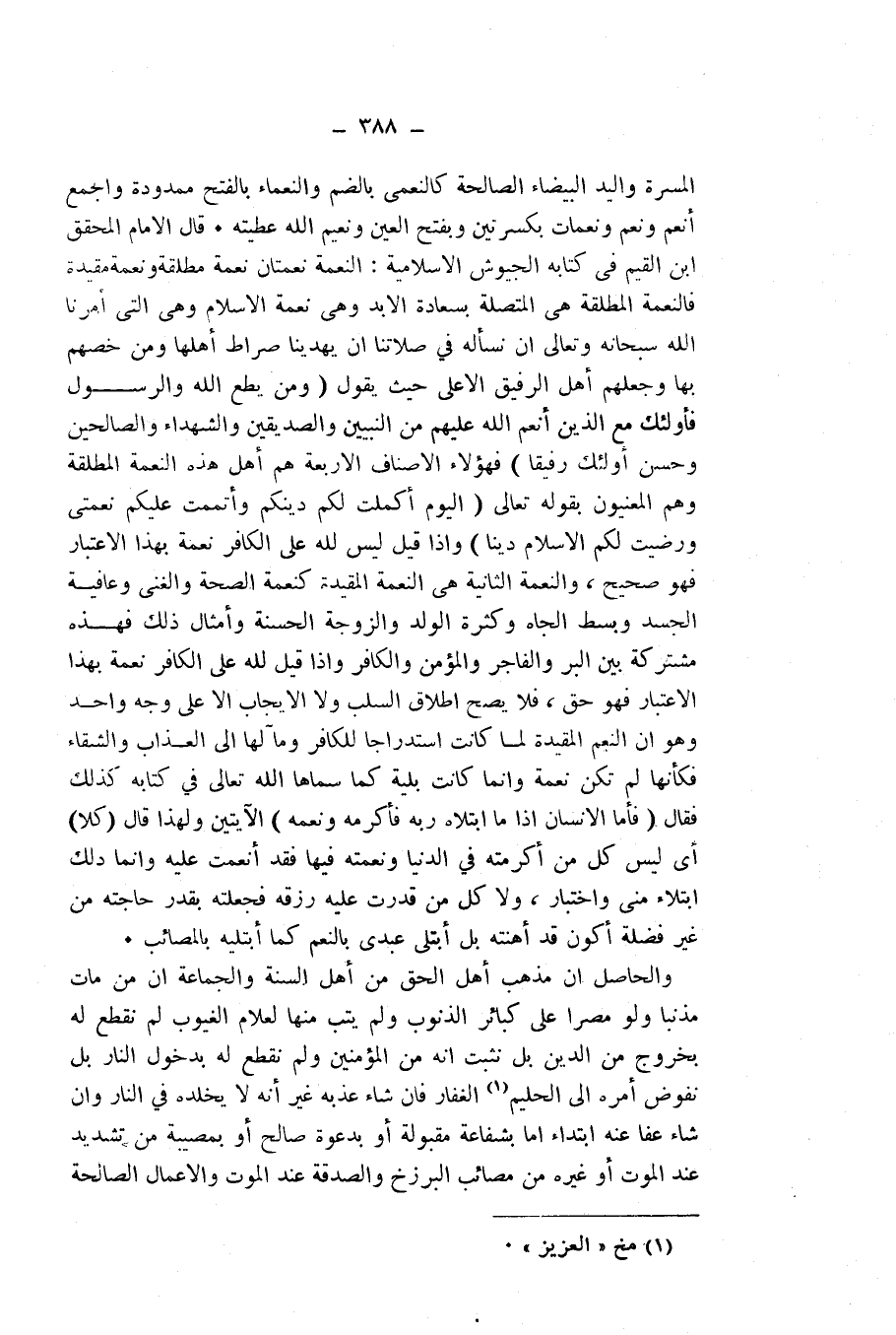 وَالْحَاصِلُ أَنَّ مَذْهَبَ أَهْلِ الْحَقِّ مِنْ أَهْلِ السُّنَّةِ وَالْجَمَاعَةِ أَنَّ مَنْ مَاتَ مُذْنِبًا، وَلَوْ مُصِرًّا عَلَى كَبَائِرِ الذُّنُوبِ وَلَمْ يَتُبْ مِنْهَا لِعَلَّامِ الْغُيُوبِ؛ لَمْ نَقْطَعْ لَهُ بِخُرُوجٍ مِنَ الدِّينِ، بَلْ نُثْبِتُ أَنَّهُ مِنَ الْمُؤْمِنِينَ وَلَمْ نَقْطَعْ لَهُ بِدُخُولِ النَّارِ بَلْ نُفَوِّضُ أَمْرَهُ إِلَى الْحَلِيمِ الْغَفَّارِ، فَإِنْ شَاءَ عَذَّبَهُ غَيْرَ أَنَّهُ لَا يُخَلِّدُهُ فِي النَّارِ، وَإِنْ شَاءَ عَفَا عَنْهُ ابْتِدَاءً، إِمَّا بِشَفَاعَةٍ مَقْبُولَةٍ، أَوْ بِدَعْوَةِ صَالِحٍ، أَوْ بِمُصِيبَةٍ؛ مِنْ تَشْدِيدٍ عِنْدَ الْمَوْتِ، أَوْ غَيْرِهِ مِنْ مَصَائِبِ الْبَرْزَخِ، وَالصَّدَقَةِ عِنْدَ الْمَوْتِ، وَالْأَعْمَالِ الْصَالِحَةِ