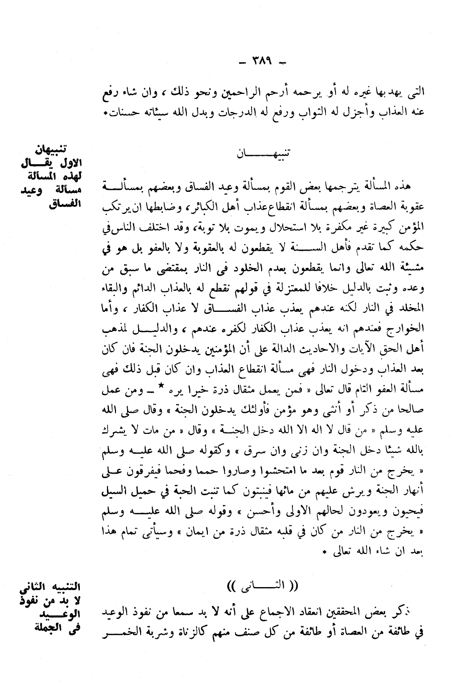 ((الثَّانِي:)) ذَكَرَ بَعْضُ الْمُحَقِّقِينَ انْعِقَادَ الْإِجْمَاعِ عَلَى أَنَّهُ لَا بُدَّ سَمْعًا مِنْ نُفُوذِ الْوَعِيدِ فِي طَائِفَةٍ مِنَ الْعُصَاةِ، أَوْ طَائِفَةٍ مِنْ كُلِّ صِنْفٍ مِنْهُمْ؛ كَالزُّنَاةِ وَشَرَبَةِ الْخَمْرِ