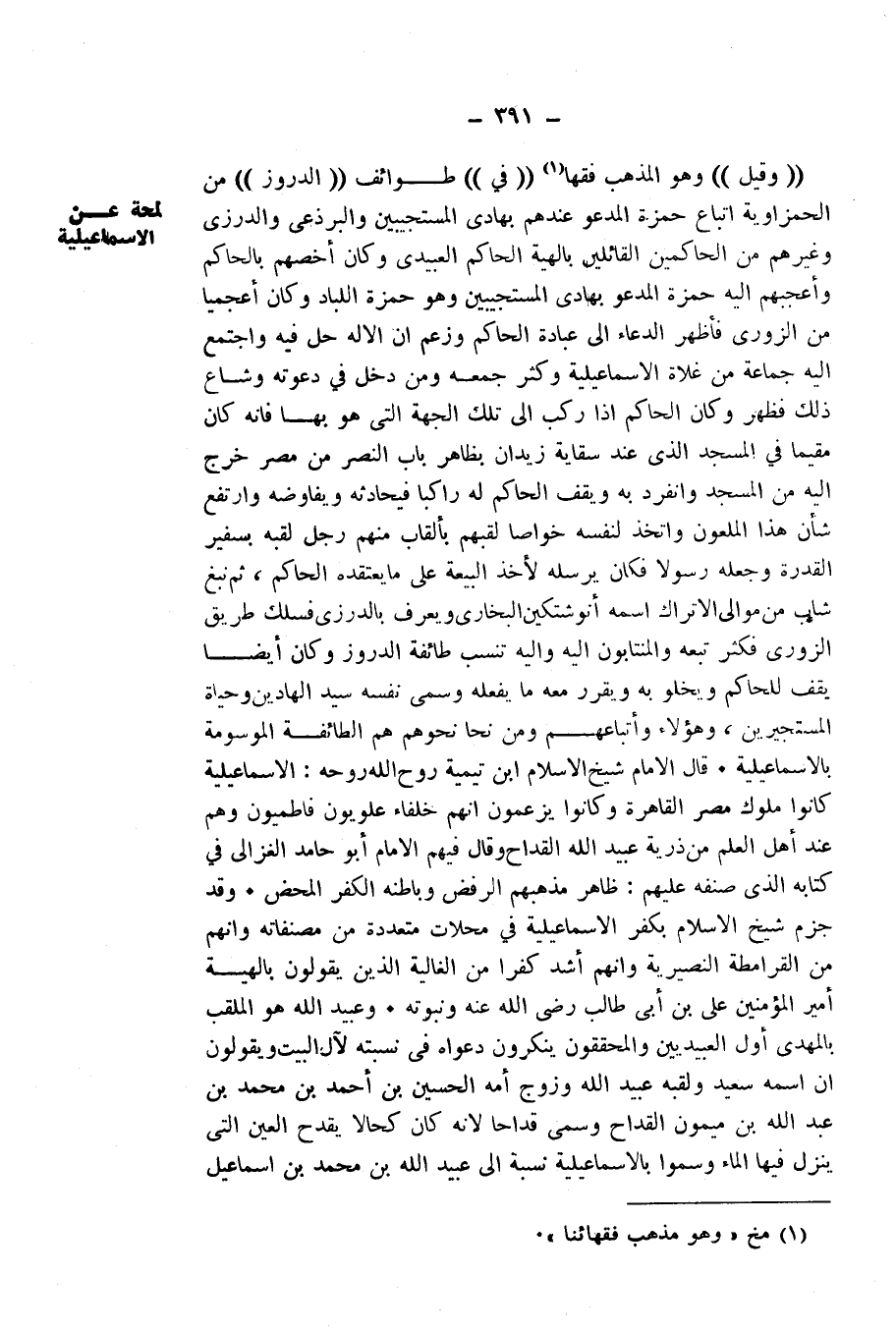 ((وَقِيلَ)) وَهُوَ الْمَذْهَبُ فِقْهًا ((فِي)) طَوَائِفِ ((الدُّرُوزِ)) مَنِ الْحَمْزَاوِيَّةِ أَتْبَاعِ حَمْزَةَ، الْمَدْعُو عِنْدَهُمْ بِهَادِي الْمُسْتَجِيبِينَ، وَالْبَرْذَعِيِّ، وَالدُّرْزِيِّ وَغَيْرِهِمْ، مِنَ الْحَاكِمِيينَ الْقَائِلِينَ بِإِلَهِيَّةِ الْحَاكِمِ الْعُبَيْدِيِّ، وَكَانَ أَخُصَّهُمْ بِالْحَاكِمِ وَأَعْجَبُهُمْ إِلَيْهِ حَمْزَةُ الْمَدْعُو بِهَادِي الْمُسْتَجِيبِينَ، وَهُوَ حَمْزَةُ اللَّبَّادُ وَكَانَ أَعْجَمِيًّا مِنَ الزَّوْرَى فَأَظْهَرَ الدُّعَاءَ إِلَى عِبَادَةِ الْحَاكِمِ، وَزَعَمَ أَنَّ الْإِلَهَ حَلَّ فِيهِ وَاجْتَمَعَ إِلَيْهِ جَمَاعَةٌ مِنْ غُلَاةِ الْإِسْمَاعِيلِيَّةِ، وَكَثُرَ جَمْعُهُ وَمَنْ دَخَلَ فِي دَعْوَتِهِ وَشَاعَ ذَلِكَ فَظَهَرَ. وَكَانَ الْحَاكِمُ إِذَا رَكِبَ إِلَى تِلْكَ الْجِهَةِ الَّتِي هُوَ بِهَا، فَإِنَّهُ كَانَ مُقِيمًا فِي الْمَسْجِدِ الَّذِي عِنْدَ سِقَايَةِ زَيْدَانَ بِظَاهِرِ بَابِ النَّصْرِ مِنْ مِصْرَ؛ خَرَجَ إِلَيْهِ مِنَ الْمَسْجِدِ وَانْفَرَدَ بِهِ وَيَقِفُ الْحَاكِمُ لَهُ رَاكِبًا، فَيُحَادِثُهُ وَيُفَاوِضُهُ وَارْتَفَعَ شَأْنُ هَذَا الْمَلْعُونِ، وَاتَّخَذَ لِنَفْسِهِ خَوَاصًا لَقَّبَهُمْ بِأَلْقَابٍ، مِنْهُمْ رَجُلٌ لَقَّبَهُ بِسَفِيرِ الْقُدْرَةِ وَجَعَلَهُ رَسُولًا، فَكَانَ يُرْسِلُهُ لِأَخْذِ الْبَيْعَةِ عَلَى مَا يَعْتَقِدُهُ الْحَاكِمُ، ثُمَّ نَبَغَ شَابٌّ مِنْ مَوَالِي الْأَتْرَاكِ اسْمُهُ أَنُوشْتِكِينَ الْبُخَارِيُّ، وَيُعْرَفُ بِالدُّرْزِيِّ فَسَلَكَ طَرِيقَ الزَّوْرِيِّ، فَكَثُرَ تَبِعُهُ وَالْمُنْتَابُونَ إِلَيْهِ، وَإِلَيْهِ تُنْسَبُ طَائِفَةُ الدُّرُوزِ، وَكَانَ أَيْضًا يَقِفُ لِلْحَاكِمِ وَيَخْلُو بِهِ وَيُقَرِّرُ مَعَهُ مَا يَفْعَلُهُ، وَسَمَّى نَفْسَهُ سَيِّدَ الْهَادِينَ وَحَيَاةَ الْمُسْتَجِيرِينَ، وَهَؤُلَاءِ وَأَتْبَاعُهُمْ وَمَنْ نَحَا نَحْوَهُمْ هُمُ الطَّائِفَةُ الْمَوْسُومَةُ بِالْإِسْمَاعِيلِيَّةِ.