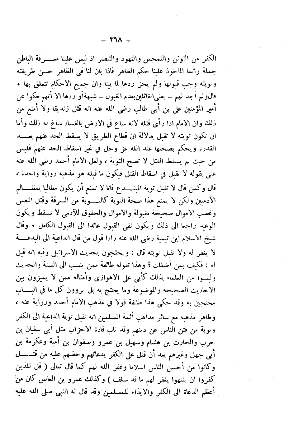 وَقَالَ شَيْخُ الْإِسْلَامِ ابْنُ تَيْمِيَّةَ - رَضِيَ اللَّهُ عَنْهُ - رَادًّا قَوْلَ مَنْ قَالَ: الدَّاعِيَةُ إِلَى الْبِدْعَةِ لَا يُغْفَرُ لَهُ وَلَا تُقْبَلُ تَوْبَتُهُ، قَالَ: وَيَحْتَجُّونَ بِحَدِيثِ الْإِسْرَائِيلِيِّ، وَفِيهِ أَنَّهُ قِيلَ لَهُ: فَكَيْفَ بِمَنْ أَضْلَلْتَ؟ وَهَذَا تَقُولُهُ طَائِفَةٌ مِمَّنْ يُنْسَبُ إِلَى السُّنَّةِ وَالْحَدِيثِ، وَلَيْسُوا مِنَ الْعُلَمَاءِ بِذَلِكَ، كَأَبِي عَلِيٍّ الْأَهْوَازِيِّ وَأَمْثَالِهِ مِمَّنْ لَا يُمَيِّزُونَ بَيْنَ الْأَحَادِيثِ الصَّحِيحَةِ وَالْمَوْضُوعَةِ، وَمَا يُحْتَجُّ بِهِ، بَلْ يَرْوُونَ كُلَّ مَا فِي الْبَابِ مُحْتَجِّينَ بِهِ، وَقَدْ حَكَى هَذَا طَائِفَةٌ قَوْلًا فِي مَذْهَبِ الْإِمَامِ أَحْمَدَ وَرِوَايَةً عَنْهُ، وَظَاهِرُ مَذْهَبِهِ مَعَ سَائِرِ مَذَاهِبِ أَئِمَّةِ الْمُسْلِمِينَ أَنَّهُ تُقْبَلُ تَوْبَةُ الدَّاعِيَةِ إِلَى الْكُفْرِ، وَتَوْبَةُ مَنْ فَتَنَ النَّاسَ عَنْ دِينِهِمْ، وَقَدْ تَابَ قَادَةُ الْأَحْزَابِ، مِثْلُ أَبِي سُفْيَانَ بْنِ حَرْبٍ، وَالْحَارِثِ بْنِ هِشَامٍ، وَسُهَيْلِ بْنِ عَمْرٍو، وَصَفْوَانَ بْنِ أُمَيَّةَ وَعِكْرِمَةَ بْنِ أَبِي جَهْلٍ وَغَيْرِهِمْ، بَعْدَ أَنْ قُتِلَ عَلَى الْكُفْرِ بِدُعَائِهِمْ وَحَضِّهِمْ عَلَيْهِ مَنْ قُتِلَ، وَكَانُوا أَحْسَنَ النَّاسِ إِسْلَامًا، وَغَفَرَ اللَّهُ لَهُمْ كَمَا قَالَ - تَعَالَى -: {قُلْ لِلَّذِينَ كَفَرُوا إِنْ يَنْتَهُوا يُغْفَرْ لَهُمْ مَا قَدْ سَلَفَ} [الأنفال: 38] وَكَذَلِكَ عَمْرُو بْنُ الْعَاصِ كَانَ مِنْ أَعْظَمِ الدُّعَاةِ إِلَى الْكُفْرِ وَالْإِيذَاءِ لِلْمُسْلِمِينَ، وَقَدْ قَالَ لَهُ النَّبِيُّ - صَلَّى اللَّهُ عَلَيْهِ