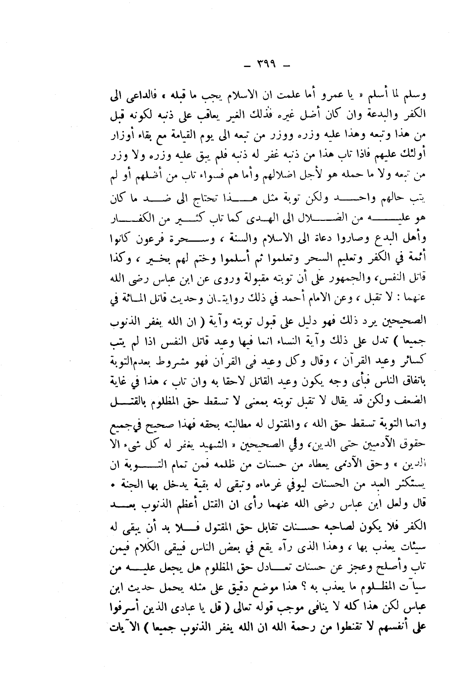 وَسَلَّمَ - لَمَّا أَسْلَمَ: " «يَا عَمْرُو أَمَا عَلِمْتَ أَنَّ الْإِسْلَامَ يَجُبُّ مَا قَبْلَهُ " فَالدَّاعِي إِلَى الْكُفْرِ وَالْبِدْعَةِ، وَإِنْ كَانَ أَضَلَّ غَيْرَهُ» ، فَذَلِكَ الْغَيْرُ يُعَاقَبُ عَلَى ذَنْبِهِ ; لِكَوْنِهِ قَبِلَ مِنْ هَذَا وَتَبِعَهُ، وَهَذَا عَلَيْهِ وِزْرُهُ وَوِزْرُ مَنْ تَبِعَهُ إِلَى يَوْمِ الْقِيَامَةِ مَعَ بَقَاءِ أَوْزَارِ أُولَئِكَ عَلَيْهِمْ، فَإِذَا تَابَ هَذَا مِنْ ذَنْبِهِ غُفِرَ لَهُ ذَنَبُهُ، فَلَمْ يَبْقَ عَلَيْهِ وِزْرُهُ وَلَا وِزْرُ مَنْ تَبِعَهُ، وَلَا مَا حَمَلَهُ هُوَ لِأَجْلِ إِضْلَالِهِمْ، وَأَمَّا هُوَ فَسَوَاءٌ تَابَ مَنْ أَضَلَّهُمْ أَوْ لَمْ يَتُبْ؛ حَالُهُمْ وَاحِدٌ، وَلَكِنَّ تَوْبَةَ مِثْلِ هَذَا تَحْتَاجُ إِلَى ضِدِّ مَا كَانَ هُوَ عَلَيْهِ مِنَ الضَّلَالِ إِلَى الْهُدَى، كَمَا تَابَ كَثِيرٌ مِنَ الْكُفَّارِ وَأَهْلِ الْبِدَعِ، وَصَارُوا دُعَاةً إِلَى الْإِسْلَامِ وَالسُّنَّةِ، وَسَحَرَةُ فِرْعَوْنَ كَانُوا أَئِمَّةً فِي الْكُفْرِ وَتَعْلِيمِ السِّحْرِ، وَتَعَلَّمُوا ثُمَّ أَسْلَمُوا وَخُتِمَ لَهُمْ بِخَيْرٍ، وَكَذَا قَاتِلُ النَّفْسِ، وَالْجُمْهُورُ عَلَى أَنَّ تَوْبَتَهُ مَقْبُولَةٌ، وَرُوِيَ عَنِ ابْنِ عَبَّاسٍ - رَضِيَ اللَّهُ عَنْهُمَا -: لَا تُقْبَلُ، وَعَنِ الْإِمَامِ أَحْمَدَ فِي ذَلِكَ رِوَايَتَانِ، وَحَدِيثُ قَاتِلِ الْمِائَةِ فِي الصَّحِيحَيْنِ وَيَرُدُّ ذَلِكَ، فَهُوَ دَلِيلٌ عَلَى قَبُولِ تَوْبَتِهِ، وَآيَةُ {إِنَّ اللَّهَ يَغْفِرُ الذُّنُوبَ جَمِيعًا} [الزمر: 53] تَدُلُّ عَلَى ذَلِكَ، وَآيَةُ النِّسَاءِ إِنَّمَا فِيهَا وَعِيدُ قَاتِلِ النَّفْسِ إِذَا لَمْ يَتُبْ؛ كَسَائِرِ وَعِيدِ الْقُرْآنِ، وَقَالَ: وَكُلُّ وَعِيدٍ فِي الْقُرْآنِ فَهُوَ مَشْرُوطٌ بِعَدَمِ التَّوْبَةِ بِاتِّفَاقِ النَّاسِ، فَبِأَيِّ وَجْهٍ يَكُونُ وَعِيدُ الْقَاتِلِ لَاحِقًا بِهِ وَإِنْ تَابَ؟ ! هَذَا فِي غَايَةِ الضَّعْفِ، وَلَكِنْ قَدْ يُقَالُ: لَا تُقْبَلُ تَوْبَتُهُ بِمَعْنَى لَا تُسْقِطُ حَقَّ الْمَظْلُومِ بِالْقَتْلِ، وَإِنَّمَا التَّوْبَةُ تُسْقِطُ حَقَّ اللَّهِ، وَالْمَقْتُولُ لَهُ مُطَالَبَتُهُ بِحَقِّهِ، فَهَذَا صَحِيحٌ فِي جَمِيعِ حُقُوقِ الْآدَمِيِّينَ حَتَّى الدَّيْنِ، وَفِي الصَّحِيحَيْنِ " الشَّهِيدُ يُغْفَرُ لَهُ كُلُّ شَيْءٍ إِلَّا الدَّيْنَ ". وَحَقُّ الْآدَمِيِّ يُعْطَاهُ مِنْ حَسَنَاتِ مَنْ ظَلَمَهُ، فَمِنْ تَمَامِ التَّوْبَةِ أَنْ يَسْتَكْثِرَ الْعَبْدُ مِنَ الْحَسَنَاتِ لِيُوَفِّيَ غُرَمَاءَهُ، وَتَبْقَى لَهُ بَقِيَّةٌ يَدْخُلُ بِهَا الْجَنَّةَ. قَالَ: وَلَعَلَّ ابْنَ عَبَّاسٍ - رَضِيَ اللَّهُ عَنْهُمَا - رَأَى أَنَّ الْقَتْلَ أَعْظَمُ الذُّنُوبِ بَعْدَ الْكُفْرِ، فَلَا يَكُونُ لِصَاحِبِهِ حَسَنَاتٌ تُقَابِلُ حَقَّ الْمَقْتُولِ، فَلَا بُدَّ أَنْ يَبْقَى لَهُ سَيِّئَاتٌ يُعَذَّبُ بِهَا، وَهَذَا الَّذِي رَآهُ يَقَعُ فِي بَعْضِ النَّاسِ، فَيَبْقَى الْكَلَامُ فِيمَنْ تَابَ وَأَصْلَحَ، وَعَجَزَ عَنْ حَسَنَاتٍ تُعَادِلُ حَقَّ الْمَظْلُومِ هَلْ يُجْعَلُ عَلَيْهِ مِنْ سَيِّئَاتِ الْمَظْلُومِ مَا يُعَذَّبُ بِهِ؟ هَذَا مَوْضُوعٌ دَقِيقٌ، عَلَى مِثْلِهِ يُحْمَلُ حَدِيثُ ابْنِ عَبَّاسٍ، لَكِنَّ هَذَا كُلَّهُ لَا يُنَافِي مُوجِبَ قَوْلِهِ - تَعَالَى -: {قُلْ يَاعِبَادِيَ الَّذِينَ أَسْرَفُوا عَلَى أَنْفُسِهِمْ لَا تَقْنَطُوا مِنْ رَحْمَةِ اللَّهِ إِنَّ اللَّهَ يَغْفِرُ الذُّنُوبَ جَمِيعًا} [الزمر: 53] الْآيَاتِ