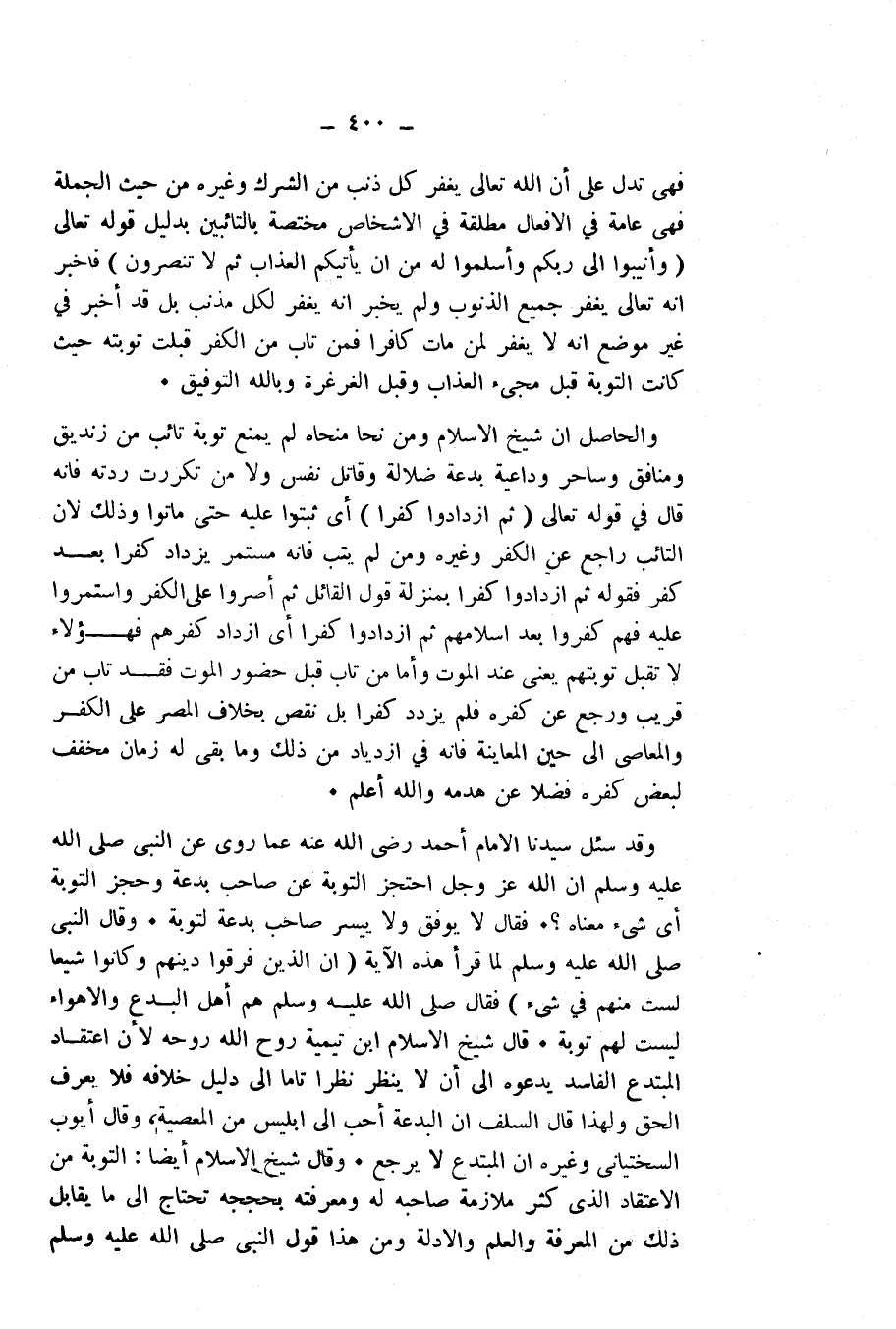 وَالْحَاصِلُ أَنَّ شَيْخَ الْإِسْلَامِ وَمَنْ نَحَا مَنْحَاهُ لَمْ يَمْنَعْ تَوْبَةَ تَائِبٍ مِنْ زِنْدِيقٍ وَمُنَافِقٍ وَسَاحِرٍ، وَدَاعِيَةِ بِدْعَةٍ ضَلَالَةٍ، وَقَاتِلِ نَفْسٍ، وَلَا مَنْ تَكَرَّرَتْ رِدَّتُهُ، فَإِنَّهُ قَالَ فِي قَوْلِهِ - تَعَالَى -: {ثُمَّ ازْدَادُوا كُفْرًا} [آل عمران: 90] : أَيْ ثَبَتُوا عَلَيْهِ حَتَّى مَاتُوا، وَذَلِكَ لِأَنَّ التَّائِبَ رَاجِعٌ عَنِ الْكُفْرِ وَغَيْرِهِ، وَمَنْ لَمْ يَتُبْ فَإِنَّهُ مُسْتَمِرٌّ يَزْدَادُ كُفْرًا بَعْدَ كُفْرٍ، فَقَوْلُهُ: {ثُمَّ ازْدَادُوا كُفْرًا} [آل عمران: 90] بِمَنْزِلَةِ قَوْلِ الْقَائِلِ: ثُمَّ أَصَرُّوا عَلَى الْكُفْرِ وَاسْتَمَرُّوا عَلَيْهِ، فَهُمْ كَفَرُوا بَعْدَ إِسْلَامِهِمْ، {ثُمَّ ازْدَادُوا كُفْرًا} [آل عمران: 90] أَيِ ازْدَادَ كُفْرُهُمْ، فَهَؤُلَاءِ لَا تُقْبَلُ تَوْبَتُهُمْ، يَعْنِي عِنْدَ الْمَوْتِ، وَأَمَّا مَنْ تَابَ قَبْلَ حُضُورِ الْمَوْتِ فَقَدْ تَابَ مِنْ قَرِيبٍ، وَرَجَعَ عَنْ كُفْرِهِ، فَلَمْ يَزْدَدْ كُفْرًا بَلْ نَقَصَ بِخِلَافِ الْمُصِرِّ عَلَى الْكُفْرِ وَالْمَعَاصِي إِلَى حِينِ الْمُعَايَنَةِ، فَإِنَّهُ فِي ازْدِيَادٍ مِنْ ذَلِكَ، وَمَا بَقِيَ لَهُ زَمَانٌ مُخَفِّفٌ لِبَعْضِ كُفْرِهِ فَضْلًا عَنْ هَدْمِهِ، وَاللَّهُ أَعْلَمُ. وَقَدْ سُئِلَ سَيِّدُنَا الْإِمَامُ أَحْمَدُ - رَضِيَ اللَّهُ عَنْهُ - عَمَّا رُوِيَ عَنِ النَّبِيِّ - صَلَّى اللَّهُ عَلَيْهِ وَسَلَّمَ - «أَنَّ اللَّهَ - عَزَّ وَجَلَّ - احْتَجَزَ التَّوْبَةَ عَنْ صَاحِبِ بِدْعَةٍ» ، وَحَجْزُ التَّوْبَةِ أَيُّ شَيْءٍ مَعْنَاهُ؟ فَقَالَ: لَا يُوَفَّقُ وَلَا يُيَسَّرُ صَاحِبُ بِدْعَةٍ لِتَوْبَةٍ. «وَقَالَ النَّبِيُّ - صَلَّى اللَّهُ عَلَيْهِ وَسَلَّمَ - لَمَّا قَرَأَ هَذِهِ الْآيَةَ: {إِنَّ الَّذِينَ فَرَّقُوا دِينَهُمْ وَكَانُوا شِيَعًا لَسْتَ مِنْهُمْ فِي شَيْءٍ} [الأنعام: 159] فَقَالَ - صَلَّى اللَّهُ عَلَيْهِ وَسَلَّمَ -: هُمْ أَهْلُ الْبِدَعِ وَالْأَهْوَاءِ لَيْسَتْ لَهُمْ تَوْبَةٌ» . قَالَ شَيْخُ الْإِسْلَامِ ابْنُ تَيْمِيَّةَ - رَوَّحَ اللَّهُ رُوحَهُ -: لِأَنَّ اعْتِقَادَ الْمُبْتَدِعِ الْفَاسِدِ يَدْعُوهُ إِلَى أَلَّا يَنْظُرَ نَظَرًا تَامًّا إِلَى دَلِيلٍ خِلَافِهِ، فَلَا يَعْرِفُ الْحَقَّ ; وَلِهَذَا قَالَ السَّلَفُ: إِنَّ الْبِدْعَةَ أَحَبُّ إِلَى إِبْلِيسَ مِنَ الْمَعْصِيَةِ، وَقَالَ أَيُّوبُ السِّخْتِيَانِيُّ وَغَيْرُهُ: إِنَّ الْمُبْتَدِعَ لَا يَرْجِعُ. وَقَالَ شَيْخُ الْإِسْلَامِ أَيْضًا: التَّوْبَةُ مِنَ الِاعْتِقَادِ الَّذِي كَثُرَ مُلَازَمَةُ صَاحِبِهِ لَهُ وَمَعْرِفَتُهُ بِحُجَجِهِ - تَحْتَاجُ إِلَى مَا يُقَابِلُ ذَلِكَ مِنَ الْمَعْرِفَةِ وَالْعِلْمِ وَالْأَدِلَّةِ، وَمِنْ هَذَا قَوْلُ النَّبِيِّ - صَلَّى اللَّهُ عَلَيْهِ وَسَلَّمَ -: