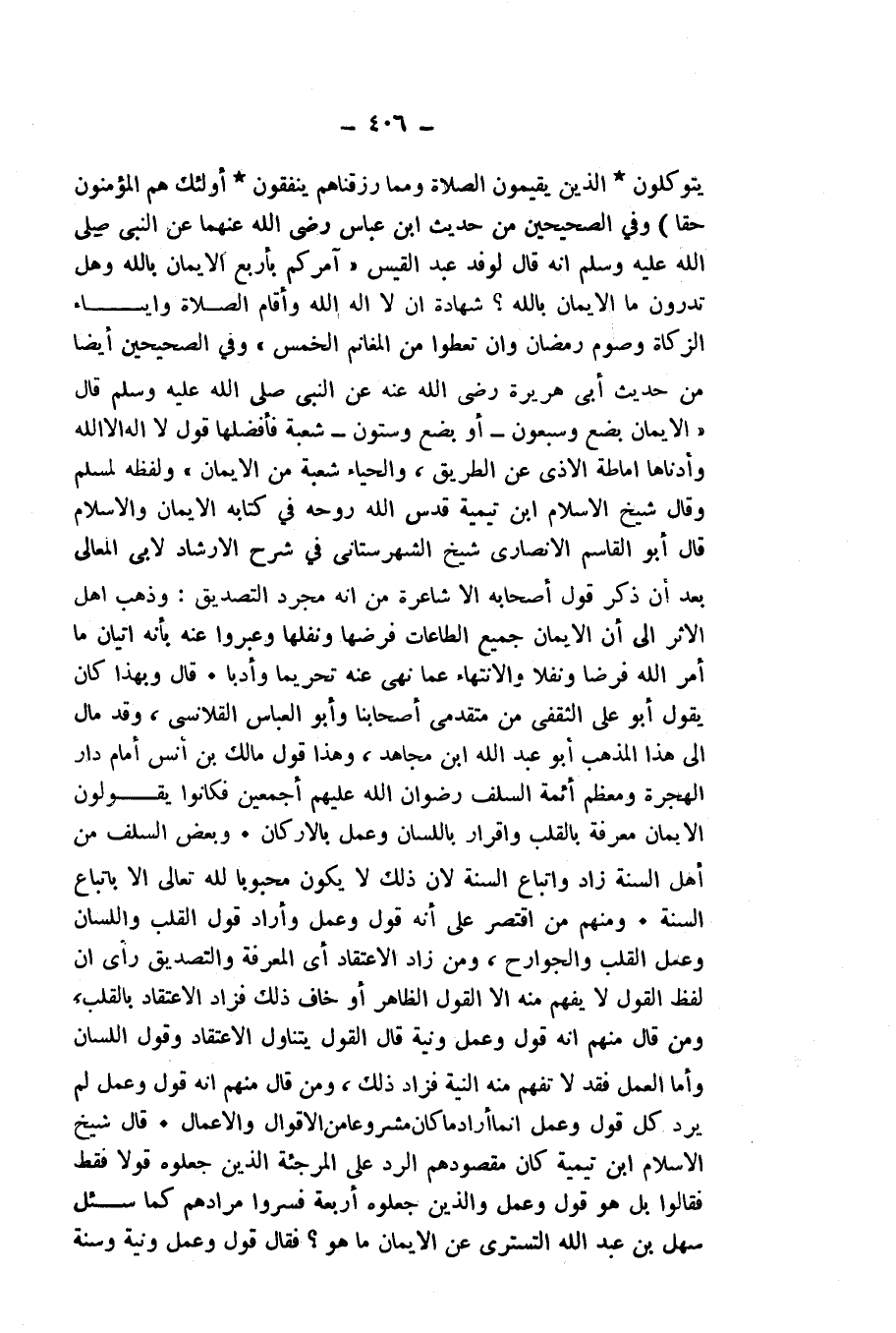 وَفِي الصَّحِيحَيْنِ مِنْ حَدِيثِ ابْنِ عَبَّاسٍ - رَضِيَ اللَّهُ عَنْهُمَا - عَنِ النَّبِيِّ - صَلَّى اللَّهُ عَلَيْهِ وَسَلَّمَ - «أَنَّهُ قَالَ لِوَفْدِ عَبْدِ الْقَيْسِ: " آمُرُكُمْ بِأَرْبَعٍ: الْإِيمَانِ بِاللَّهِ وَهَلْ تَدْرُونَ مَا الْإِيمَانُ بِاللَّهِ؟ شَهَادَةُ أَنْ لَا إِلَهَ إِلَّا اللَّهُ، وَإِقَامِ الصَّلَاةِ، وَإِيتَاءِ الزَّكَاةِ، وَصَوْمِ رَمَضَانَ، وَأَنْ تُعْطُوا مِنَ الْمَغَانِمِ الْخُمْسَ» " وَفِي الصَّحِيحَيْنِ أَيْضًا مِنْ حَدِيثِ أَبِي هُرَيْرَةَ - رَضِيَ اللَّهُ عَنْهُ - عَنِ النَّبِيِّ - صَلَّى اللَّهُ عَلَيْهِ وَسَلَّمَ - قَالَ: " «الْإِيمَانُ بِضْعٌ وَسَبْعُونَ -، أَوْ بِضْعٌ وَسِتُّونَ - شُعْبَةً فَأَفْضَلُهَا قَوْلُ لَا إِلَهَ إِلَّا اللَّهُ وَأَدْنَاهَا إِمَاطَةُ الْأَذَى عَنِ الطَّرِيقِ، وَالْحَيَاءُ شُعْبَةٌ مِنَ الْإِيمَانِ» " وَلَفْظُهُ لِمُسْلِمٍ، وَقَالَ شَيْخُ الْإِسْلَامِ ابْنُ تَيْمِيَّةَ - قَدَّسَ اللَّهُ رُوحَهُ - فِي كِتَابِ الْإِيمَانِ وَالْإِسْلَامِ: قَالَ أَبُو الْقَاسِمِ الْأَنْصَارِيُّ شَيْخُ الشَّهْرِسْتَانِيِّ فِي شَرْحِ الْإِرْشَادِ لِأَبِي الْمَعَالِي، بَعْدَ أَنْ ذَكَرَ قَوْلَ أَصْحَابِهِ الْأَشَاعِرَةِ مِنْ أَنَّهُ مُجَرَّدُ التَّصْدِيقِ: وَذَهَبَ أَهْلُ الْأَثَرِ إِلَى أَنَّ الْإِيمَانَ جَمِيعُ الطَّاعَاتِ فَرْضِهَا وَنَفْلِهَا، وَعَبَّرُوا عَنْهُ بِأَنَّهُ إِتْيَانُ مَا أَمَرَ اللَّهُ فَرْضًا وَنَفْلًا، وَالِانْتِهَاءُ عَمَّا نَهَى عَنْهُ تَحْرِيمًا وَأَدَبًا.