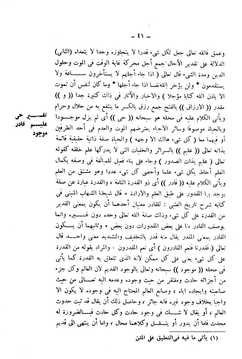 قَالَ شَيْخُنَا الشِّهَابُ الْمَنِينِيُّ فِي كِتَابِهِ شَرْحِ تَارِيخِ الْعُتْبِيِّ: لِلْقَادِرِ مَعْنَيَانِ: أَحَدُهُمَا: أَنْ يَكُونَ بِمَعْنَى الْقَدِيرِ مِنَ الْقُدْرَةِ عَلَى كُلِّ شَيْءٍ، وَذَلِكَ صِفَةُ اللَّهِ - تَعَالَى - وَحْدَهُ دُونَ غَيْرِهِ، وَإِنَّمَا يُوصَفُ الْقَادِرُ مِنَّا عَلَى بَعْضِ الْمَقْدُورَاتِ دُونَ بَعْضٍ. وَثَانِيهِمَا: أَنْ يَكُونَ الْقَادِرُ بِمَعْنَى الْمُقَدِّرِ، يُقَالُ مِنْهُ قَدَرَ بِالتَّخْفِيفِ وَالتَّشْدِيدِ مَعْنًى وَاحِدٌ، قَالَ - تَعَالَى: {فَقَدَرْنَا فَنِعْمَ الْقَادِرُونَ} [المرسلات: 23] أَيْ: نِعْمَ الْمُقَدِّرُونَ. وَالْمُرَادُ بِقَوْلِهِ مِنَ الْقُدْرَةِ عَلَى كُلِّ شَيْءٍ: يَعْنِي عَلَى كُلِّ مُمْكِنٍ ; لِأَنَّهُ الَّذِي تَتَعَلَّقُ بِهِ الْقُدْرَةُ كَمَا يَأْتِي فِي مَحَلِّهِ، (مَوْجُودٌ) - سُبْحَانَهُ وَتَعَالَى - بِالْوُجُودِ الْقَدِيمِ ; لِأَنَّ الْعَالَمَ وَكُلَّ جُزْءٍ مِنْ أَجْزَائِهِ حَادِثٌ وَمُفْتَقِرٌ مِنْ حَيْثُ وُجُودِهِ وَعَدِمِهِ إِلَيْهِ - تَعَالَى - مِنْ حَيْثُ صَانِعِيَّتِهِ وَإِيجَادِهِ إِيَّاهُ، وَصَانِعُ الْعَالَمِ الْمُحْتَاجِ إِلَيْهِ فِي وُجُودِهِ لَا يَكُونُ إِلَّا وَاجِبًا بِخِلَافِ وُجُودِ غَيْرِهِ، فَإِنَّهُ جَائِزٌ، وَحَاصِلُ ذَلِكَ أَنْ يُقَالَ: قَدْ ثَبَتَ حُدُوثُ الْعَالَمِ، أَوْ يُقَالَ: لَا شَكَّ فِي وُجُودِ حَادِثٍ، وَكُلُّ حَادِثٍ فَبِالضَّرُورَةِ لَهُ مُحْدِثٌ، فَإِمَّا أَنْ يَدُورَ أَوْ يَتَسَلْسَلَ، وَكِلَاهُمَا مُحَالٌ، وَإِمَّا أَنْ يَنْتَهِيَ إِلَى قَدِيمٍ