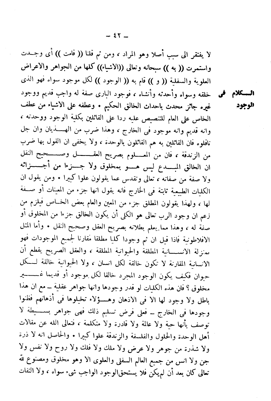 لَا يَفْتَقِرُ إِلَى سَبَبٍ أَصْلًا، وَهُوَ الْمُرَادُ، وَمِنْ ثَمَّ قُلْنَا " قَامَتْ " أَيْ وُجِدَتْ وَاسْتَمَرَّتْ " بِهِ " - سُبْحَانَهُ - وَتَعَالَى " الْأَشْيَاءُ " كُلُّهَا مِنَ الْجَوَاهِرِ وَالْأَعْرَاضِ الْعُلْوِيَّةِ وَالسُّفْلِيَّةِ، (وَ) قَامَ بِهِ (الْوُجُودُ) لِكُلِّ مَوْجُودٍ سِوَاهُ، فَهُوَ الَّذِي خَلَقَهُ وَسَوَّاهُ، وَأَحْدَثَهُ وَأَنْشَاهُ، فَوُجُودُ الْبَارِي صِفَةٌ لَهُ وَاجِبٌ قَدِيمٌ، وَوُجُودُ غَيْرِهِ جَائِزٌ مُحْدَثٌ بِإِحْدَاثِ الْخَالِقِ الْحَكِيمِ. وَعَطْفُهُ عَلَى الْأَشْيَاءِ مِنْ عَطْفِ الْخَاصِّ عَلَى الْعَامِّ لِلتَّنْصِيصِ عَلَيْهِ، رَدًّا عَلَى الْقَائِلِينَ بِكُلِّيَّةِ الْوُجُودِ وَوَحْدَتِهِ، وَأَنَّهُ قَدِيمٌ، وَأَنَّهُ مَوْجُودٌ فِي الْخَارِجِ، وَهَذَا ضَرْبٌ مِنَ الْهَذَيَانِ وَإِنْ جَلَّ نَاقِلُوهُ، فَإِنَّ الْقَائِلِينَ بِهِ هُمُ الْقَائِلُونَ بِالْوَحْدَةِ، وَلَا يَخْفَى أَنَّ الْقَوْلَ بِهَا ضَرْبٌ مِنَ الزَّنْدَقَةِ، فَإِنَّ مِنَ الْمَعْلُومِ بِصَرِيحِ الْعَقْلِ وَصَحِيحِ النَّقْلِ أَنَّ الْخَالِقَ الْمُبْدِعَ لَيْسَ هُوَ بِمَخْلُوقٍ، وَلَا جُزْءًا مِنْ أَجْزَائِهِ، وَلَا صِفَةً مِنْ صِفَاتِهِ، تَعَالَى وَتَقَدَّسَ عَمَّا يَقُولُونَ عُلُوًّا كَبِيرًا.