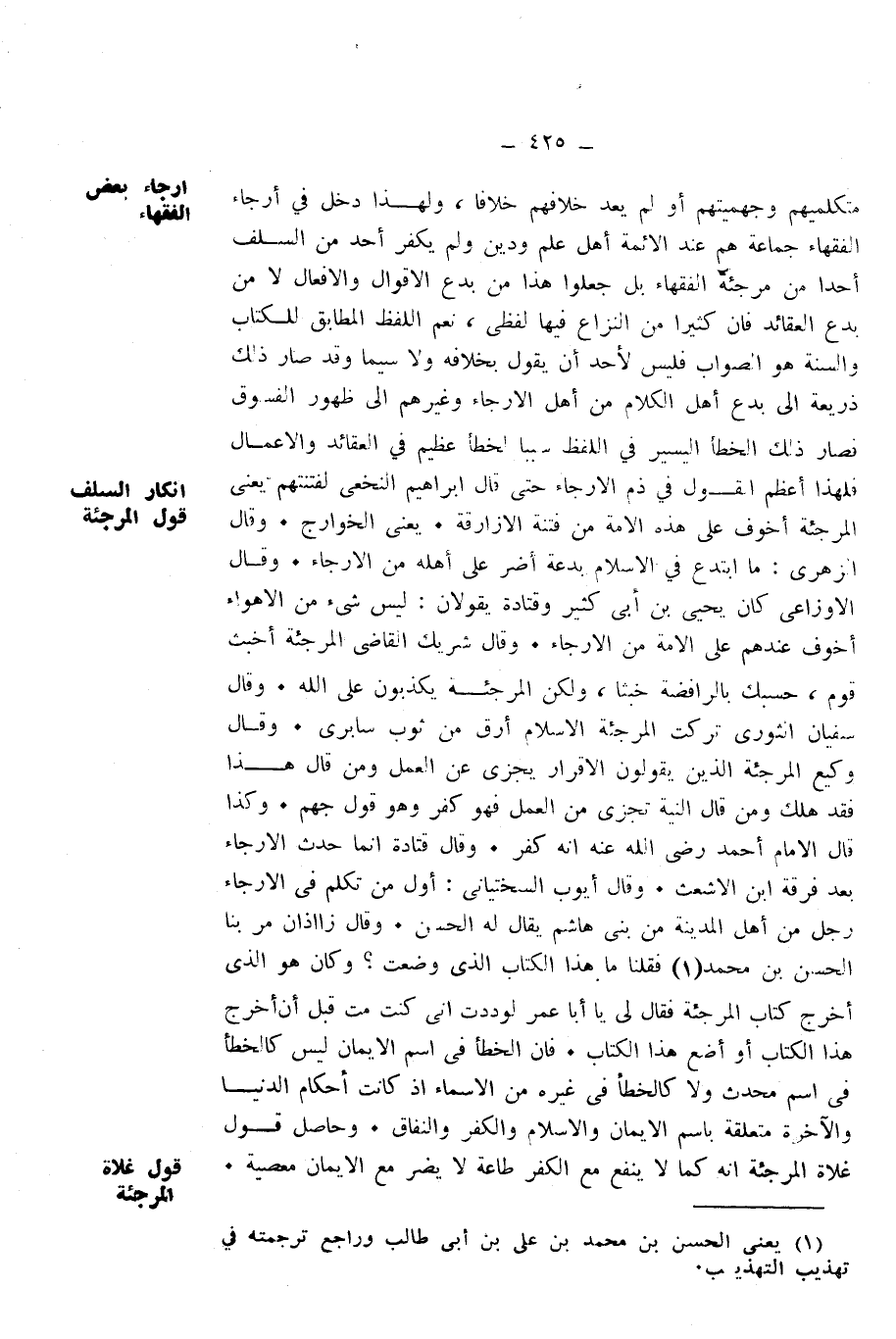 مُتَكَلِّمِيهِمْ وَجَهْمِيَّتِهِمْ، أَوْ لَمْ يَعُدَّ خِلَافَهُمْ خِلَافًا ; وَلِهَذَا دَخَلَ فِي إِرْجَاءِ الْفُقَهَاءِ جَمَاعَةٌ هُمْ عِنْدَ الْأَئِمَّةِ أَهْلُ عِلْمٍ وَدِينٍ، وَلَمْ يُكَفِّرْ أَحَدٌ مِنَ السَّلَفِ أَحَدًا مِنْ مُرْجِئَةِ الْفُقَهَاءِ بَلْ جَعَلُوا هَذَا مِنْ بِدَعِ الْأَقْوَالِ، وَالْأَفْعَالِ، لَا مِنْ بِدَعِ الْعَقَائِدِ فَإِنَّ كَثِيرًا مِنَ النِّزَاعِ فِيهَا لَفْظِيٌّ، نَعَمْ، اللَّفْظُ الْمُطَابِقُ لِلْكِتَابِ وَالسُّنَّةِ هُوَ الصَّوَابُ فَلَيْسَ لِأَحَدٍ أَنْ يَقُولَ بِخِلَافِهِ، وَلَا سِيَّمَا وَقَدْ صَارَ ذَلِكَ ذَرِيعَةً إِلَى بِدَعِ أَهْلِ الْكَلَامِ مِنْ أَهْلِ الْإِرْجَاءِ وَغَيْرِهِمْ إِلَى ظُهُورِ الْفُسُوقِ، فَصَارَ ذَلِكَ الْخَطَأُ الْيَسِيرُ فِي اللَّفْظِ سَبَبًا لِخَطَأٍ عَظِيمٍ فِي الْعَقَائِدِ، وَالْأَعْمَالِ. فَلِهَذَا أَعْظَمَ الْقَوْلَ فِي ذَمِّ الْإِرْجَاءِ حَتَّى قَالَ إِبْرَاهِيمُ النَّخَعِيُّ: لَفِتْنَتُهُمْ - يَعْنِي الْمُرْجِئَةَ - أَخْوَفُ عَلَى هَذِهِ الْأُمَّةِ مِنْ فِتْنَةِ الْأَزَارِقَةِ. يَعْنِي الْخَوَارِجَ.