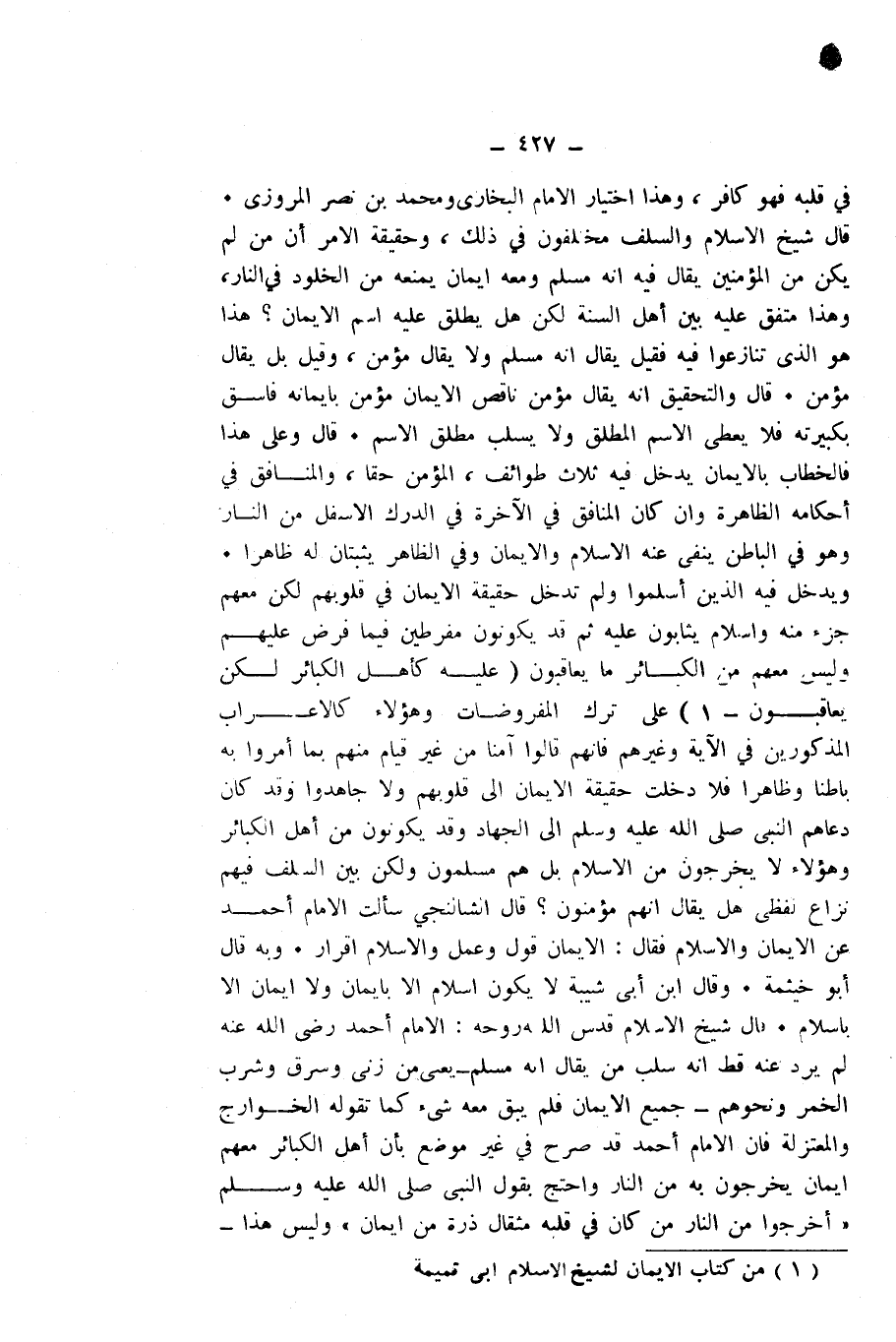 فِي قَلْبِهِ فَهُوَ كَافِرٌ، وَهَذَا اخْتِيَارُ الْإِمَامِ الْبُخَارِيِّ وَمُحَمَّدِ بْنِ نَصْرٍ الْمَرْوَزِيِّ. قَالَ شَيْخُ الْإِسْلَامِ: وَالسَّلَفُ مُخْتَلِفُونَ فِي ذَلِكَ، وَحَقِيقَةُ الْأَمْرِ أَنَّ مَنْ لَمْ يَكُنْ مِنَ الْمُؤْمِنِينَ يُقَالُ فِيهِ إِنَّهُ مُسْلِمٌ، وَمَعَهُ إِيمَانٌ يَمْنَعُهُ مِنَ الْخُلُودِ فِي النَّارِ، وَهَذَا مُتَّفَقٌ عَلَيْهِ بَيْنَ أَهْلِ السُّنَّةِ لَكِنْ هَلْ يُطْلَقُ عَلَيْهِ اسْمُ الْإِيمَانِ؟ هَذَا هُوَ الَّذِي تَنَازَعُوا فِيهِ فَقِيلَ يُقَالُ: إِنَّهُ مُسْلِمٌ وَلَا يُقَالُ مُؤْمِنٌ، وَقِيلَ بَلْ يُقَالُ مُؤْمِنٌ. قَالَ: وَالتَّحْقِيقُ أَنَّهُ يُقَالُ مُؤْمِنٌ نَاقِصُ الْإِيمَانِ مُؤْمِنٌ بِإِيمَانِهِ فَاسِقٌ بِكَبِيرَتِهِ، فَلَا يُعْطَى الِاسْمَ الْمُطْلَقَ، وَلَا يُسْلَبُ مُطْلَقَ الِاسْمِ. قَالَ: وَعَلَى هَذَا فَالْخِطَابُ بِالْإِيمَانِ يَدْخُلُ فِيهِ ثَلَاثُ طَوَائِفَ، الْمُؤْمِنُ حَقًّا، وَالْمُنَافِقُ فِي أَحْكَامِهِ الظَّاهِرَةِ، وَإِنْ كَانَ الْمُنَافِقُ فِي الْآخِرَةِ فِي الدَّرْكِ الْأَسْفَلِ مِنَ النَّارِ، وَهُوَ فِي الْبَاطِنِ يُنْفَى عَنْهُ الْإِسْلَامُ وَالْإِيمَانُ وَفِي الظَّاهِرِ يُثْبَتَانِ لَهُ ظَاهِرًا. وَيَدْخُلُ فِيهِ الَّذِينَ أَسْلَمُوا وَلَمْ تَدْخُلْ حَقِيقَةُ الْإِيمَانِ فِي قُلُوبِهِمْ لَكِنْ مَعَهُمْ جُزْءٌ مِنْهُ، وَإِسْلَامٌ يُثَابُونَ عَلَيْهِ ثُمَّ قَدْ يَكُونُوا مُفَرِّطِينَ فِيمَا فُرِضَ عَلَيْهِمْ وَلَيْسَ مَعَهُمْ مِنَ الْكَبَائِرِ مَا يُعَاقَبُونَ عَلَيْهِ كَأَهْلِ الْكَبَائِرِ لَكِنْ يُعَاقَبُونَ عَلَى تَرْكِ الْمَفْرُوضَاتِ وَهَؤُلَاءِ كَالْأَعْرَابِ الْمَذْكُورِينَ فِي الْآيَةِ وَغَيْرِهِمْ فَإِنَّهُمْ قَالُوا آمَنَّا، مِنْ غَيْرِ قِيَامٍ مِنْهُمْ بِمَا أُمِرُوا بِهِ بَاطِنًا وَظَاهِرًا، فَلَا دَخَلَتْ حَقِيقَةُ الْإِيمَانِ إِلَى قُلُوبِهِمْ وَلَا جَاهَدُوا وَقَدْ كَانَ دَعَاهُمُ النَّبِيُّ - صَلَّى اللَّهُ عَلَيْهِ وَسَلَّمَ - إِلَى الْجِهَادِ وَقَدْ يَكُونُونَ مِنْ أَهْلِ الْكَبَائِرِ، وَهَؤُلَاءِ لَا يَخْرُجُونَ مِنَ الْإِسْلَامِ بَلْ هُمْ مُسْلِمُونَ وَلَكِنْ بَيْنَ السَّلَفِ فِيهِمْ نِزَاعٌ لَفْظِيٌّ هَلْ يُقَالُ إِنَّهُمْ مُؤْمِنُونَ؟ قَالَ الشَّالَنْجِيُّ: سَأَلْتُ الْإِمَامَ أَحْمَدَ عَنِ الْإِيمَانِ وَالْإِسْلَامِ، فَقَالَ: الْإِيمَانُ قَوْلٌ وَعَمَلٌ، وَالْإِسْلَامُ إِقْرَارٌ.