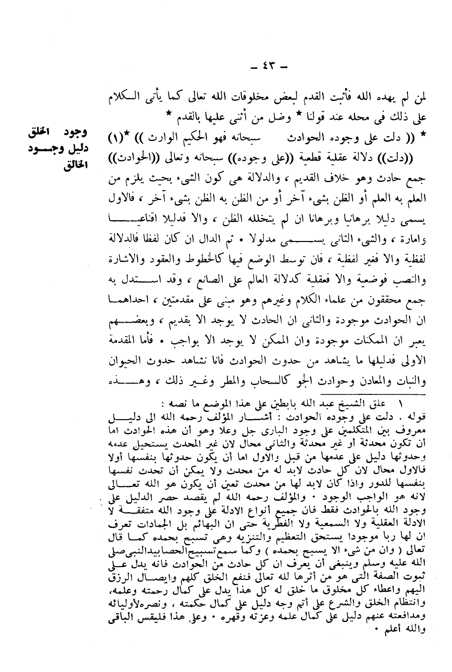 ((دَلَّتْ)) دَلَالَةً عَقْلِيَّةً قَطْعِيَّةً (عَلَى وُجُودِهِ) - سُبْحَانَهُ وَتَعَالَى - (الْحَوَادِثُ) جَمْعُ حَادِثٍ، وَهُوَ خِلَافُ الْقَدِيمِ، وَالدَّلَالَةُ هِيَ كَوْنُ الشَّيْءِ بِحَيْثُ يَلْزَمُ مِنَ الْعِلْمِ بِهِ الْعِلْمُ أَوِ الظَّنُّ بِشَيْءٍ آخَرَ، أَوْ مِنَ الظَّنِّ بِهِ الظَّنُّ بِشَيْءٍ آخَرَ، فَالْأَوَّلُ يُسَمَّى دَلِيلًا بُرْهَانِيًّا، وَبُرْهَانًا إِنْ لَمْ يَتَخَلَّلْهُ الظَّنُّ، وَإِلَّا فَدَلِيلًا إِقْنَاعِيًّا وَأَمَارَةً، وَالشَّيْءُ الثَّانِي يُسَمَّى مَدْلُولًا. ثُمَّ الدَّالُّ إِنْ كَانَ لَفْظًا فَالدَّلَالَةُ لَفْظِيَّةٌ، وَإِلَّا فَغَيْرُ لَفْظِيَّةٍ، فَإِنْ تَوَسَّطَ الْوَضْعُ فِيهَا كَالْخُطُوطِ وَالْعُقُودِ وَالْإِشَارَةِ وَالنُّصْبِ فَوَضْعِيَّةٌ وَإِلَّا فَعَقْلِيَّةٌ، كَدَلَالَةِ الْعَالَمِ عَلَى الصَّانِعِ، وَقَدِ اسْتَدَلَّ بِهِ جَمْعٌ مُحَقِّقُونَ مِنْ عُلَمَاءِ الْكَلَامِ وَغَيْرِهِمْ، وَهُوَ مَبْنِيٌّ عَلَى مُقَدِّمَتَيْنِ، إِحْدَاهُمَا: أَنَّ الْحَوَادِثَ مَوْجُودَةٌ، وَالثَّانِي: أَنَّ الْحَادِثَ لَا يُوجَدُ إِلَّا بِقَدِيمٍ، وَبَعْضُهُمْ يُعَبِّرُ أَنَّ الْمُمْكِنَاتِ مَوْجُودَةٌ، وَأَنَّ الْمُمْكِنَ لَا يُوجَدُ إِلَّا بِوَاجِبٍ. فَأَمَّا الْمُقَدِّمَةُ الْأُولَى فَدَلِيلُهَا مَا يُشَاهَدُ مِنْ حُدُوثِ الْحَوَادِثِ، فَإِنَّا نُشَاهِدُ حُدُوثَ الْحَيَوَانِ وَالنَّبَاتِ وَالْمَعَادِنِ، وَحَوَادِثَ الْجَوِّ كَالسَّحَابِ وَالْمَطَرِ وَغَيْرِ ذَلِكَ، وَهَذِهِ