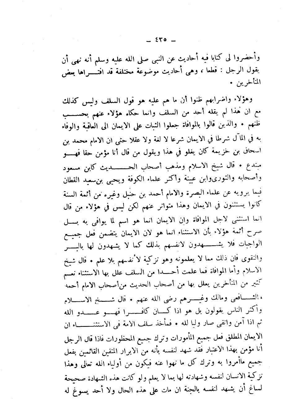 قَالَ شَيْخُ الْإِسْلَامِ: وَمَذْهَبُ أَصْحَابِ الْحَدِيثِ كَابْنِ مَسْعُودٍ وَأَصْحَابِهِ، وَالثَّوْرِيِّ وَابْنِ عُيَيْنَةَ وَأَكْثَرِ عُلَمَاءِ الْكُوفَةِ وَيَحْيَى بْنِ سَعِيدٍ الْقَطَّانِ، فِيمَا يَرْوِيهِ عَنْ عُلَمَاءِ الْبَصْرَةِ، وَالْإِمَامِ أَحْمَدَ بْنِ حَنْبَلٍ وَغَيْرِهِ مِنْ أَئِمَّةِ السُّنَّةِ كَانُوا يَسْتَثْنُونَ فِي الْإِيمَانِ، وَهَذَا مُتَوَاتِرٌ عَنْهُمْ لَكِنْ لَيْسَ فِي هَؤُلَاءِ مَنْ قَالَ: إِنَّمَا نَسْتَثْنِي لِأَجْلِ الْمُوَافَاةِ وَإِنَّ الْإِيمَانَ إِنَّمَا هُوَ اسْمٌ لِمَا يُوَفَّى بِهِ بَلْ صَرَّحَ أَئِمَّةُ هَؤُلَاءِ بِأَنَّ الِاسْتِثْنَاءَ إِنَّمَا هُوَ لِأَنَّ الْإِيمَانَ يَتَضَمَّنُ فِعْلَ جَمِيعِ الْوَاجِبَاتِ فَلَا يَشْهَدُونَ لِأَنْفُسِهِمْ بِذَلِكَ كَمَا لَا يَشْهَدُونَ لَهَا بِالْبِرِّ وَالتَّقْوَى، فَإِنَّ ذَلِكَ مِمَّا لَا يَعْلَمُونَهُ وَهُوَ تَزْكِيَةٌ لِأَنْفُسِهِمْ بِلَا عِلْمٍ. قَالَ شَيْخُ الْإِسْلَامِ: وَأَمَّا الْمُوَافَاةُ فَمَا عَلِمْتُ أَحَدًا مِنَ السَّلَفِ عَلَّلَ بِهَا الِاسْتِثْنَاءَ. نَعَمْ، كَثِيرٌ مِنَ الْمُتَأَخِّرِينَ يُعَلِّلُ بِهَا مِنْ أَصْحَابِ الْحَدِيثِ مِنْ أَصْحَابِ الْإِمَامِ أَحْمَدَ وَالشَّافِعِيِّ وَمَالِكٍ وَغَيْرِهِمْ - رَضِيَ اللَّهُ عَنْهُمْ -.