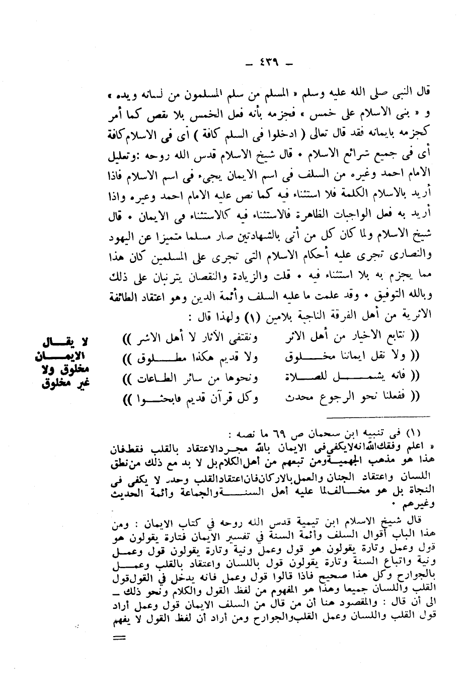 قَالَ النَّبِيُّ - صَلَّى اللَّهُ عَلَيْهِ وَسَلَّمَ -: " «الْمُسْلِمُ مَنْ سَلِمَ الْمُسْلِمُونَ مِنْ لِسَانِهِ وَيَدِهِ» " وَ " «بُنِيَ الْإِسْلَامُ عَلَى خَمْسٍ» " فَجَزْمُهُ بِأَنَّهُ فِعْلُ الْخَمْسِ بِلَا نَقْصٍ كَمَا أَمَرَ كَجَزْمِهِ بِإِيمَانِهِ فَقَدْ قَالَ - تَعَالَى -: {ادْخُلُوا فِي السِّلْمِ كَافَّةً} [البقرة: 208] أَيْ فِي الْإِسْلَامِ كَافَّةً أَيْ فِي جَمِيعِ شَرَائِعِ الْإِسْلَامِ. قَالَ شَيْخُ الْإِسْلَامِ - قَدَّسَ اللَّهُ رُوحَهُ -: وَتَعْلِيلُ الْإِمَامِ أَحْمَدَ وَغَيْرِهِ مِنَ السَّلَفِ فِي اسْمِ الْإِيمَانِ يَجِيءُ فِي اسْمِ الْإِسْلَامِ، فَإِذَا أُرِيدَ بِالْإِسْلَامِ الْكَلِمَةُ فَلَا اسْتِثْنَاءَ فِيهِ كَمَا نَصَّ عَلَيْهِ الْإِمَامُ أَحْمَدُ وَغَيْرُهُ، وَإِذَا أُرِيدَ بِهِ فِعْلُ الْوَاجِبَاتِ الظَّاهِرَةِ فَالِاسْتِثْنَاءُ فِيهِ كَالِاسْتِثْنَاءِ فِي الْإِيمَانِ. قَالَ شَيْخُ الْإِسْلَامِ: وَلَمَّا كَانَ كُلُّ مَنْ أَتَى بِالشَّهَادَتَيْنِ صَارَ مُسْلِمًا مُتَمَيِّزًا عَنِ الْيَهُودِ، وَالنَّصَارَى تَجْرِي عَلَيْهِ أَحْكَامُ الْإِسْلَامِ الَّتِي تَجْرِي عَلَى الْمُسْلِمِينَ كَانَ هَذَا مِمَّا يَجْزِمُ بِهِ بِلَا اسْتِثْنَاءٍ فِيهِ. قُلْتُ: وَالزِّيَادَةُ وَالنُّقْصَانُ يَتَرَتَّبَانِ عَلَى ذَلِكَ وَبِاللَّهِ التَّوْفِيقُ. وَقَدْ عَلِمْتَ مَا عَلَيْهِ السَّلَفُ وَأَئِمَّةُ الدِّينِ وَهُوَ اعْتِقَادُ الطَّائِفَةِ الْأَثَرِيَّةِ مِنْ أَهْلِ الْفِرْقَةِ النَّاجِيَةِ بِلَا مَيْنٍ وَلِهَذَا قَالَ: