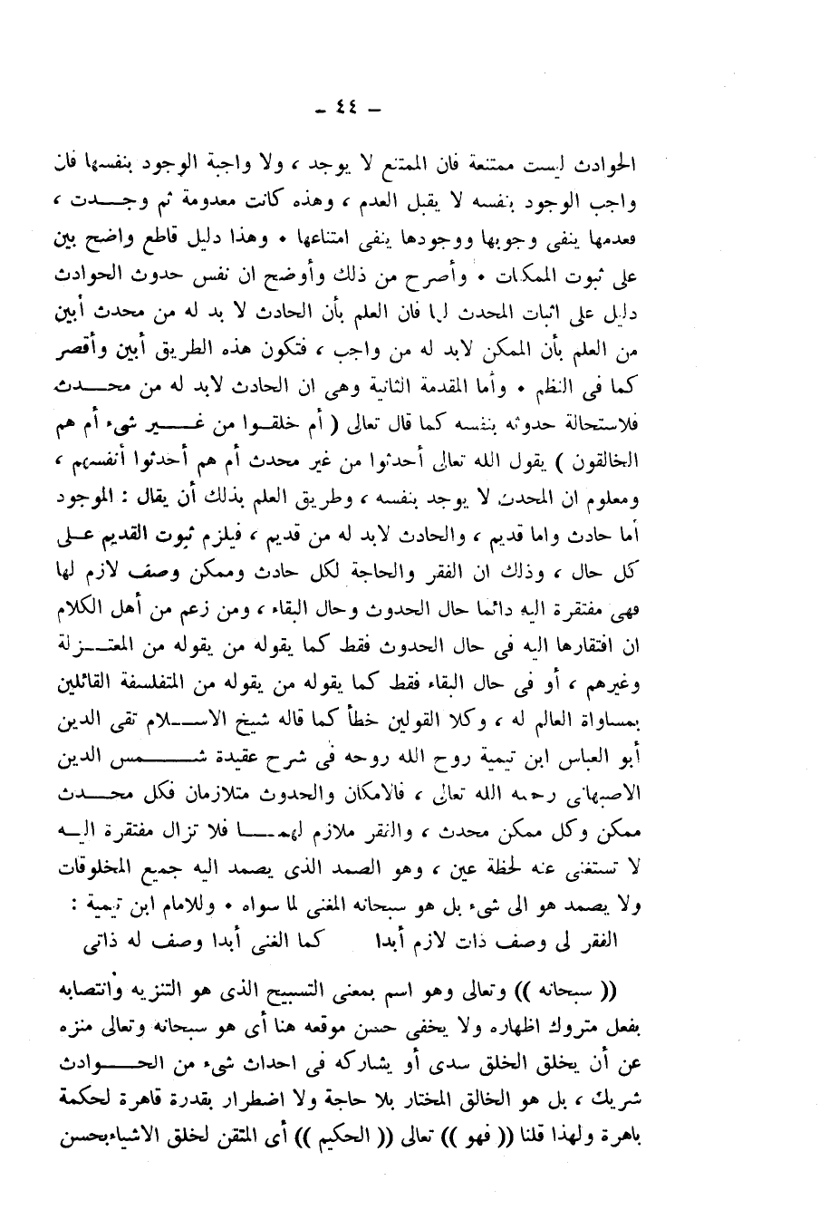 الْحَوَادِثُ لَيْسَتْ مُمْتَنِعَةً - فَإِنَّ الْمُمْتَنِعَ لَا يُوجَدُ - وَلَا وَاجِبَةَ الْوُجُودِ بِنَفْسِهَا - فَإِنَّ وَاجِبَ الْوُجُودِ بِنَفْسِهِ لَا يَقْبَلُ الْعَدَمَ - وَهَذِهِ كَانَتْ مَعْدُومَةً ثُمَّ وُجِدَتْ، فَعَدَمُهَا يَنْفِي وُجُودَهَا، وَوُجُودُهَا يَنْفِي امْتِنَاعَهَا. وَهَذَا دَلِيلٌ قَاطِعٌ وَاضِحٌ بَيِّنٌ عَلَى ثُبُوتِ الْمُمْكِنَاتِ. وَأَصْرَحُ مِنْ ذَلِكَ وَأَوْضَحُ أَنَّ نَفْسَ حُدُوثِ الْحَوَادِثِ دَلِيلٌ عَلَى إِثْبَاتِ الْمُحْدِثِ لَهَا، فَإِنَّ الْعِلْمَ بِأَنَّ الْحَادِثَ لَا بُدَّ لَهُ مِنْ مُحْدِثٍ أَبْيَنُ مِنَ الْعِلْمِ بِأَنَّ الْمُمْكِنَ لَا بُدَّ لَهُ مِنْ وَاجِبٍ، فَتَكُونُ هَذِهِ الطَّرِيقُ أَبْيَنَ وَأَقْصَرَ كَمَا فِي النَّظْمِ. وَأَمَّا الْمُقَدِّمَةُ الثَّانِيَةُ وَهِيَ أَنَّ الْحَادِثَ لَا بُدَّ لَهُ مِنْ مُحْدِثٍ فَلِاسْتِحَالَةِ حُدُوثِهِ بِنَفْسِهِ، كَمَا قَالَ - تَعَالَى: {أَمْ خُلِقُوا مِنْ غَيْرِ شَيْءٍ أَمْ هُمُ الْخَالِقُونَ} [الطور: 35] ، يَقُولُ اللَّهُ - تَعَالَى: أُحْدِثُوا مِنْ غَيْرِ مُحْدِثٍ أَمْ هُمْ أَحْدَثُوا أَنْفُسَهُمْ، وَمَعْلُومٌ أَنَّ الْمُحْدَثَ لَا يُوجَدُ بِنَفْسِهِ، وَطَرِيقُ الْعِلْمِ بِذَلِكَ أَنْ يُقَالَ: الْمَوْجُودُ إِمَّا حَادِثٌ وَإِمَّا قَدِيمٌ، وَالْحَادِثُ لَا بُدَّ لَهُ مِنْ قَدِيمٍ، فَيَلْزَمُ ثُبُوتُ الْقَدِيمِ عَلَى كُلِّ حَالٍ، وَذَلِكَ أَنَّ الْفَقْرَ وَالْحَاجَةَ لِكُلِّ حَادِثٍ وَمُمْكِنٍ وَصْفٌ لَازِمٌ لَهَا، فَهِيَ مُفْتَقِرَةٌ إِلَيْهِ دَائِمًا حَالَ الْحُدُوثِ وَحَالَ الْبَقَاءِ، وَمَنْ زَعَمَ مِنْ أَهْلِ الْكَلَامِ أَنَّ افْتِقَارَهَا إِلَيْهِ فِي حَالِ الْحُدُوثِ فَقَطْ، كَمَا يَقُولُهُ مَنْ يَقُولُهُ مِنَ الْمُعْتَزِلَةِ وَغَيْرِهِمْ، أَوْ فِي حَالِ الْبَقَاءِ فَقَطْ، كَمَا يَقُولُهُ مَنْ يَقُولُهُ مِنَ الْمُتَفَلْسِفَةِ الْقَائِلِينَ بِمُسَاوَاةِ الْعَالَمِ لَهُ، وَكِلَا الْقَوْلَيْنِ خَطَأٌ، كَمَا قَالَهُ شَيْخُ الْإِسْلَامِ تَقِيُّ الدِّينِ أَبُو الْعَبَّاسِ ابْنُ تَيْمِيَّةَ - رَوَّحَ اللَّهُ رُوحَهُ - فِي شَرْحِ عَقِيدَةِ شَمْسِ الدِّينِ الْأَصْبَهَانِيِّ - رَحِمَهُ اللَّهُ تَعَالَى، فَالْإِمْكَانُ وَالْحُدُوثُ مُتَلَازِمَانِ، فَكُلُّ مُحْدَثٍ مُمْكِنٌ، وَكُلُّ مُمْكِنٍ مُحْدَثٌ، وَالْفَقْرُ مُلَازِمٌ لَهُمَا، فَلَا تَزَالُ مُفْتَقِرَةً إِلَيْهِ، لَا تَسْتَغْنِي عَنْهُ لَحْظَةَ عَيْنٍ، وَهُوَ الصَّمَدُ الَّذِي يَصْمُدُ إِلَيْهِ جَمِيعُ الْمَخْلُوقَاتِ، وَلَا يَصْمُدُ هُوَ إِلَى شَيْءٍ، بَلْ هُوَ - سُبْحَانَهُ - الْمُغْنِي لِمَا سِوَاهُ. وَلِلْإِمَامِ ابْنِ تَيْمِيَّةَ: