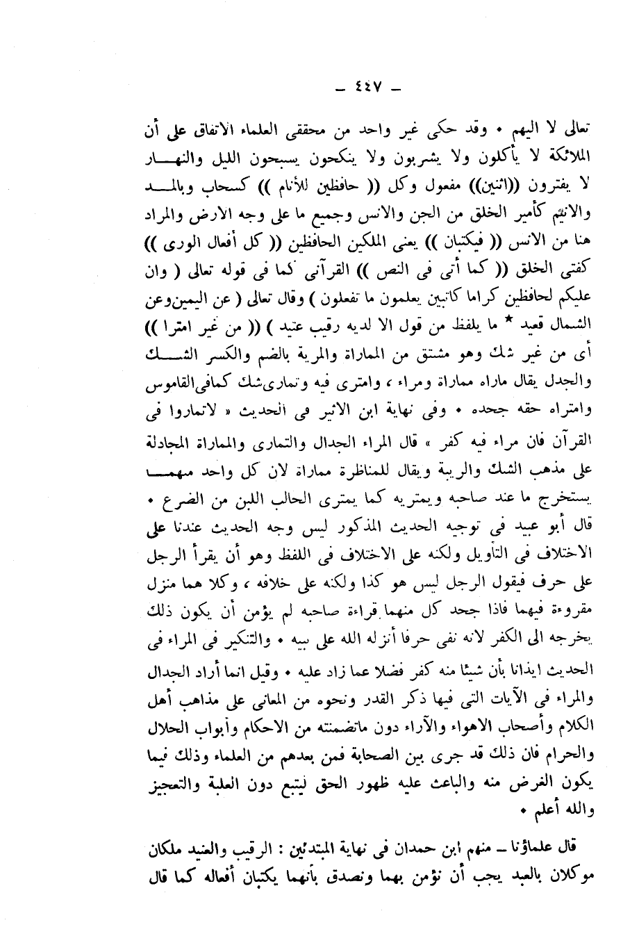 قَالَ عُلَمَاؤُنَا - مِنْهُمُ ابْنُ حَمْدَانَ فِي نِهَايَةِ الْمُبْتَدِئِينَ: الرَّقِيبُ وَالْعَتِيدُ مَلَكَانِ مُوَكَّلَانِ بِالْعَبْدِ يَجِبُ أَنْ نُؤْمِنَ بِهِمَا وَنُصَدِّقَ بِأَنَّهُمَا يَكْتُبَانِ أَفْعَالَهُ كَمَا قَالَ