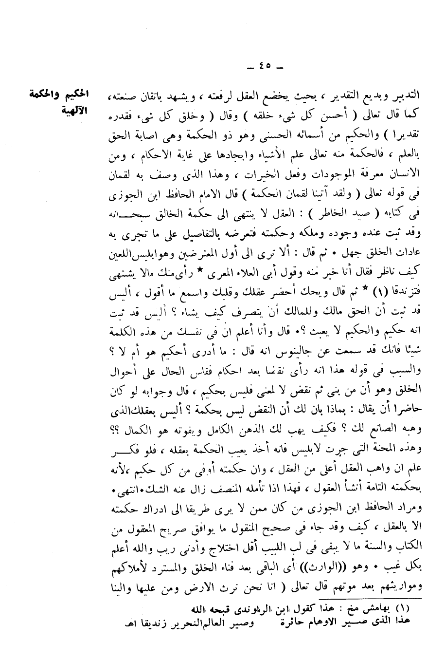 فَالْحِكْمَةُ مِنْهُ - تَعَالَى - عِلْمُ الْأَشْيَاءِ، وَإِيجَادُهَا عَلَى غَايَةِ الْإِحْكَامِ، وَمِنَ الْإِنْسَانِ مَعْرِفَةُ الْمَوْجُودَاتِ وَفِعْلُ الْخَيْرَاتِ، وَهَذَا الَّذِي وُصِفَ بِهِ لُقْمَانُ فِي قَوْلِهِ - تَعَالَى: {وَلَقَدْ آتَيْنَا لُقْمَانَ الْحِكْمَةَ} [لقمان: 12] . قَالَ الْإِمَامُ الْحَافِظُ ابْنُ الْجَوْزِيِّ فِي كِتَابِهِ (صَيْدِ الْخَاطِرِ) : الْعَقْلُ لَا يَنْتَهِي إِلَى حِكْمَةِ الْخَالِقِ - سُبْحَانَهُ - وَقَدْ ثَبَتَ عِنْدَهُ وُجُودُهُ وَمُلْكُهُ وَحِكْمَتُهُ، فَتَعَرُّضُهُ بِالتَّفَاصِيلِ عَلَى مَا تَجْرِي بِهِ عَادَاتُ الْخَلْقِ جَهْلٌ. ثُمَّ قَالَ: أَلَا تَرَى إِلَى أَوَّلِ الْمُعْتَرِضِينَ، وَهُوَ إِبْلِيسُ اللَّعِينُ، كَيْفَ نَاظَرَ فَقَالَ: أَنَا خَيْرٌ مِنْهُ. وَقَوْلُ أَبِي الْعَلَاءِ الْمَعَرِّي: