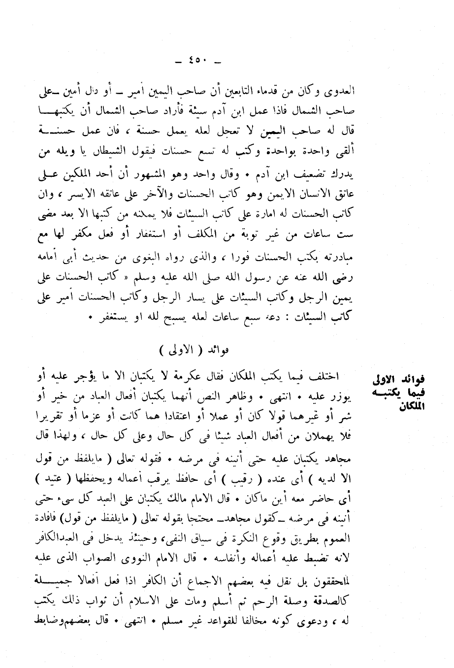 الْعَدَوِيِّ وَكَانَ مِنْ قُدَمَاءِ التَّابِعِينَ أَنَّ صَاحِبَ الْيَمِينِ أَمِيرٌ -، أَوْ قَالَ: أَمِينٌ - عَلَى صَاحِبِ الشِّمَالِ، فَإِذَا عَمِلَ ابْنُ آدَمَ سَيِّئَةً، قَالَ لَهُ صَاحِبُ الْيَمِينِ: لَا تَعْجَلْ لَعَلَّهُ يَعْمَلُ حَسَنَةً، فَإِنْ عَمِلَ حَسَنَةً أَلْقَى وَاحِدَةً بِوَاحِدَةٍ وَكَتَبَ لَهُ تِسْعَ حَسَنَاتٍ فَيَقُولُ الشَّيْطَانُ يَا وَيْلَهُ مَنْ يُدْرِكُ تَضْعِيفَ ابْنِ آدَمَ. وَقَالَ وَاحِدٌ وَهُوَ الْمَشْهُورُ: إِنَّ أَحَدَ الْمَلَكَيْنِ عَلَى عَاتِقِ الْإِنْسَانِ الْأَيْمَنِ، وَهُوَ كَاتِبُ الْحَسَنَاتِ، وَالْآخَرُ عَلَى عَاتِقِهِ الْأَيْسَرِ، وَإِنَّ كَاتِبَ الْحَسَنَاتِ لَهُ إِمَارَةٌ عَلَى كَاتِبِ السَّيِّئَاتِ، فَلَا يُمَكِّنُهُ مِنْ كَتْبِهَا إِلَّا بَعْدَ مُضِيِّ سِتِّ سَاعَاتٍ مِنْ غَيْرِ تَوْبَةٍ مِنَ الْمُكَلَّفِ أَوِ اسْتِغْفَارٍ، أَوْ فِعْلٍ مُكَفِّرٍ لَهَا، مَعَ مُبَادَرَتِهِ بِكَتْبِ الْحَسَنَاتِ فَوْرًا، وَالَّذِي رَوَاهُ الْبَغَوِيُّ مِنْ حَدِيثِ أَبِي أُمَامَةَ - رَضِيَ اللَّهُ عَنْهُ - عَنْ رَسُولِ اللَّهِ - صَلَّى اللَّهُ عَلَيْهِ وَسَلَّمَ - " «كَاتِبُ الْحَسَنَاتِ عَلَى يَمِينِ الرَّجُلِ، وَكَاتِبُ السَّيِّئَاتِ عَلَى يَسَارِ الرَّجُلِ، وَكَاتِبُ الْحَسَنَاتِ أَمِيرٌ عَلَى كَاتِبِ السَّيِّئَاتِ: دَعْهُ سَبْعَ سَاعَاتٍ لَعَلَّهُ يُسَبِّحُ لِلَّهِ، أَوْ يَسْتَغْفِرُ» .