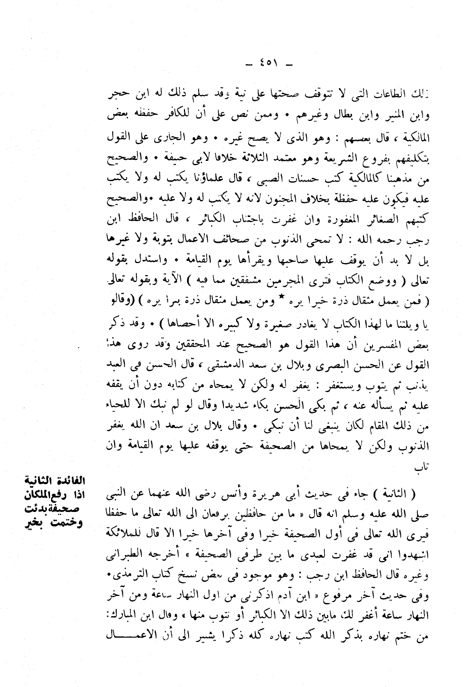 الثَّانِيَةُ: جَاءَ فِي حَدِيثِ أَبِي هُرَيْرَةَ وَأَنَسٍ - رَضِيَ اللَّهُ عَنْهُمَا - عَنِ النَّبِيِّ - صَلَّى اللَّهُ عَلَيْهِ وَسَلَّمَ - أَنَّهُ قَالَ: " «مَا مِنْ حَافِظَيْنِ يَرْفَعَانِ إِلَى اللَّهِ - تَعَالَى - مَا حَفِظَا فَيَرَى اللَّهُ - تَعَالَى - فِي أَوَّلِ الصَّحِيفَةِ خَيْرًا، وَفِي آخِرِهَا خَيْرًا إِلَّا قَالَ لِلْمَلَائِكَةِ: اشْهَدُوا أَنِّي قَدْ غَفَرْتُ لِعَبْدِي مَا بَيْنَ طَرَفَيِ الصَّحِيفَةِ» " أَخْرَجَهُ الطَّبَرَانِيُّ وَغَيْرُهُ، قَالَ الْحَافِظُ ابْنُ رَجَبٍ: وَهُوَ مَوْجُودٌ فِي بَعْضِ نُسَخِ كِتَابِ التِّرْمِذِيِّ. وَفِي حَدِيثٍ آخَرَ مَرْفُوعٍ: " «ابْنَ آدَمَ اذْكُرْنِي مِنْ أَوَّلِ النَّهَارِ سَاعَةً، وَمِنْ آخِرِ النَّهَارِ سَاعَةً أَغْفِرْ لَكَ مَا بَيْنَ ذَلِكَ إِلَّا الْكَبَائِرَ، أَوْ تَتُوبُ مِنْهَا» " وَقَالَ ابْنُ الْمُبَارَكِ: مَنْ خَتَمَ نَهَارَهُ بِذِكْرِ اللَّهِ كُتِبَ نَهَارُهُ كُلُّهُ ذِكْرًا، يُشِيرُ إِلَى أَنَّ الْأَعْمَالَ