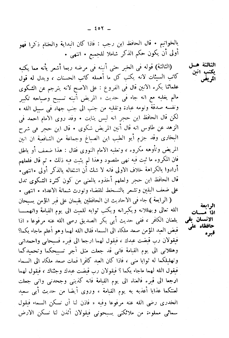 الثَّالِثَةُ: قَوْلُهُ فِي الْخَبَرِ: حَتَّى أَنِينَهُ فِي مَرَضِهِ، رُبَّمَا أَشْعَرَ بِأَنَّهُ مِمَّا يَكْتُبُهُ كَاتِبُ السَّيِّئَاتِ ; لِأَنَّهُ يَكْتُبُ كُلَّ مَا أَهْمَلَ كَاتِبُ الْحَسَنَاتِ، وَيَدُلُّ لَهُ قَوْلُ عُلَمَائِنَا يُكْرَهُ الْأَنِينُ، قَالَ فِي الْفُرُوعِ: عَلَى الْأَصَحِّ لِأَنَّهُ يُتَرْجِمُ عَنِ الشَّكْوَى، مَا لَمْ يَغْلِبْهُ، مَعَ أَنَّهُ جَاءَ فِي الْحَدِيثِ " «الْمَرِيضُ أَنِينُهُ تَسْبِيحٌ وَصِيَاحُهُ تَكْبِيرٌ، وَنَفَسُهُ صَدَقَةٌ، وَنَوْمُهُ عِبَادَةٌ، وَتَقَلُّبٌ مِنْ جَنْبٍ إِلَى جَنْبٍ جِهَادٌ فِي سَبِيلِ اللَّهِ» " لَكِنْ قَالَ الْحَافِظُ ابْنُ حَجَرٍ: إِنَّهُ لَيْسَ بِثَابِتٍ. وَقَدْ رَوَى الْإِمَامُ أَحْمَدُ فِي الزُّهْدِ عَنْ طَاوُسٍ أَنَّهُ قَالَ: أَنِينُ الْمَرِيضِ شَكْوَى. قَالَ ابْنُ حَجَرٍ فِي شَرْحِ الْبُخَارِيِّ: وَقَدْ جَزَمَ أَبُو الطَّيِّبِ ابْنُ الصَّبَّاغِ وَجَمَاعَةٌ مِنَ الشَّافِعِيَّةِ أَنَّ أَنِينَ الْمَرِيضِ مَكْرُوهٌ، وَتَأَوُّهَهُ مَكْرُوهٌ. وَتَعَقَّبَهُ الْإِمَامُ النَّوَوِيُّ فَقَالَ: هَذَا ضَعِيفٌ، أَوْ بَاطِلٌ، فَإِنَّ الْمَكْرُوهَ مَا ثَبَتَ فِيهِ نَهْيٌ مَقْصُودٌ، وَهَذَا لَمْ يَثْبُتْ فِيهِ ذَلِكَ. ثُمَّ قَالَ: فَلَعَلَّهُمْ أَرَادُوا بِالْكَرَاهِيَةِ خِلَافَ الْأَوْلَى، فَإِنَّهُ لَا شَكَّ أَنَّ اشْتِغَالَهُ بِالذِّكْرِ أَوْلَى. انْتَهَى.