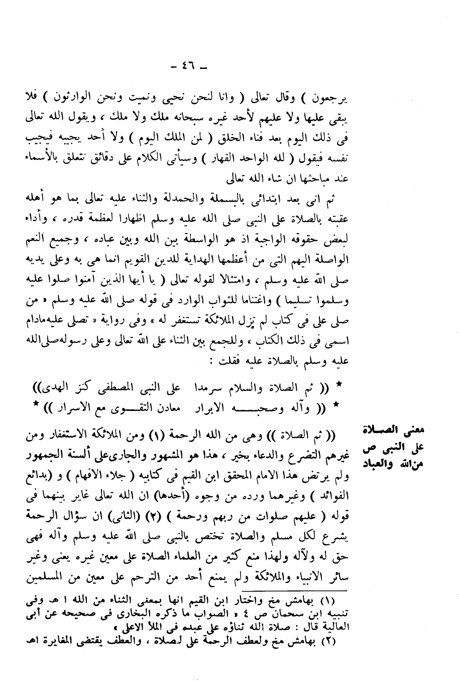 ثُمَّ إِنِّي بَعْدَ ابْتِدَائِي بِالْبَسْمَلَةِ وَالْحَمْدَلَةِ، وَالثَّنَاءِ عَلَيْهِ - تَعَالَى - بِمَا هُوَ أَهْلُهُ، عَقَّبْتُهُ بِالصَّلَاةِ عَلَى النَّبِيِّ - صَلَّى اللَّهُ عَلَيْهِ وَسَلَّمَ - إِظْهَارًا لِعَظَمَةِ قَدْرِهِ، وَأَدَاءً لِبَعْضِ حُقُوقِهِ الْوَاجِبَةِ، إِذْ هُوَ الْوَاسِطَةُ بَيْنَ اللَّهِ وَبَيْنَ عِبَادِهِ، وَجَمِيعُ النِّعَمِ الْوَاصِلَةِ إِلَيْهِمُ الَّتِي مِنْ أَعْظَمِهَا الْهِدَايَةُ لِلدِّينِ الْقَوِيمِ إِنَّمَا هِيَ بِهِ وَعَلَى يَدَيْهِ - صَلَّى اللَّهُ عَلَيْهِ وَسَلَّمَ، وَامْتِثَالًا لِقَوْلِهِ - تَعَالَى: {يَاأَيُّهَا الَّذِينَ آمَنُوا صَلُّوا عَلَيْهِ وَسَلِّمُوا تَسْلِيمًا} [الأحزاب: 56] ، وَاغْتِنَامًا لِلثَّوَابِ الْوَارِدِ فِي قَوْلِهِ - صَلَّى اللَّهُ عَلَيْهِ وَسَلَّمَ: " «مَنْ صَلَّى عَلَيَّ فِي كِتَابٍ، لَمْ تَزَلِ الْمَلَائِكَةُ تَسْتَغْفِرُ لَهُ ". وَفِي رِوَايَةٍ: تُصَلِّي عَلَيْهِ مَا دَامَ اسْمِي فِي ذَلِكَ الْكِتَابِ» ". وَلِلْجَمْعِ بَيْنَ الثَّنَاءِ عَلَى اللَّهِ - تَعَالَى - وَعَلَى رَسُولِهِ - صَلَّى اللَّهُ عَلَيْهِ وَسَلَّمَ - بِالصَّلَاةِ عَلَيْهِ، فَقُلْتُ: