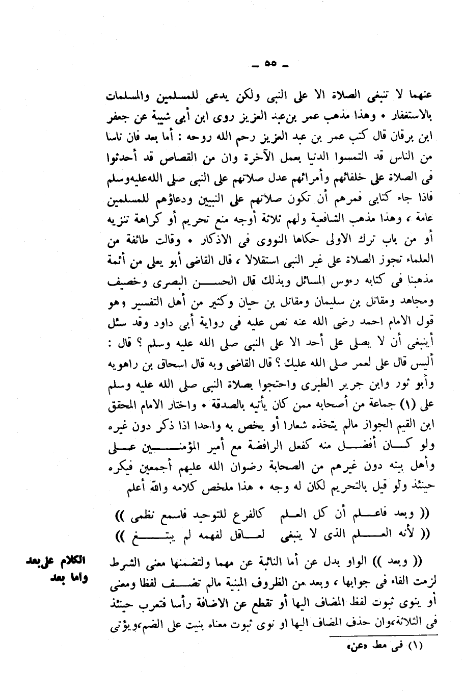 وَقَالَتْ طَائِفَةٌ مِنَ الْعُلَمَاءِ: تَجُوزُ الصَّلَاةُ عَلَى غَيْرِ النَّبِيِّ اسْتِقْلَالًا، قَالَ الْقَاضِي أَبُو يَعْلَى - مِنْ أَئِمَّةِ مَذْهَبِنَا - فِي كِتَابِهِ رُءُوسِ الْمَسَائِلِ: وَبِذَلِكَ قَالَ الْحَسَنُ الْبَصْرِيُّ، وَخُصَيْفٌ، وَمُجَاهِدٌ، وَمُقَاتِلُ بْنُ سُلَيْمَانَ، وَمُقَاتِلُ بْنُ حَيَّانَ، وَكَثِيرٌ مِنْ أَهْلِ التَّفْسِيرِ، وَهُوَ قَوْلُ الْإِمَامِ أَحْمَدَ - رَضِيَ اللَّهُ عَنْهُ، نَصَّ عَلَيْهِ فِي رِوَايَةِ أَبِي دَاوُدَ، وَقَدْ سُئِلَ: أَيَنْبَغِي أَنْ لَا يُصَلَّى عَلَى أَحَدٍ إِلَّا عَلَى النَّبِيِّ - صَلَّى اللَّهُ عَلَيْهِ وَسَلَّمَ؟ قَالَ: أَلَيْسَ قَالَ عَلِيٌّ لِعُمَرَ: صَلَّى اللَّهُ عَلَيْكَ؟ قَالَ الْقَاضِي، وَبِهِ قَالَ إِسْحَاقُ بْنُ رَاهَوَيْهِ، وَأَبُو ثَوْرٍ، وَابْنُ جَرِيرٍ الطَّبَرِيُّ، وَاحْتَجُّوا بِصَلَاةِ النَّبِيِّ - صَلَّى اللَّهُ عَلَيْهِ وَسَلَّمَ - عَلَى جَمَاعَةٍ مِنْ أَصْحَابِهِ مِمَّنْ كَانَ يَأْتِيهِ بِالصَّدَقَةِ. وَاخْتَارَ الْإِمَامُ الْمُحَقِّقُ ابْنُ الْقَيِّمُ الْجَوَازَ، مَا لَمْ يَتَّخِذْهُ شِعَارًا أَوْ يَخُصَّ بِهِ وَاحِدًا إِذَا ذُكِرَ دُونَ غَيْرِهِ، وَلَوْ كَانَ أَفْضَلَ مِنْهُ، كَفِعْلِ الرَّافِضَةِ مَعَ أَمِيرِ الْمُؤْمِنِينَ عَلِيٍّ وَأَهْلِ بَيْتِهِ دُونَ غَيْرِهِمْ مِنَ الصَّحَابَةِ - رِضْوَانُ اللَّهِ عَلَيْهِمْ - أَجْمَعِينَ، فَيُكْرَهُ حِينَئِذٍ، وَلَوْ قِيلَ بِالتَّحْرِيمِ، لَكَانَ لَهُ وَجْهٌ. هَذَا مُلَخَّصُ كَلَامِهِ، وَاللَّهُ أَعْلَمُ.