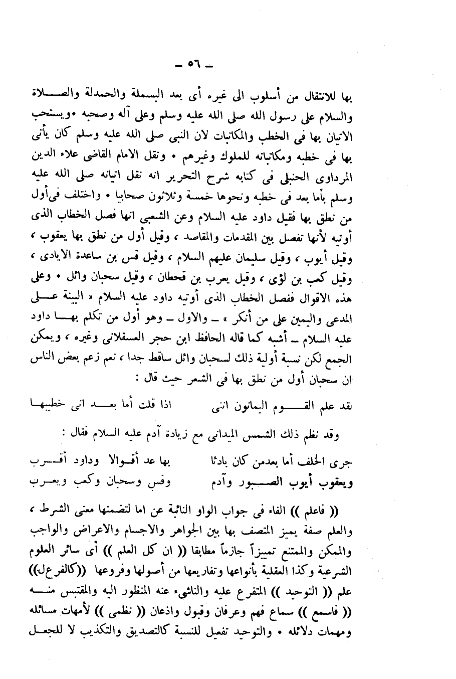 وَعَلَى هَذِهِ الْأَقْوَالِ فَفَصْلُ الْخِطَابِ الَّذِي أُوتِيَهُ دَاوُدُ - عَلَيْهِ السَّلَامُ: " الْبَيِّنَةُ عَلَى الْمُدَّعِي، وَالْيَمِينُ عَلَى مَنْ أَنْكَرَ ". وَالْأَوَّلُ وَهُوَ أَوَّلُ مَنْ تَكَلَّمَ بِهَا دَاوُدُ - عَلَيْهِ السَّلَامُ - أَشْبَهُ، كَمَا قَالَهُ الْحَافِظُ ابْنُ حَجَرٍ الْعَسْقَلَانِيُّ وَغَيْرُهُ، وَيُمْكِنُ الْجَمْعُ لَكِنَّ نِسْبَةَ أَوَّلِيَّةِ ذَلِكَ لِسَحْبَانَ وَائِلٍ سَاقِطٌ جِدًّا. نَعَمْ، زَعَمَ بَعْضُ النَّاسِ أَنَّ سَحْبَانَ أَوَّلُ مَنْ نَطَقَ بِهَا فِي الشِّعْرِ، حَيْثُ قَالَ: