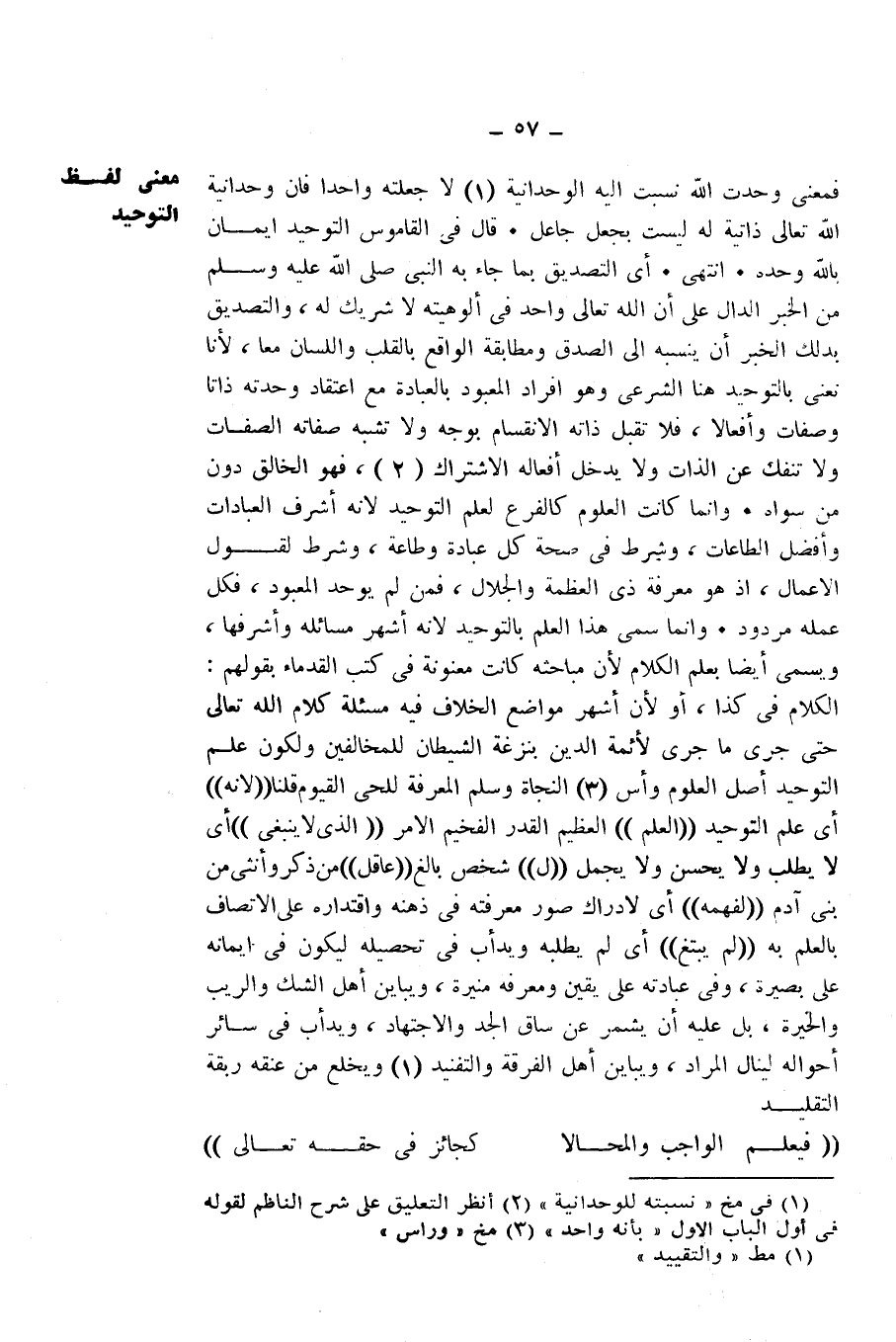 وَالتَّصْدِيقُ بِذَلِكَ الْخَبَرِ أَنْ يَنْسُبَهُ إِلَى الصِّدْقِ وَمُطَابَقَةِ الْوَاقِعِ بِالْقَلْبِ وَاللِّسَانِ مَعًا، لِأَنَّا نَعْنِي بِالتَّوْحِيدِ هُنَا الشَّرْعِيَّ، وَهُوَ إِفْرَادُ الْمَعْبُودِ بِالْعِبَادَةِ مَعَ اعْتِقَادِ وَحْدَتِهِ ذَاتًا وَصِفَاتٍ وَأَفْعَالًا، فَلَا تَقْبَلُ ذَاتُهُ الِانْقِسَامَ بِوَجْهٍ، وَلَا تُشْبِهُ صِفَاتُهُ الصِّفَاتِ وَلَا تَنْفَكُّ عَنِ الذَّاتِ، وَلَا يَدْخُلُ أَفْعَالَهُ الِاشْتِرَاكُ، فَهُوَ الْخَالِقُ دُونَ مَنْ سِوَاهُ. وَإِنَّمَا كَانَتِ الْعُلُومُ كَالْفَرْعِ لِعِلْمِ التَّوْحِيدِ ; لِأَنَّهُ أَشْرَفُ الْعِبَادَاتِ وَأَفْضَلُ الطَّاعَاتِ، وَشَرْطٌ فِي صِحَّةِ كُلِّ عِبَادَةٍ وَطَاعَةٍ، وَشَرْطٌ لِقَبُولِ الْأَعْمَالِ، إِذْ هُوَ مَعْرِفَةُ ذِي الْعَظَمَةِ وَالْجَلَالِ، فَمَنْ لَمْ يُوَحِّدِ الْمَعْبُودَ، فَكُلُّ عَمَلِهِ مَرْدُودٌ. وَإِنَّمَا سُمِّيَ هَذَا الْعِلْمُ بِالتَّوْحِيدِ ; لِأَنَّهُ أَشْهَرُ مَسَائِلِهِ وَأَشْرَفُهَا، وَيُسَمَّى أَيْضًا بِعِلْمِ الْكَلَامِ ; لِأَنَّ مَبَاحِثَهُ كَانَتْ مُعَنْوَنَةً فِي كُتُبِ الْقُدَمَاءِ بِقَوْلِهِمْ: الْكَلَامُ فِي كَذَا، أَوْ لِأَنَّ أَشْهَرَ مَوَاضِعِ الْخِلَافِ فِيهِ مَسْأَلَةُ كَلَامِ اللَّهِ - تَعَالَى - حَتَّى جَرَى مَا جَرَى لِأَئِمَّةِ الدِّينِ بِنَزْغَةِ الشَّيْطَانِ لِلْمُخَالِفِينَ، وَلِكَوْنِ عِلْمِ التَّوْحِيدِ أَصْلَ الْعُلُومِ وَأُسَّ النَّجَاةِ، وَسُلَّمَ الْمَعْرِفَةِ لِلْحَيِّ الْقَيُّومِ، قُلْنَا: (لِأَنَّهُ) أَيْ عِلْمَ التَّوْحِيدِ (الْعِلْمُ) الْعَظِيمُ الْقَدْرِ الْفَخِيمُ الْأَمْرِ " الَّذِي لَا يَنْبَغِي " أَيْ لَا يُطْلَبُ وَلَا يَحْسُنُ وَلَا يَجْمُلُ (لِـ) شَخْصٍ بَالِغٍ (عَاقِلٍ) مِنْ ذَكَرٍ وَأُنْثَى مِنْ بَنِي آدَمَ (لِفَهْمِهِ) أَيْ لِإِدْرَاكِ صُوَرِ مَعْرِفَتِهِ فِي ذِهْنِهِ، وَاقْتِدَارِهِ عَلَى الِاتِّصَافِ بِالْعِلْمِ بِهِ (لَمْ يَبْتَغِ) أَيْ لَمْ يَطْلُبْهُ، وَيَدْأَبْ فِي تَحْصِيلِهِ لِيَكُونَ فِي إِيمَانِهِ عَلَى بَصِيرَةٍ، وَفِي عِبَادَتِهِ عَلَى يَقِينٍ وَمَعْرِفَةٍ مُنِيرَةٍ، وَيُبَايِنَ أَهْلَ الشَّكِّ وَالرَّيْبِ وَالْحَيْرَةِ، بَلْ عَلَيْهِ أَنْ يُشَمِّرَ عَنْ سَاقِ الْجِدِّ وَالِاجْتِهَادِ، وَيَدْأَبَ فِي سَائِرِ أَحْوَالِهِ لِيَنَالَ الْمُرَادَ، وَيُبَايِنَ أَهْلَ الْفُرْقَةِ وَالتَّفْنِيدِ، وَيَخْلَعَ مِنْ عُنُقِهِ رِبْقَةَ التَّقْلِيدِ.