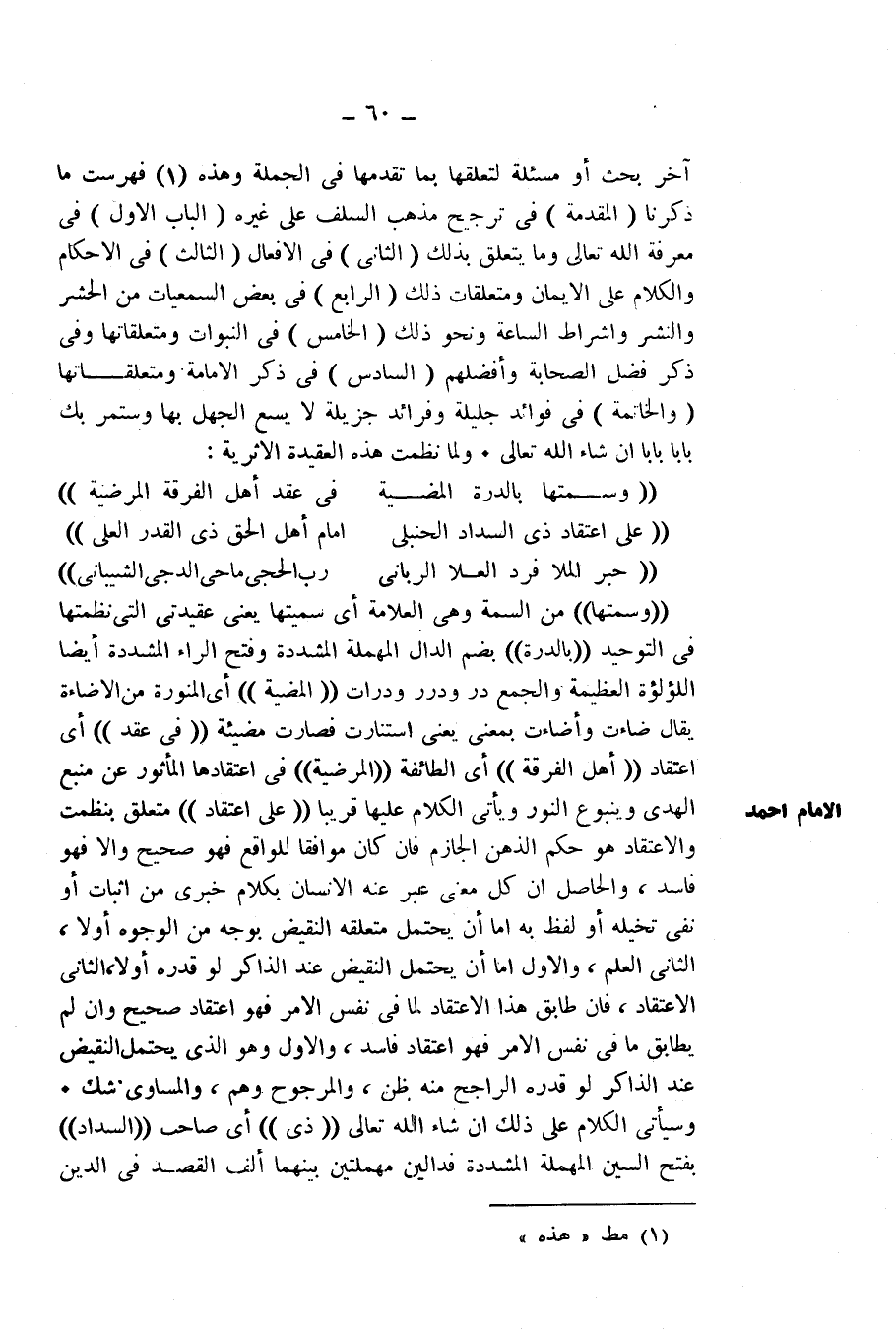 آخِرِ بَحْثٍ أَوْ مَسْأَلَةٍ لِتَعَلُّقِهَا بِمَا تَقَدَّمَهَا فِي الْجُمْلَةِ، وَهَذِهِ فِهْرِسْتُ مَا ذَكَرْنَا، (الْمُقَدِّمَةُ) فِي تَرْجِيحِ مَذْهَبِ السَّلَفِ عَلَى غَيْرِهِ (الْبَابُ الْأَوَّلُ) فِي مَعْرِفَةِ اللَّهِ - تَعَالَى - وَمَا يَتَعَلَّقُ بِذَلِكَ، (الثَّانِي) فِي الْأَفْعَالِ، (الثَّالِثُ) فِي الْأَحْكَامِ وَالْكَلَامِ عَلَى الْإِيمَانِ وَمُتَعَلِّقَاتِ ذَلِكَ، (الرَّابِعُ) فِي بَعْضِ السَّمْعِيَّاتِ مِنَ الْحَشْرِ وَالنَّشْرِ وَأَشْرَاطِ السَّاعَةِ وَنَحْوِ ذَلِكَ، (الْخَامِسُ) فِي النُّبُوَّاتِ وَمُتَعَلِّقَاتِهَا، وَفِي ذِكْرِ فَضْلِ الصَّحَابَةِ وَأَفْضَلِهِمْ، (السَّادِسُ) فِي ذِكْرِ الْإِمَامَةِ وَمُتَعَلِّقَاتِهَا، (وَالْخَاتِمَةُ) فِي فَوَائِدَ جَلِيلَةٍ، وَفَرَائِدَ جَزِيلَةٍ، لَا يَسَعُ الْجَهْلُ بِهَا، وَسَتَمُرُّ بِكَ بَابًا بَابًا إِنْ شَاءَ اللَّهُ - تَعَالَى. وَلَمَّا نَظَمْتُ هَذِهِ الْعَقِيدَةَ الْأَثَرِيَّةَ: